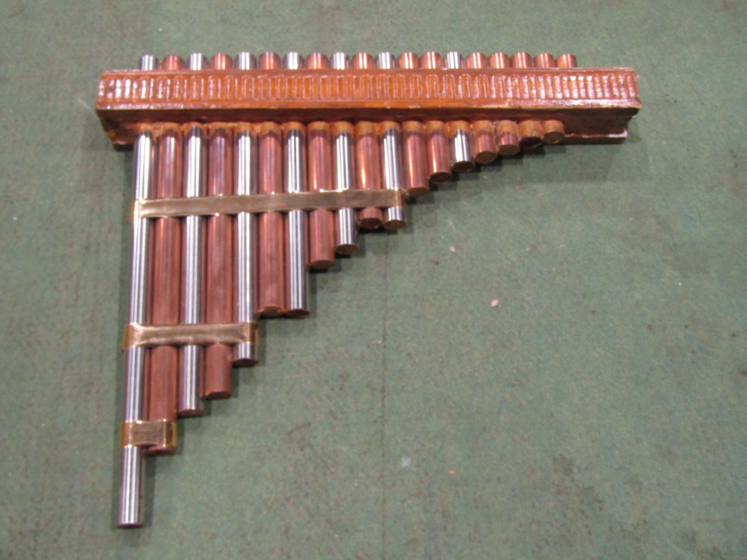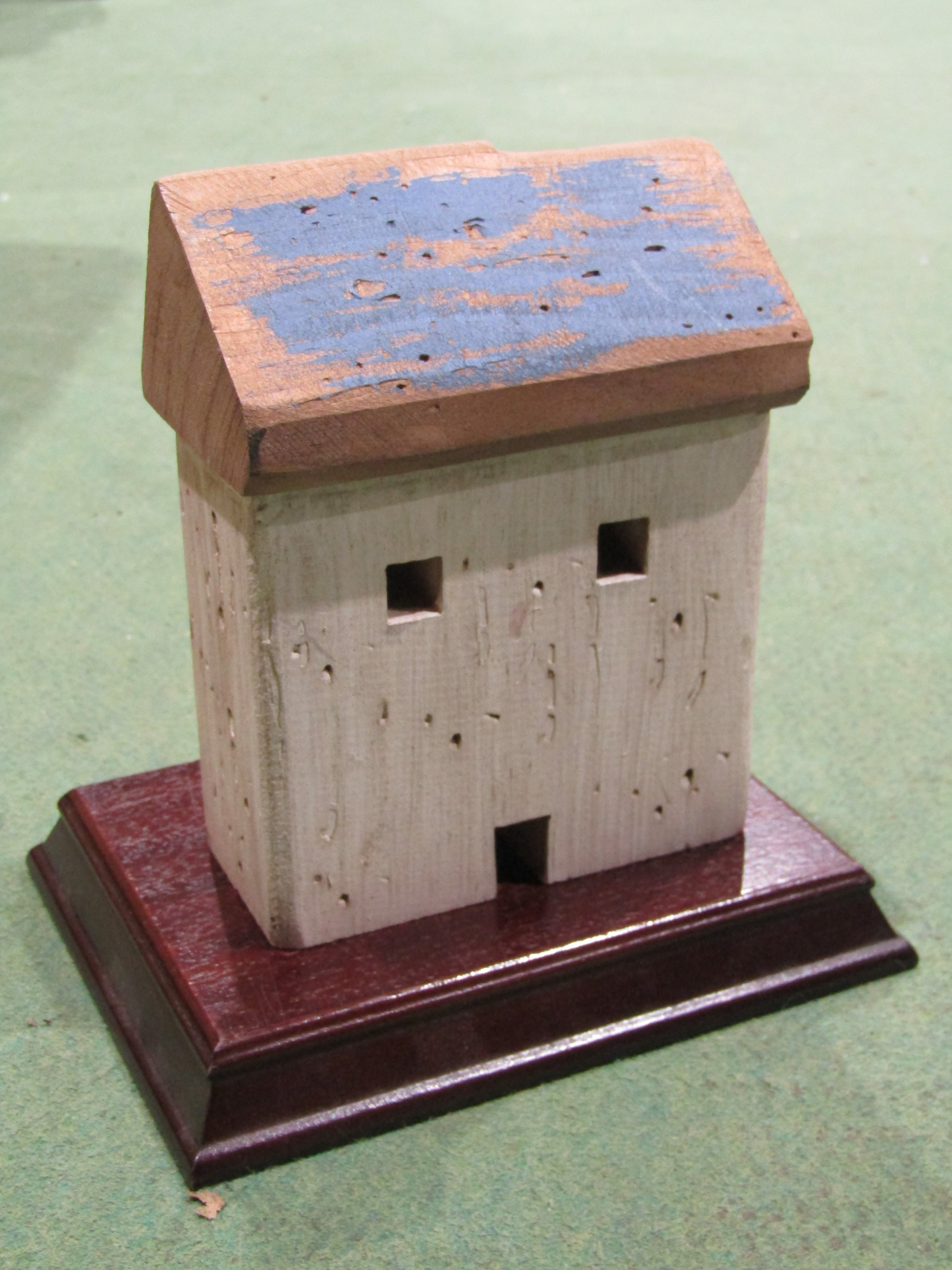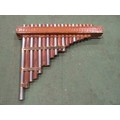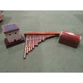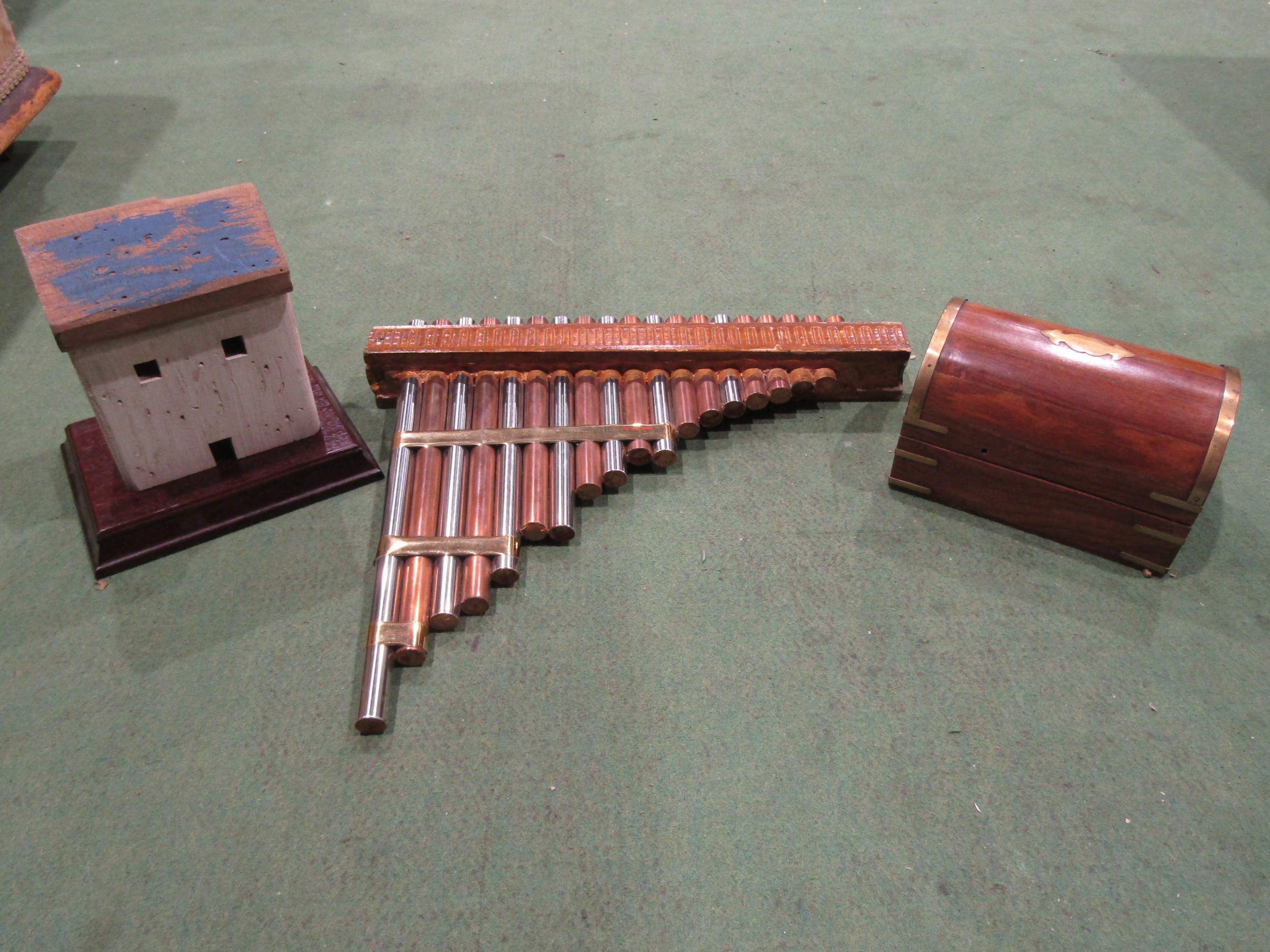 Pan pipes, treen chest trinket box and wooden model house (3)