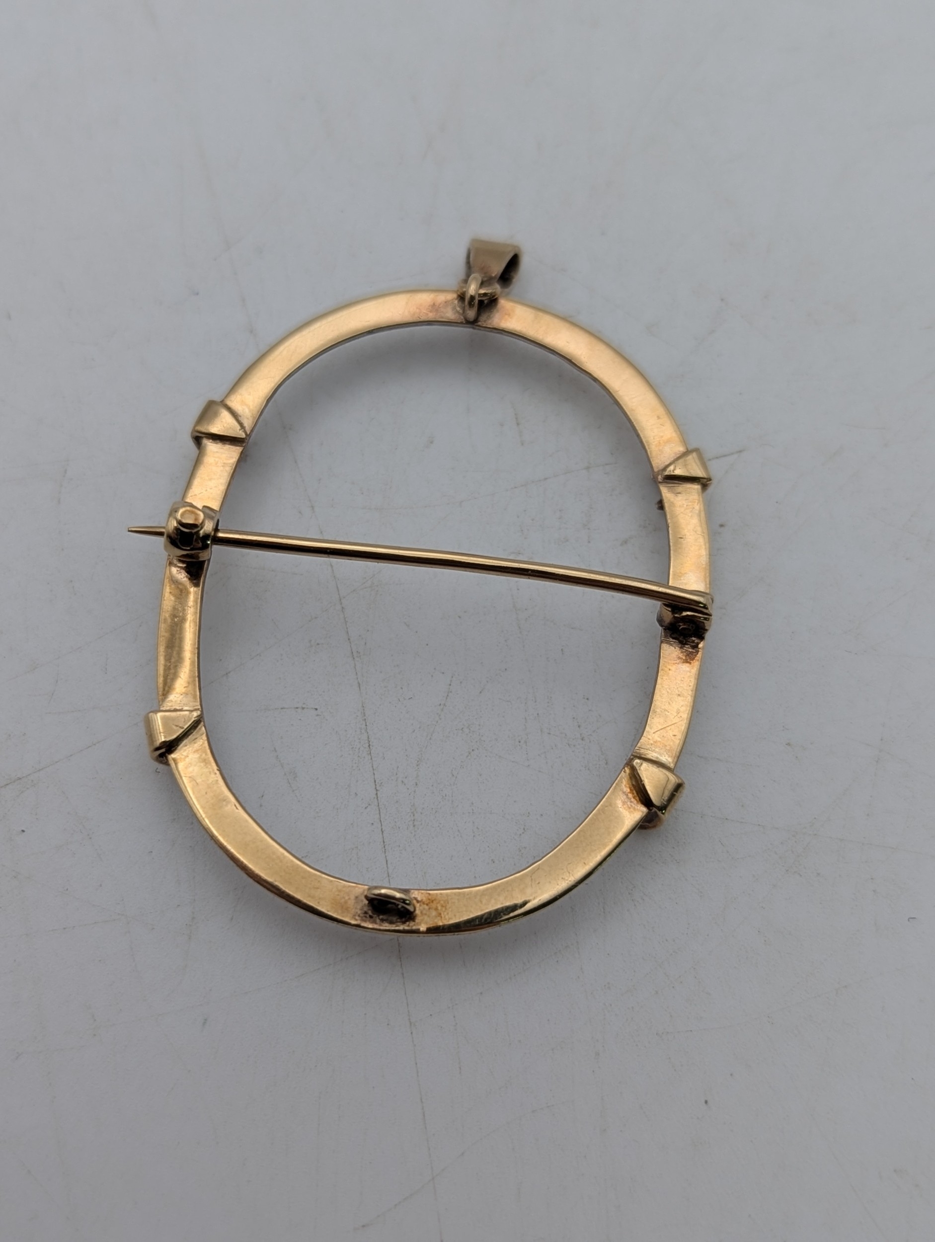 A yellow metal brooch/pendant, framed tested as 9ct gold having four prongs and suspension loop in oval form, 4.6g