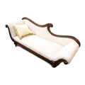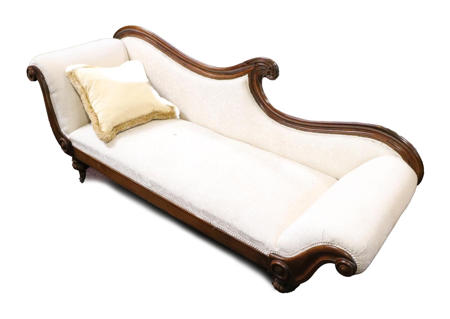 A late William IV mahogany Chaise Longue, the shaped back with a leaf scroll and a scroll shaped head and foot end, raised on reeded bun legs, covered in attractive beige fabric, 80" (202cms). (1)