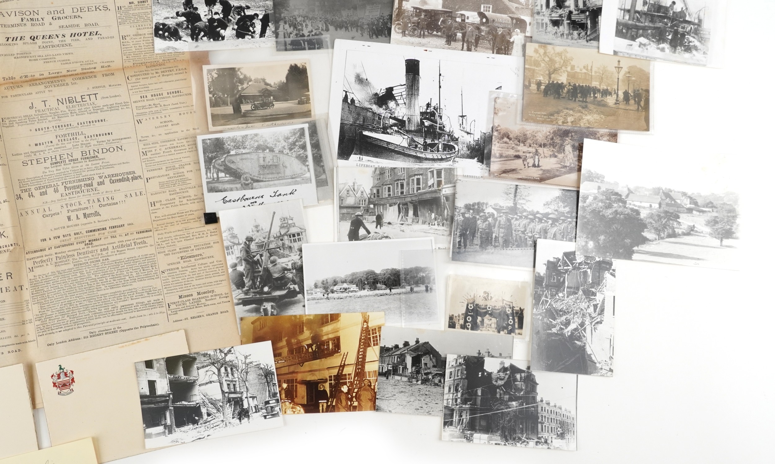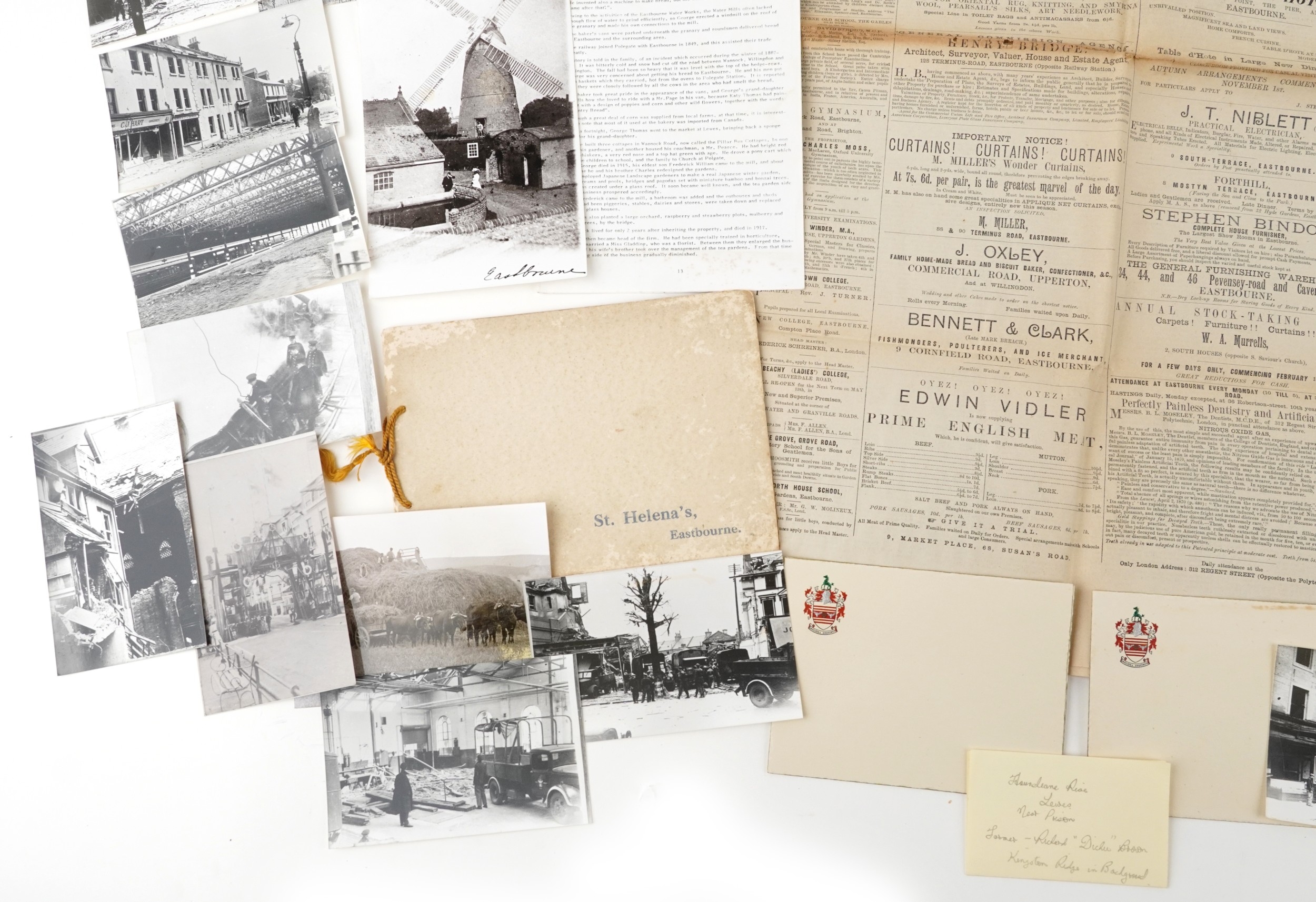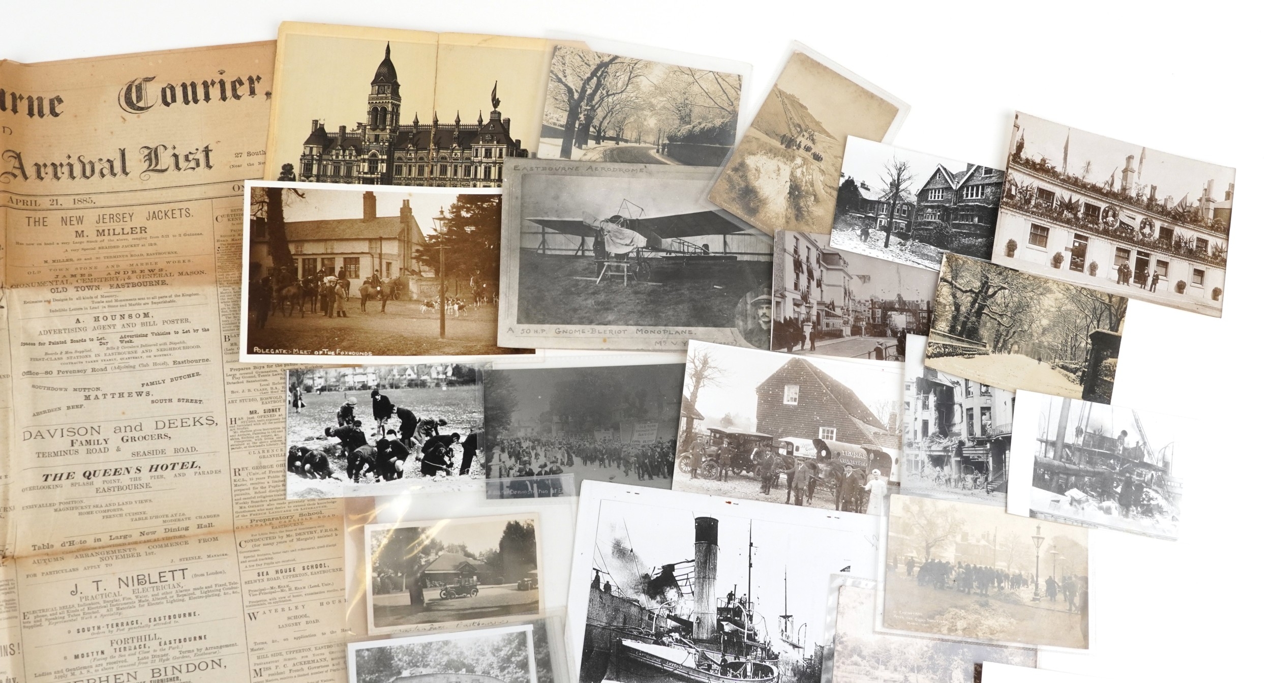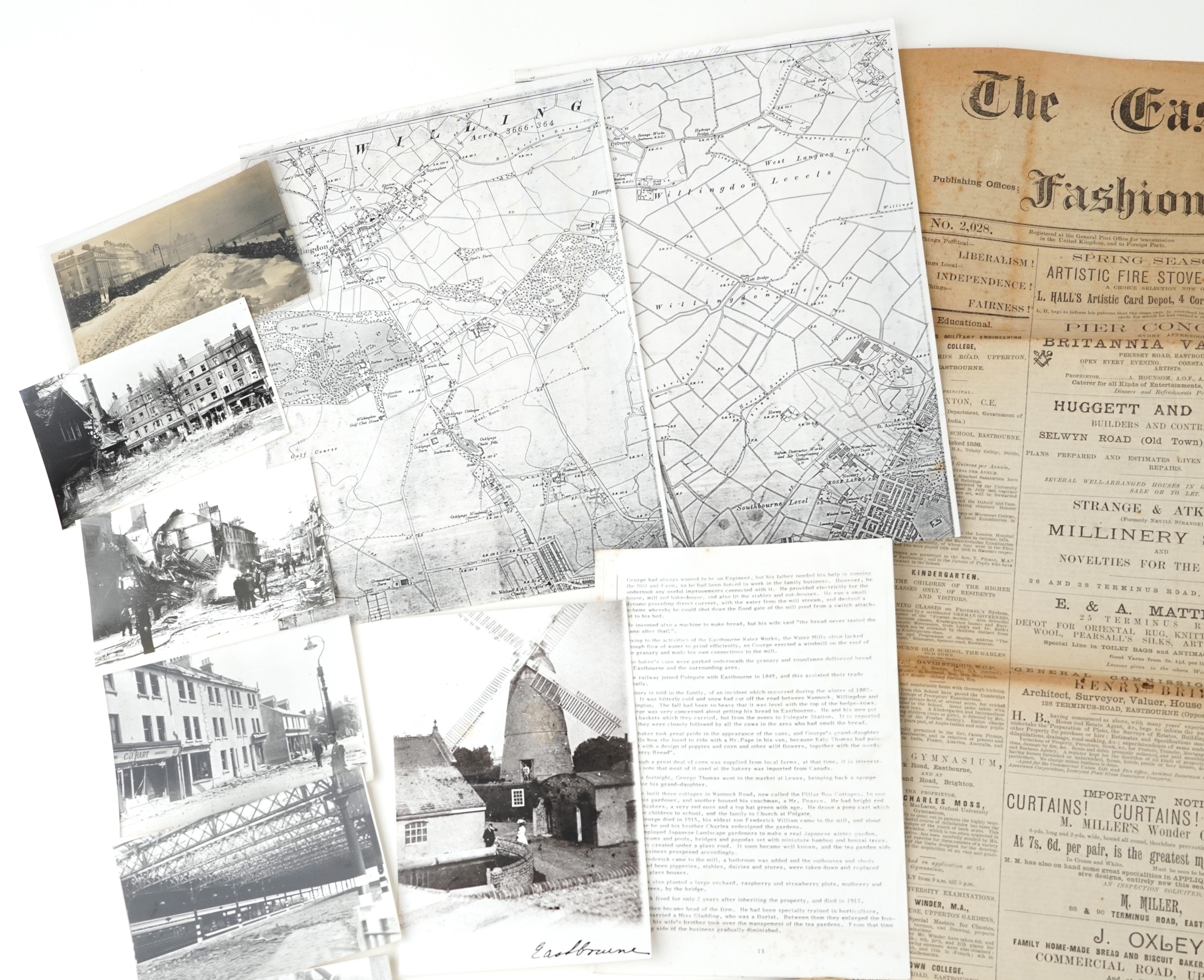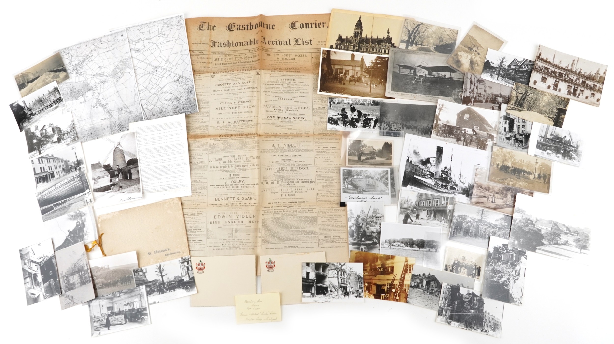 Eastbourne related ephemera including postcards and reprinted photographs of World War II damage to buildings, After the Great Snow Storm March 1909, The Eastbourne Courier and Fashionable Arrivals Listing Newspaper dated April 21st 1885.