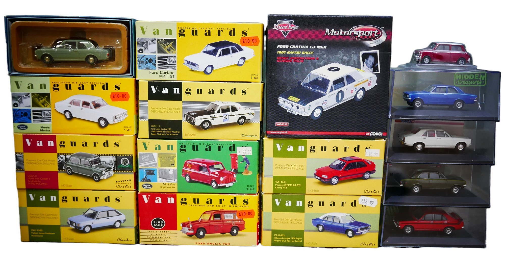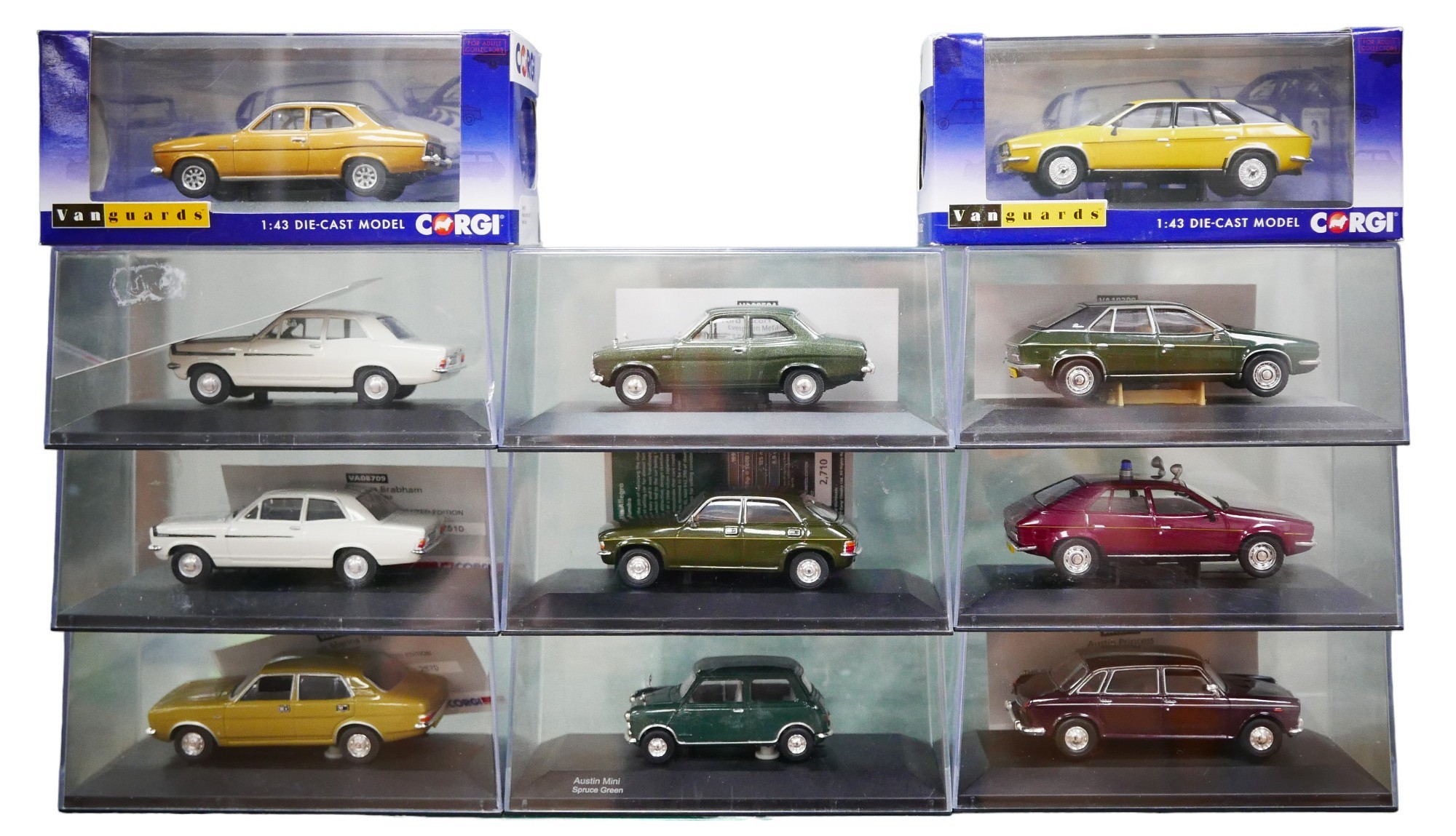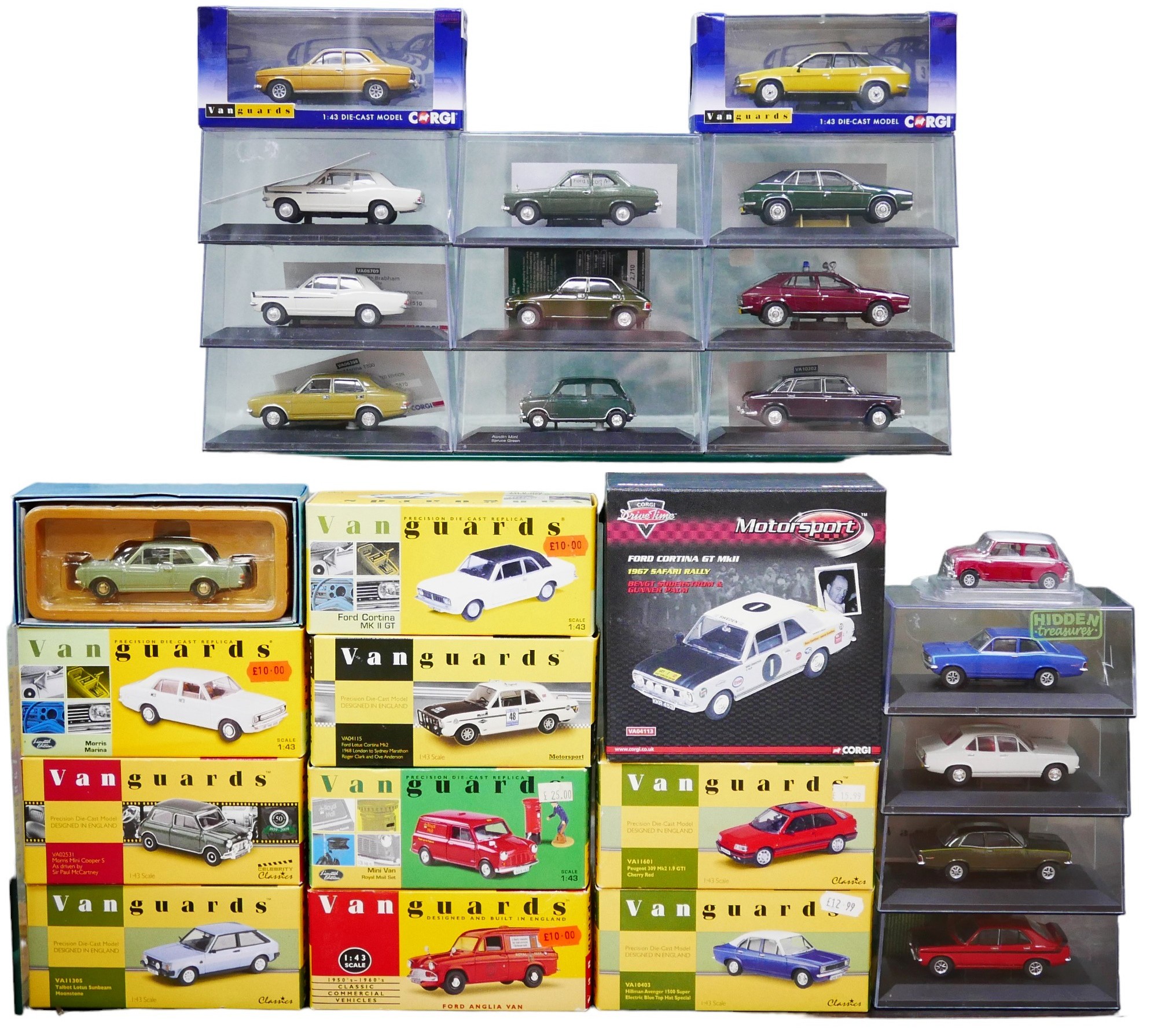 A collection of twenty-seven Corgi and Lledo Vanguards model cars, including Hillman Avengers, Leyland Princesses, Ford Cortinas (one 1967 Safari Rally), and Minis. (1 bag)