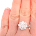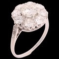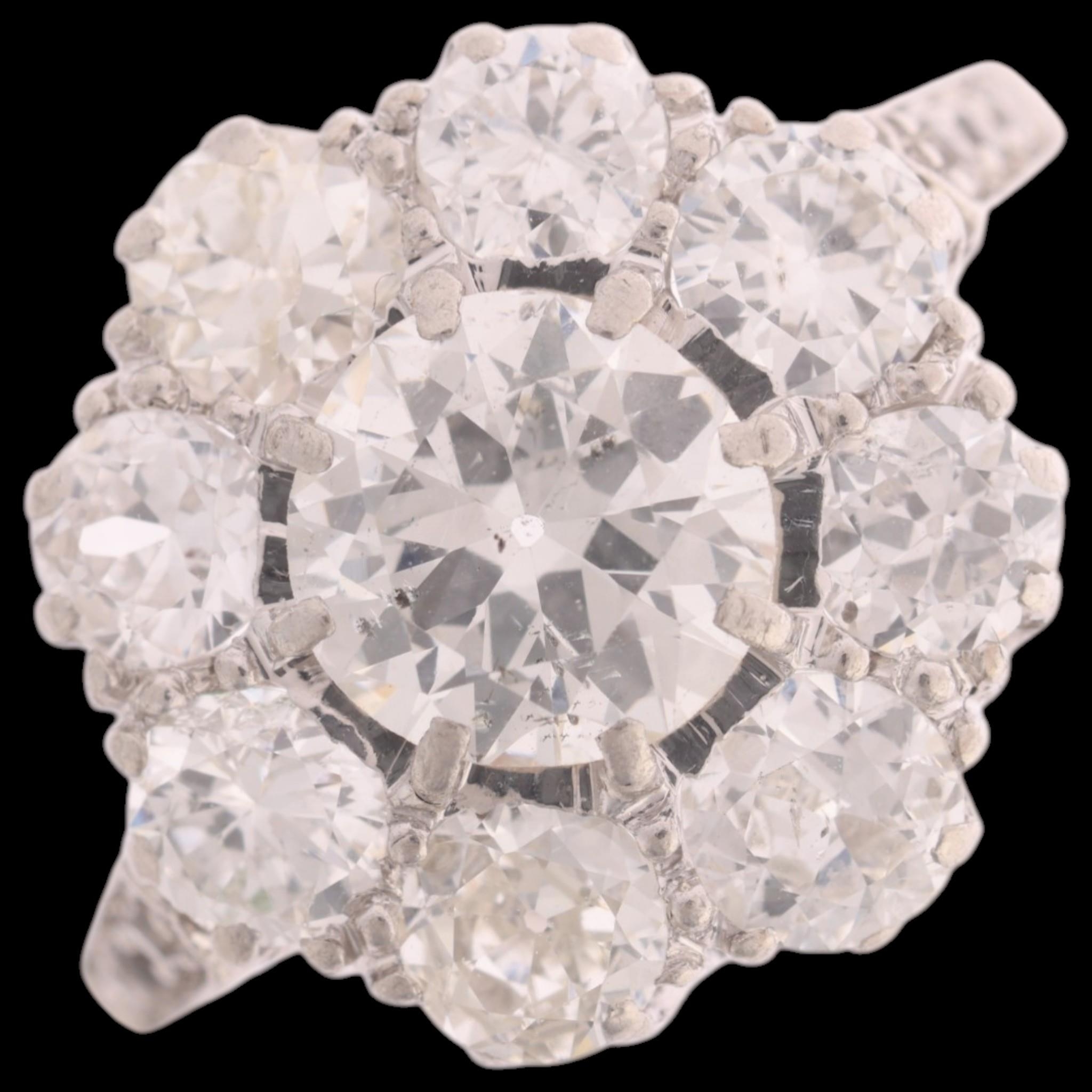 A platinum diamond cluster ring, centrally claw set with 0.90ct round transitional-cut diamond, surrounded by further old-cut diamonds and single-cut diamond shoulders, total diamond content approx 2.50ct, colour approx G-J, clarity approx SI1-I1, setting height 13.8mm, size O, 4.1g