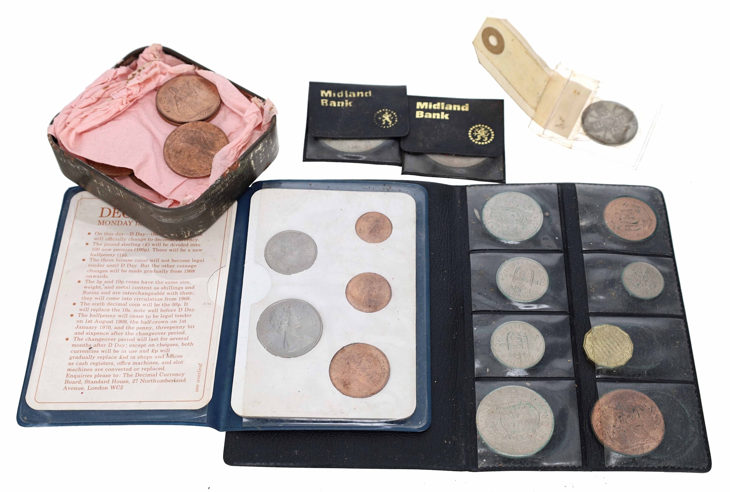 Collector's Britain's First Decimal Coin group; 1923 Florin; 1972 Silver Wedding Crown coin; 1965 Churchill commemorative Crown; shillings, half crowns pennies etc.