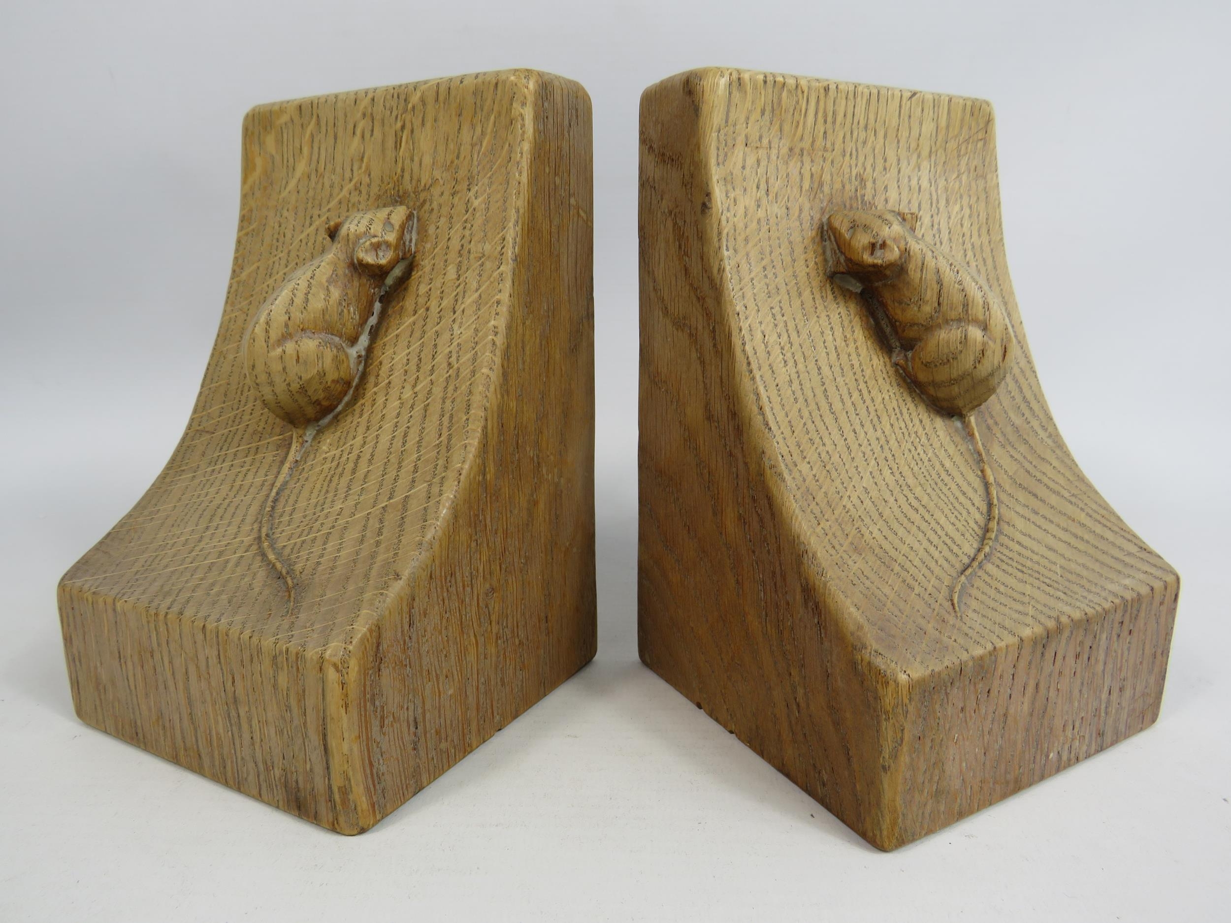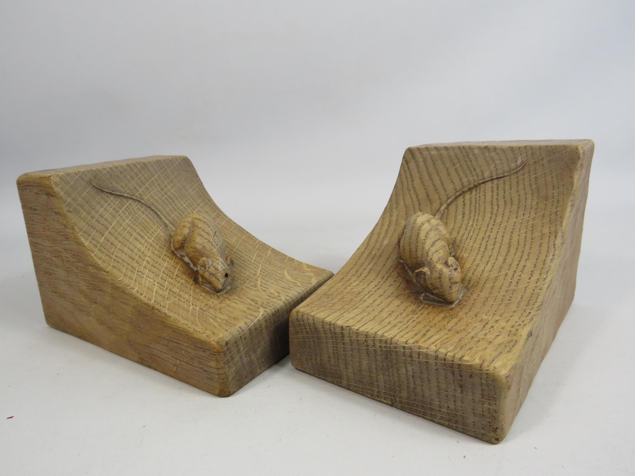 Pair of Robert "Mousey " Thompson Mouse man oak bookends. 6" tall, 4" wide and 3.5" deep. (1 does have slight damage to one ear)