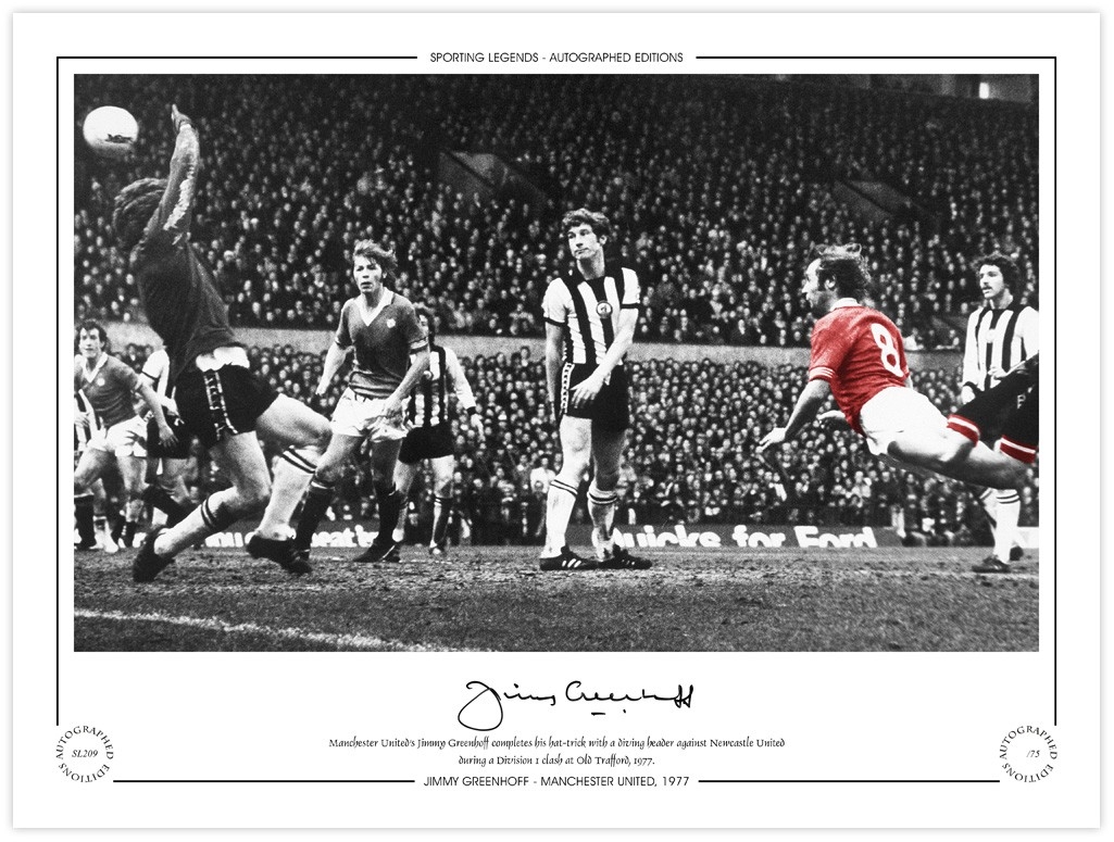 Autographed JIMMY GREENHOFF 1977 Limited-Edition : A superbly produced Limited Edition print measuring 16 x 12, depicting Manchester United's JIMMY GREENHOFF heading his third goal in a 3-1 victory over Newcastle United in a First Division encounter at Old Trafford in 1977, limited to just 75 editions it has been signed to the lower border in fine black marker.