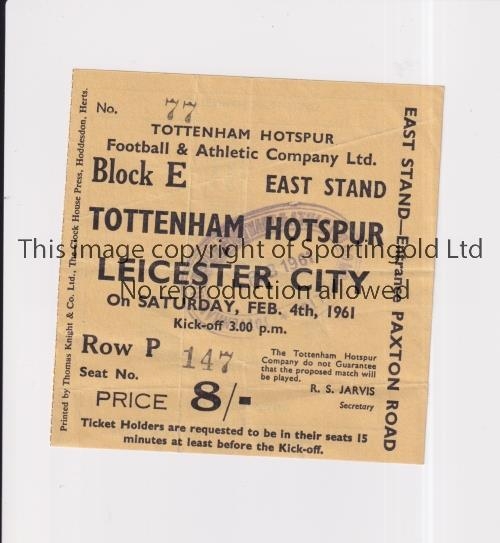 TOTTENHAM HOTSPUR 1960/1 Ticket for the home League match v Leicester City 4/2/1961, slightly creased, in their Double Season. Generally good