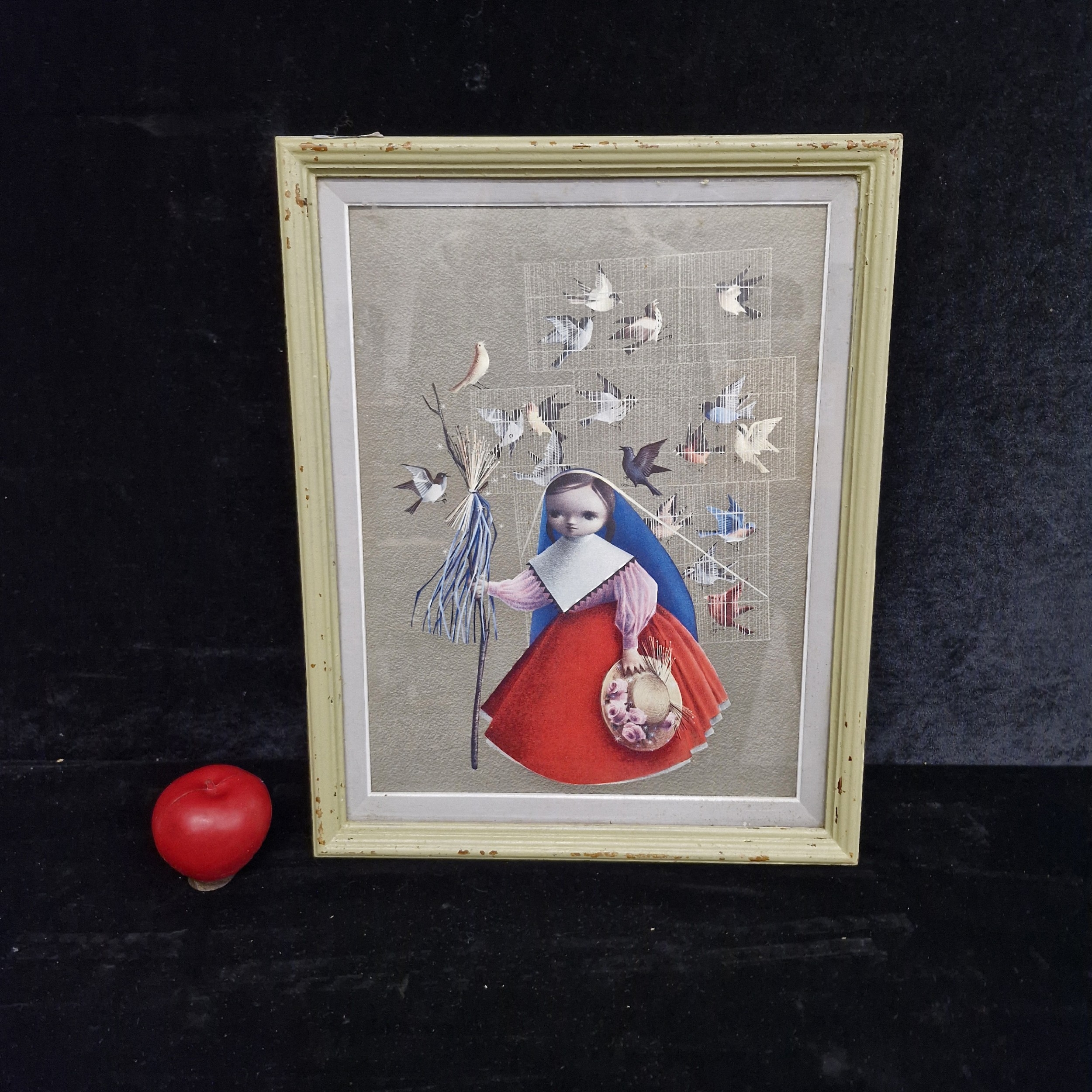 A print after an original painting titled 'Little Bird Vendor' by 'Alejandro Rangel'. Housed in a wooden frame behind glass.
