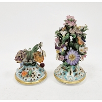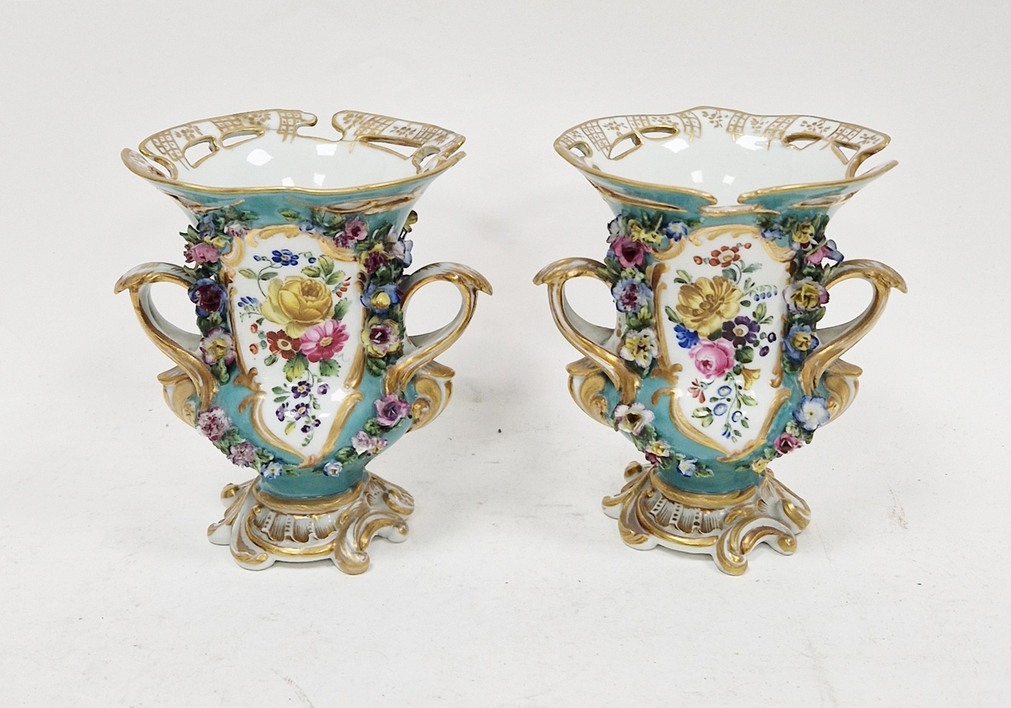 Pair of Meissen baluster two-handled flower encrusted vases, late 19th century blue crossed swords marks, incised numerals and pressnummern, possibly outside decorated, each painted with bouquets of flowers within rocaille gilt cartouches and encrusted floral garlands, each with pierced neck, with gilt branch handles, on scroll moulded feet (one with section of neck cracked and restuck), 14.5cm high