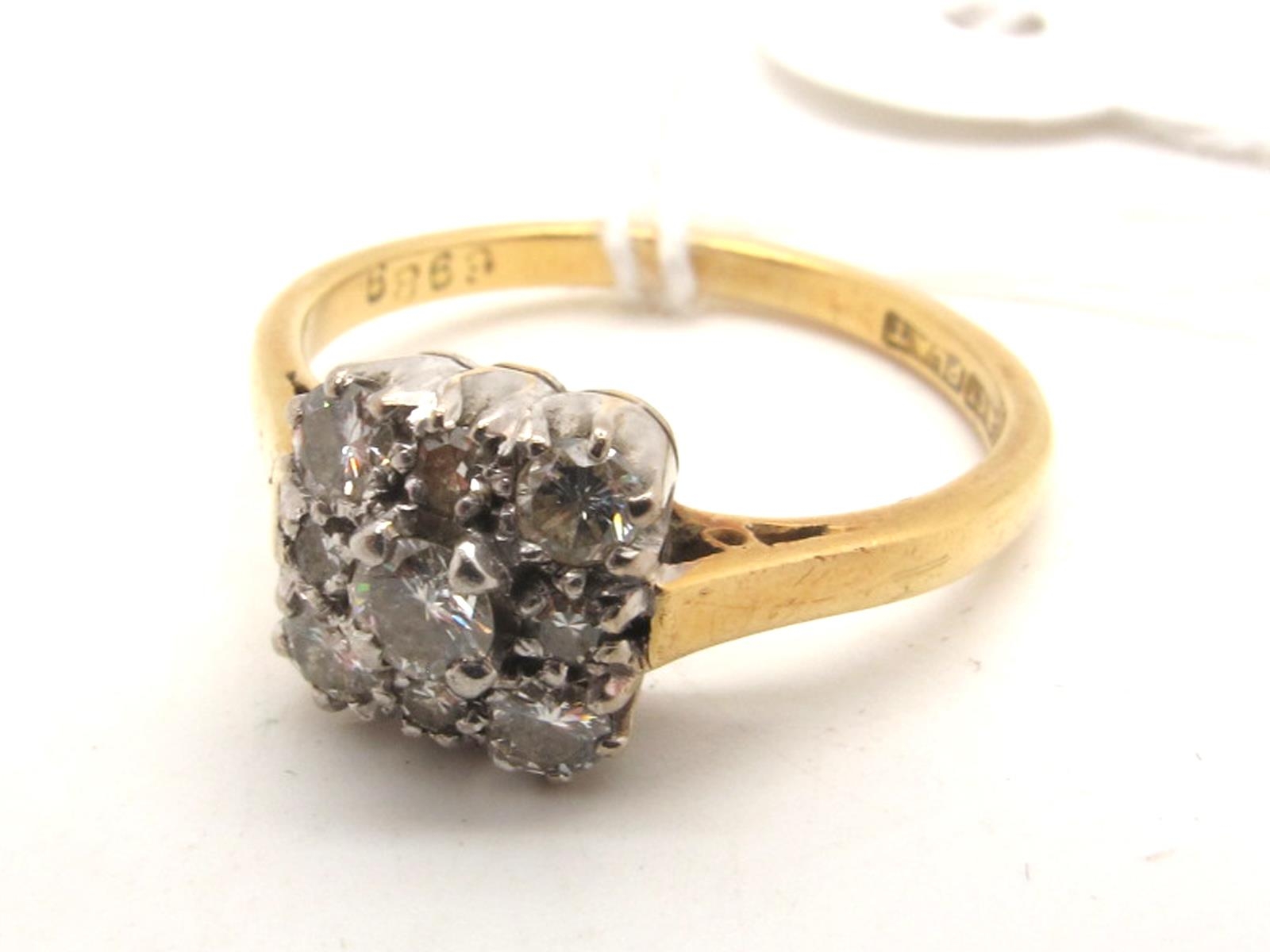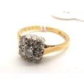 A Diamond Set Square Cluster Ring, claw set throughout with brilliant and single cut stones, stamped "18ct Plat" (finger size K).