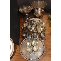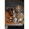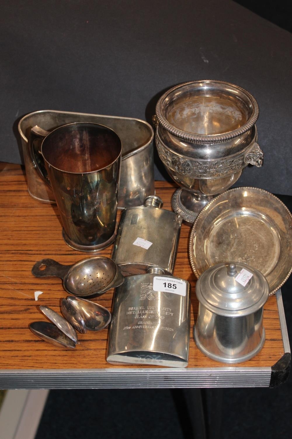 Silver-plated, and other, metal ware to include two hip flasks, a tankard, a tea strainer, two trinket boxes in the form of mussel shells, etc.