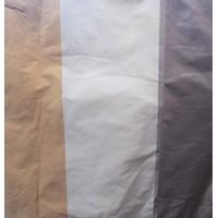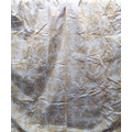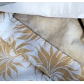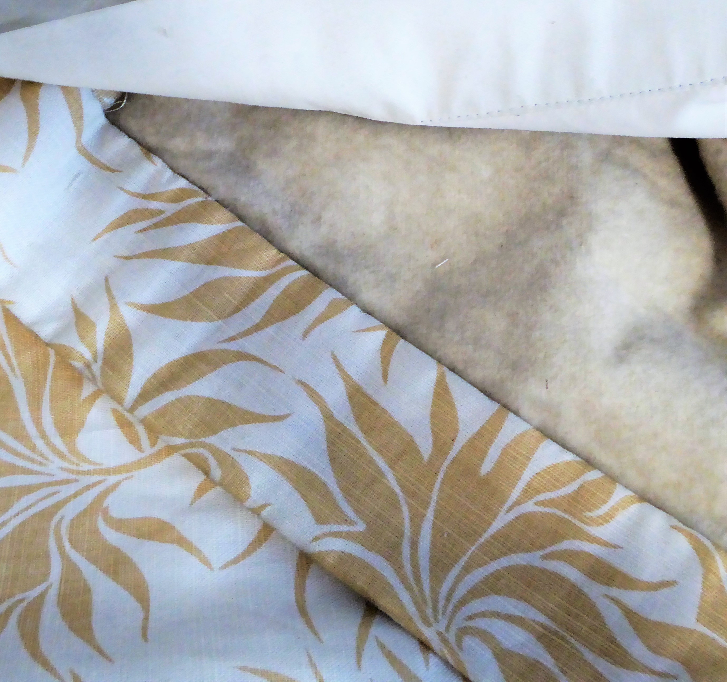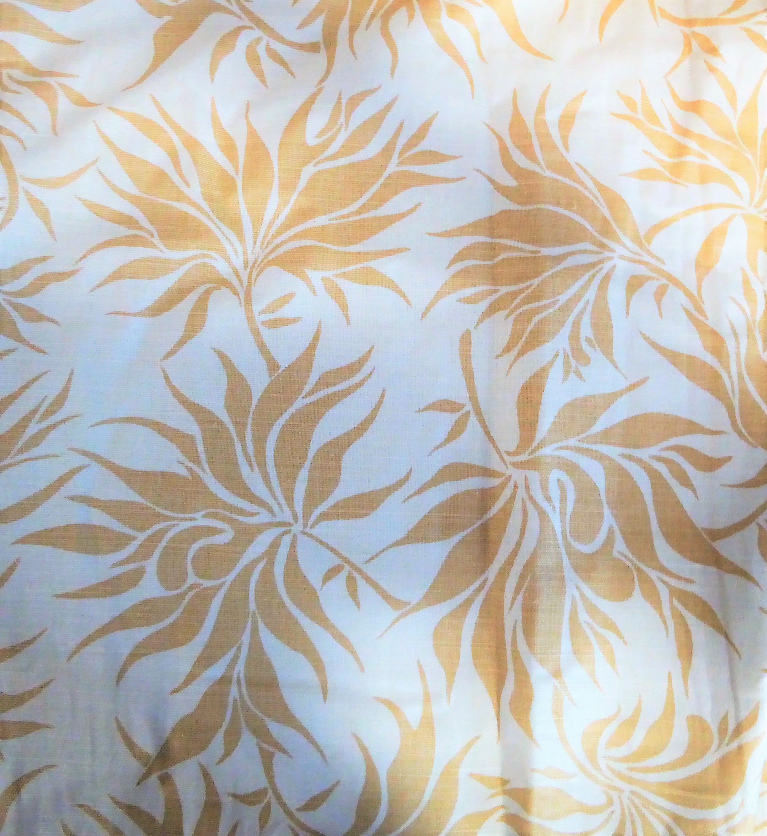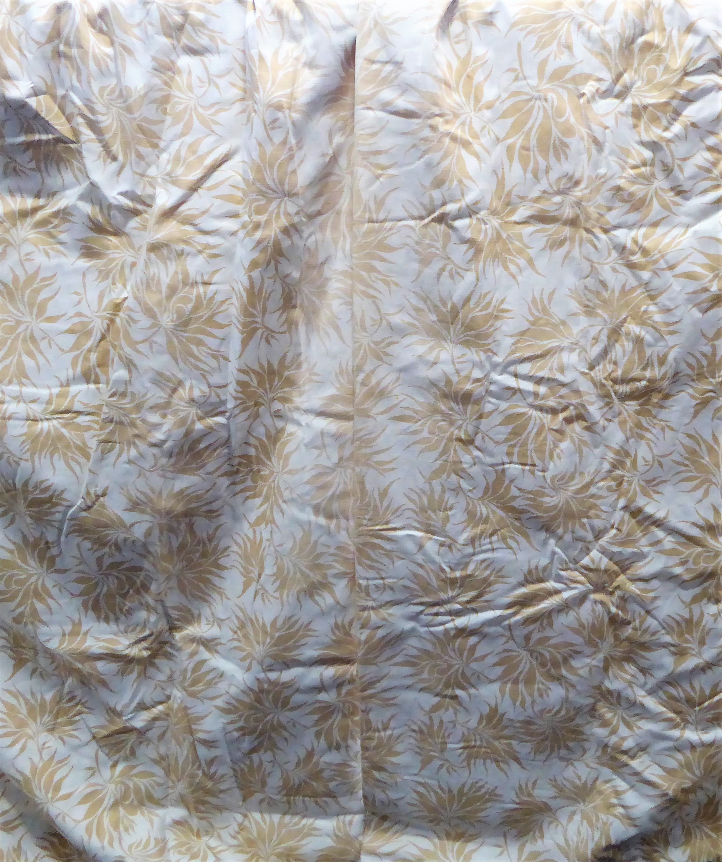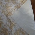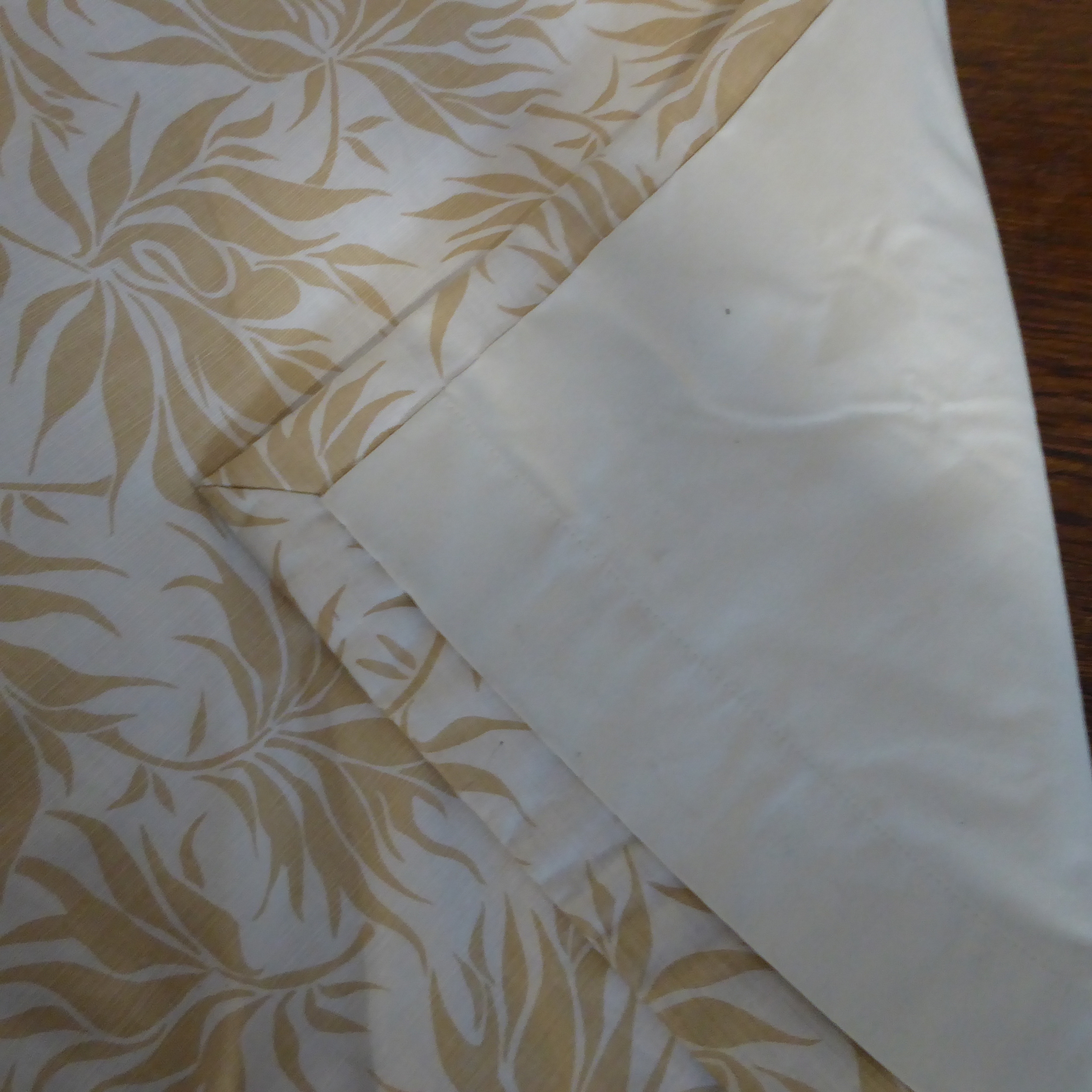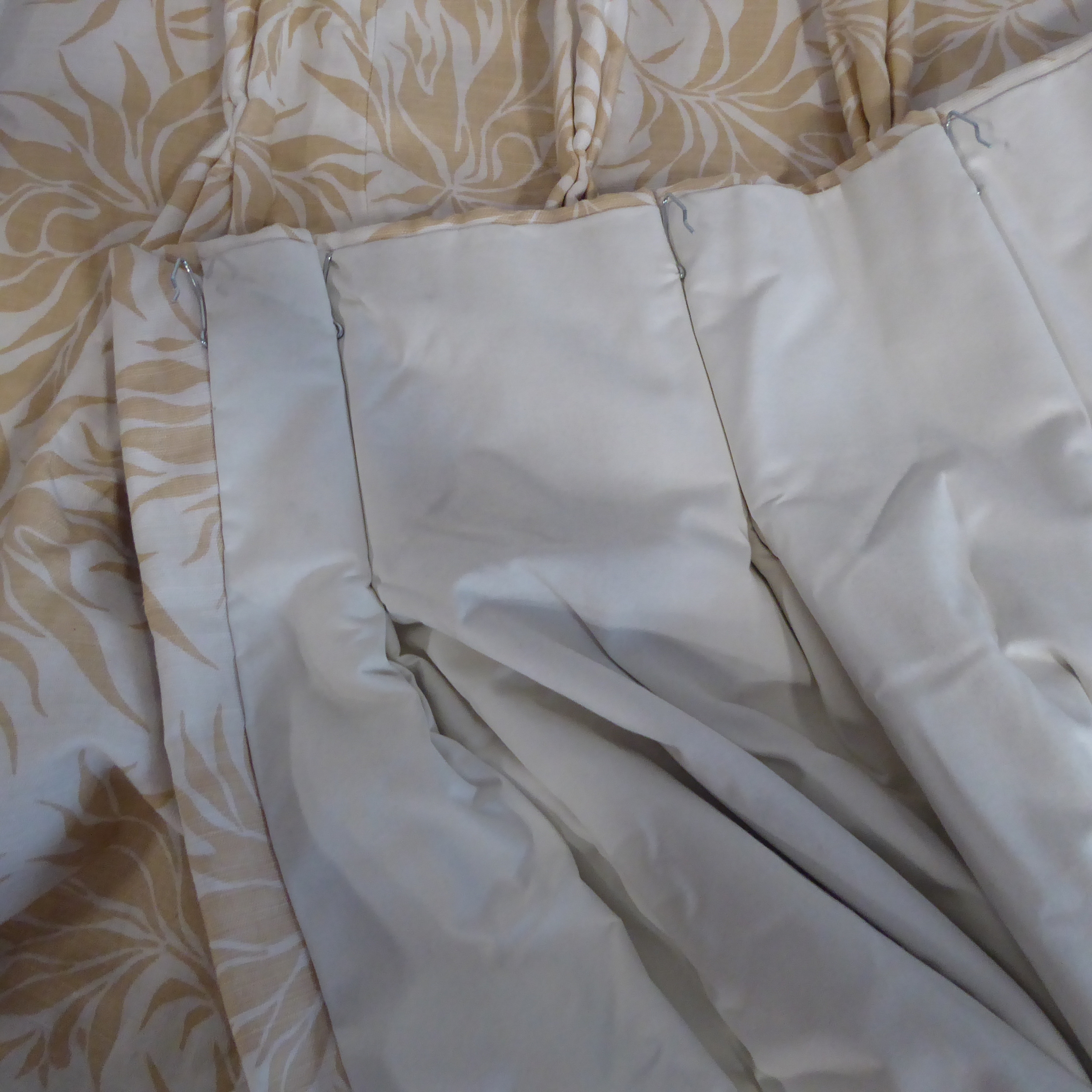 A pair of curtains in a heavy cream linen-effect fabric with gold leaf pattern; triple pinch pleat heading, thermal lining over thick waterproof cream cotton top lining (each curtain approx. 340cm hem width x 210cm drop). Good condition, fading to edges.