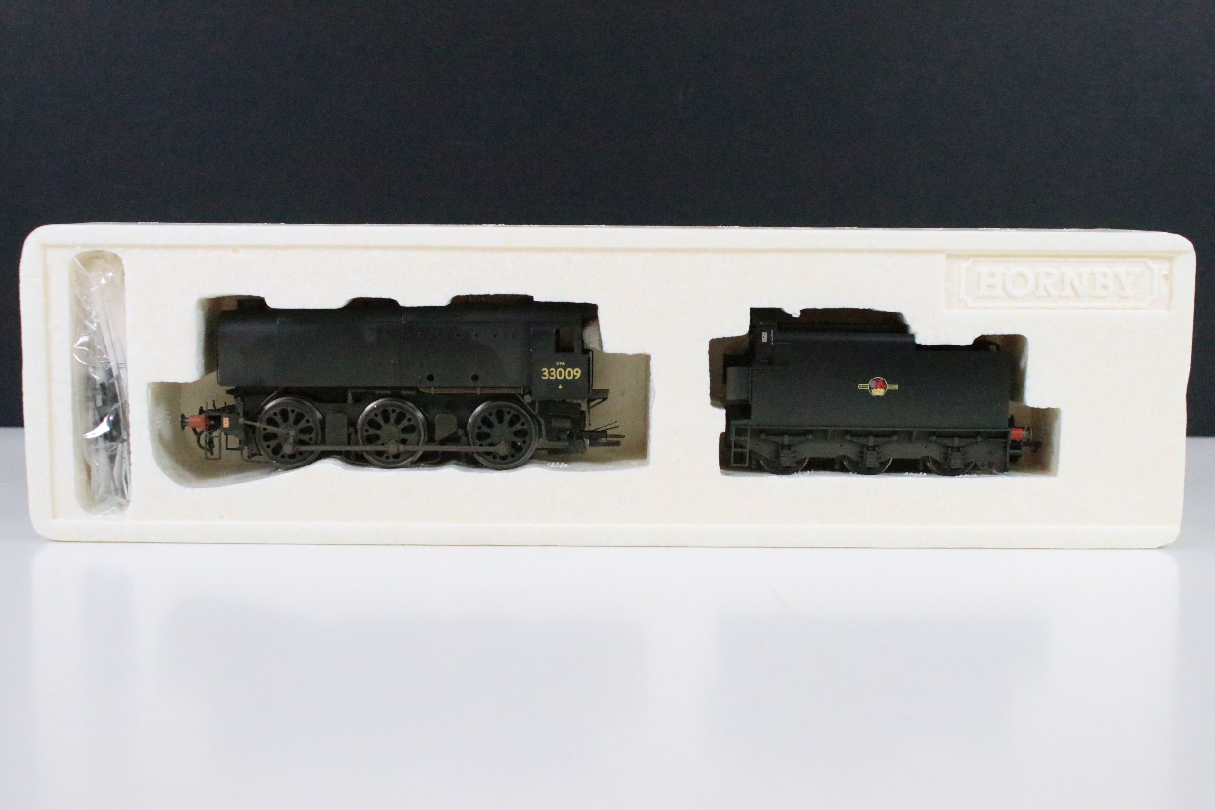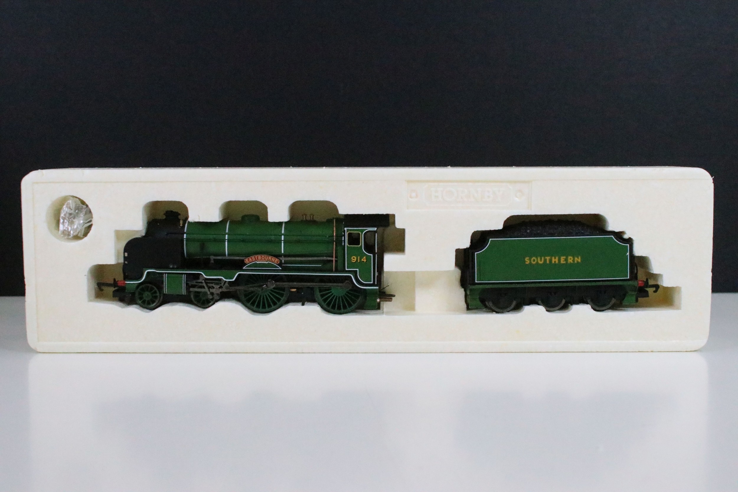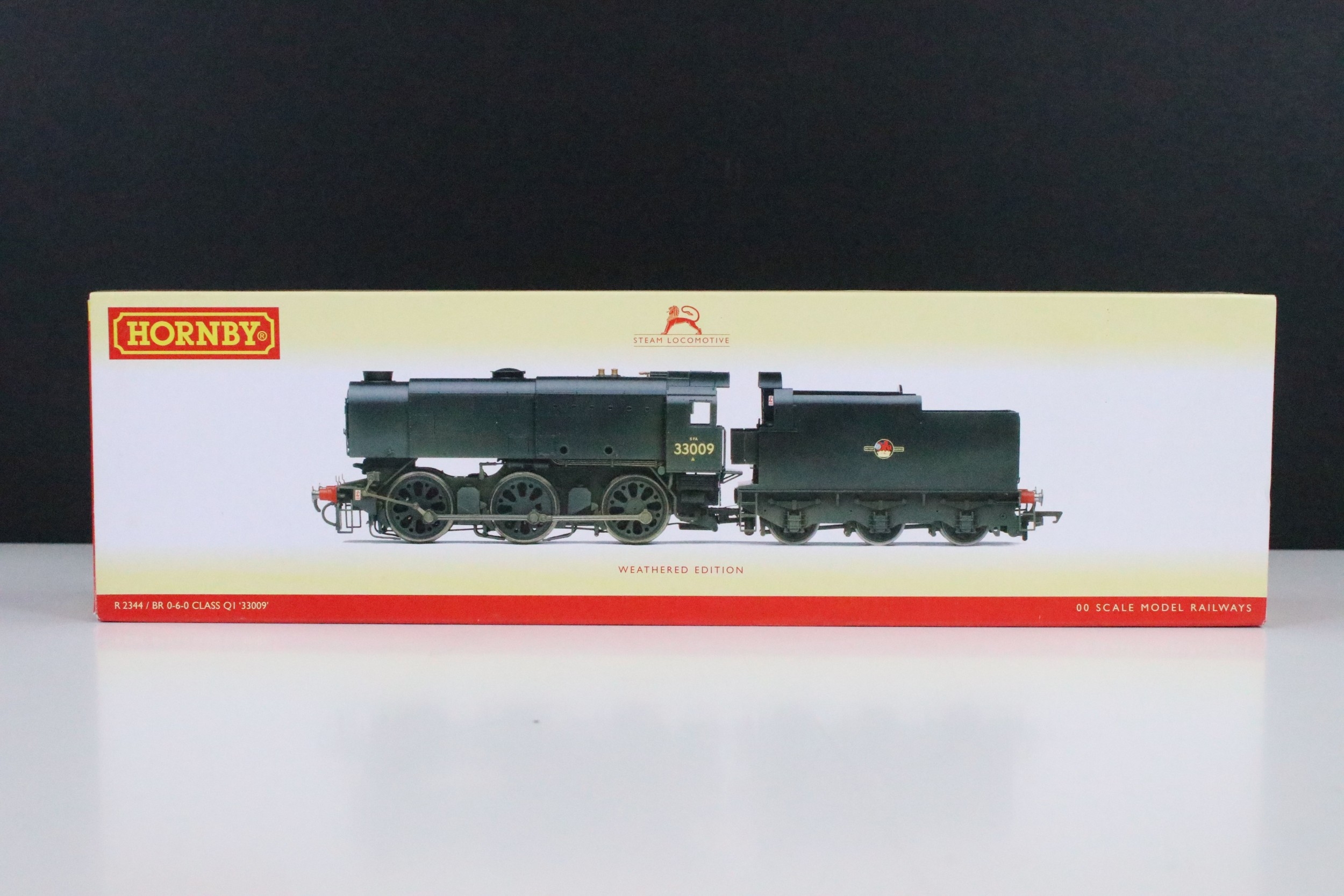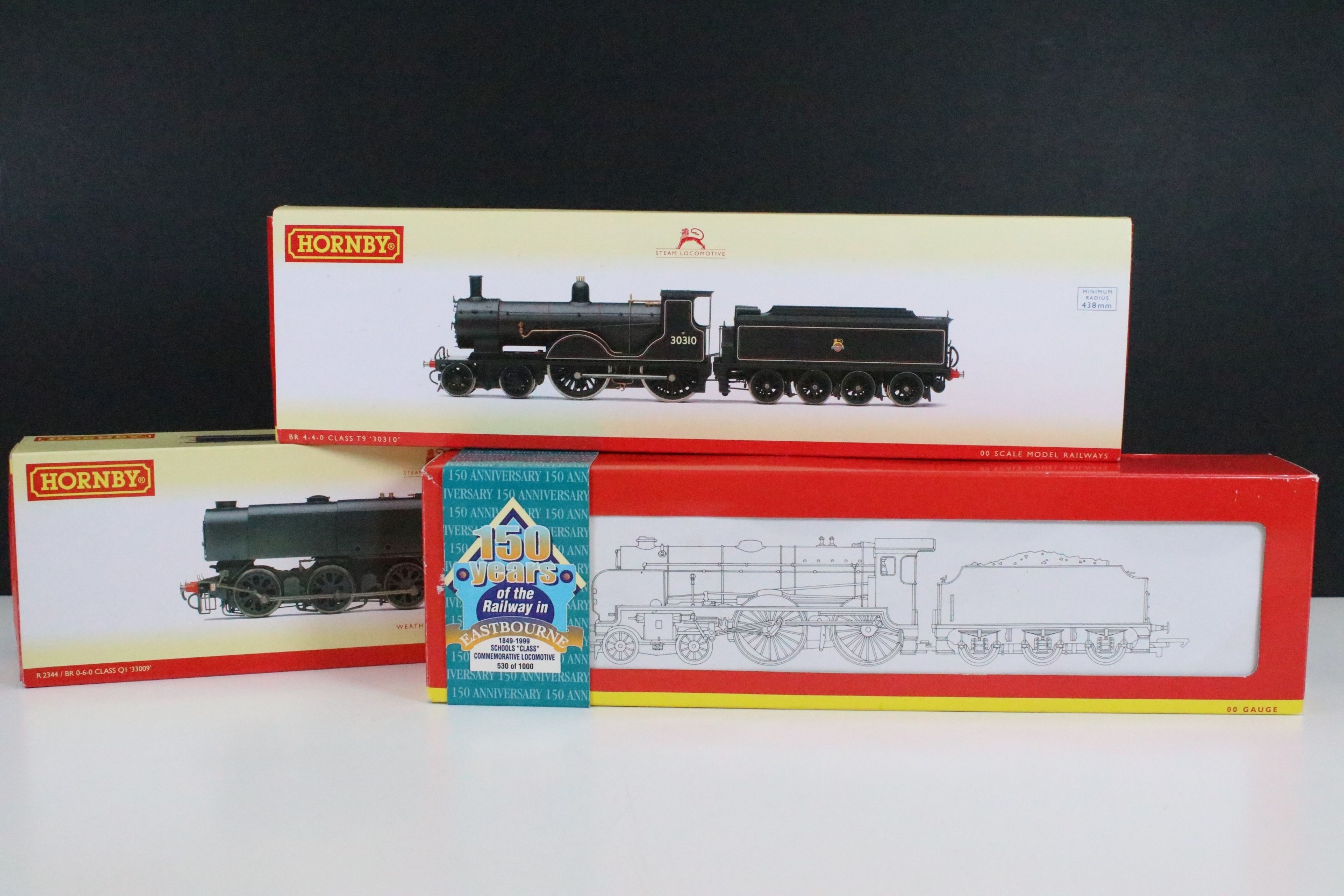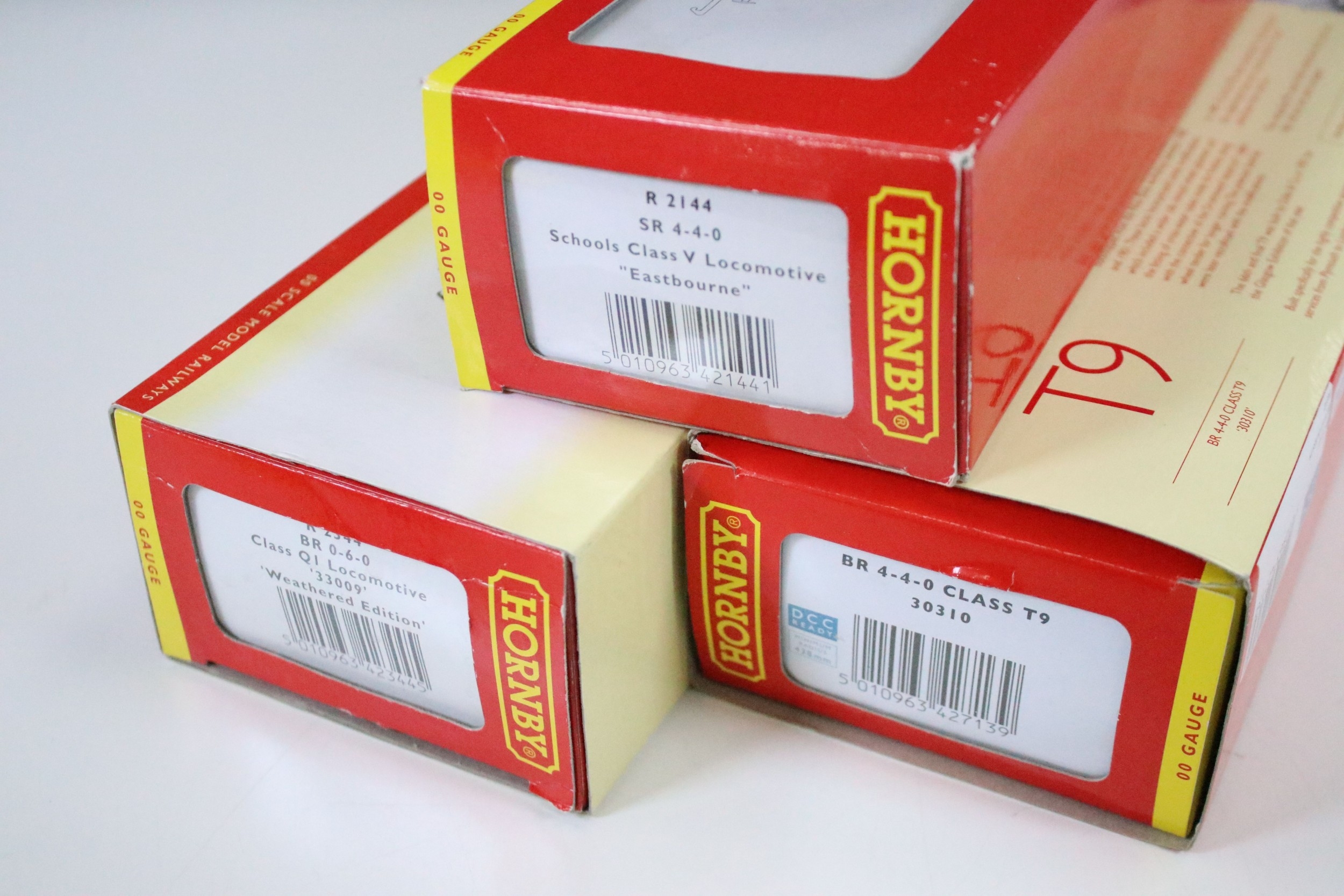 Three boxed Hornby OO gauge locomotives to include 150 Years of the Railway in Eastbourne R2144 SR 4-4-0 Schools Class V Locomotive Eastbourne, R2344 BR 0-6-0 Class Q1 Locomotive 33009 weathered edition and R2713 BR 4-4-0 Class T9 30310