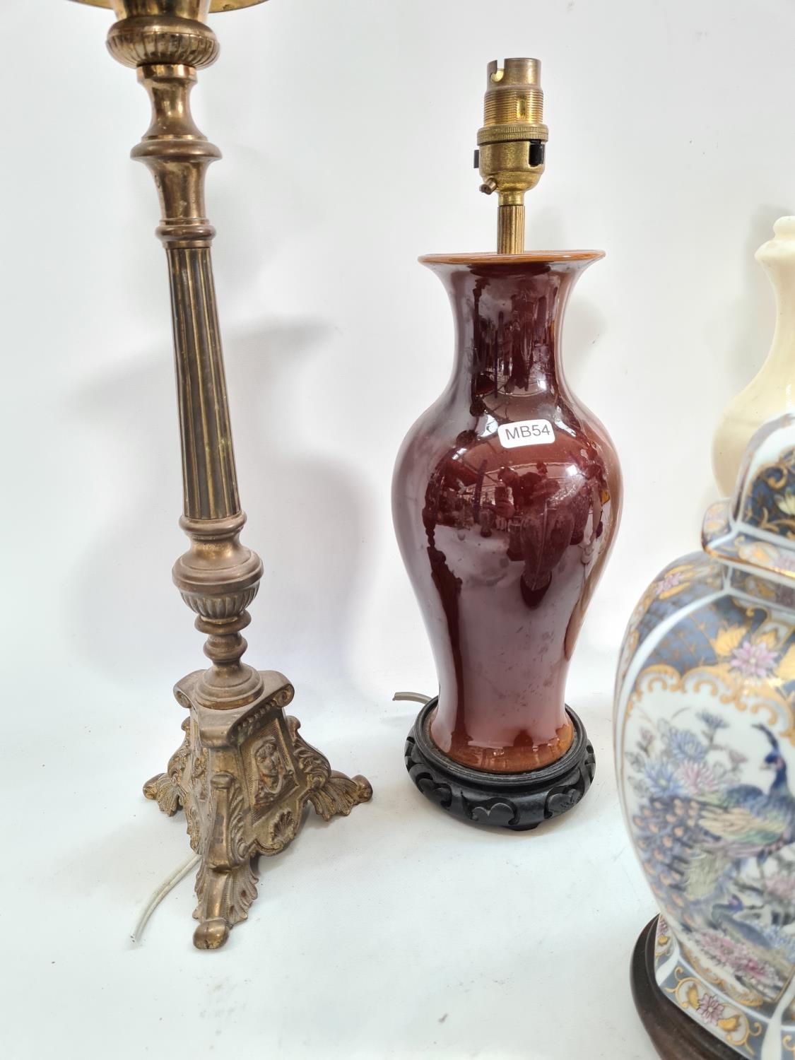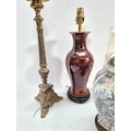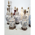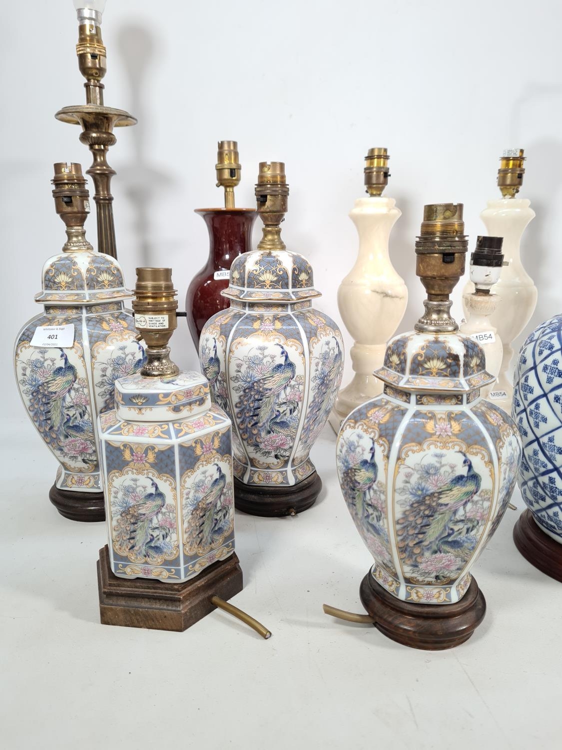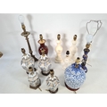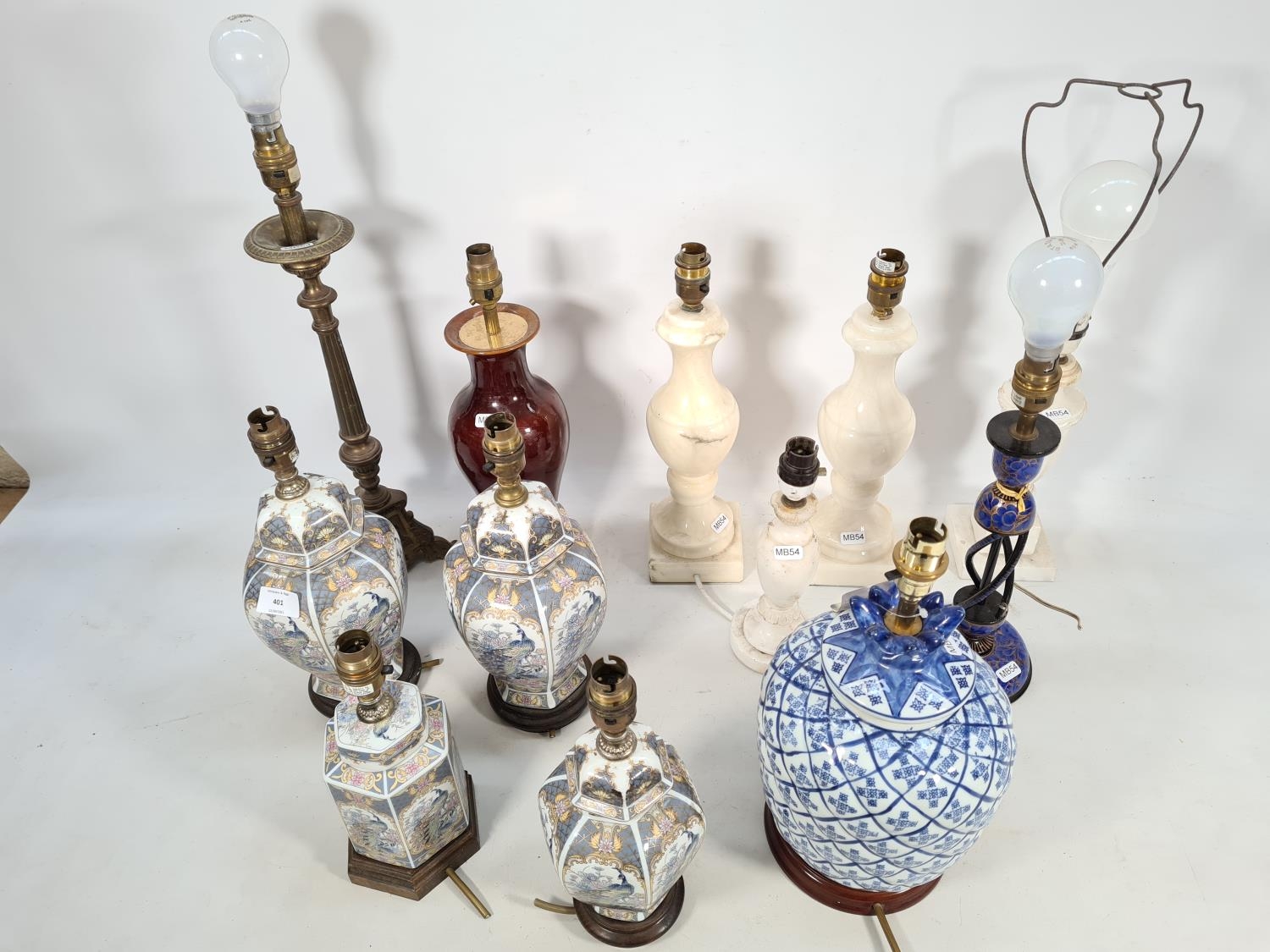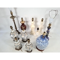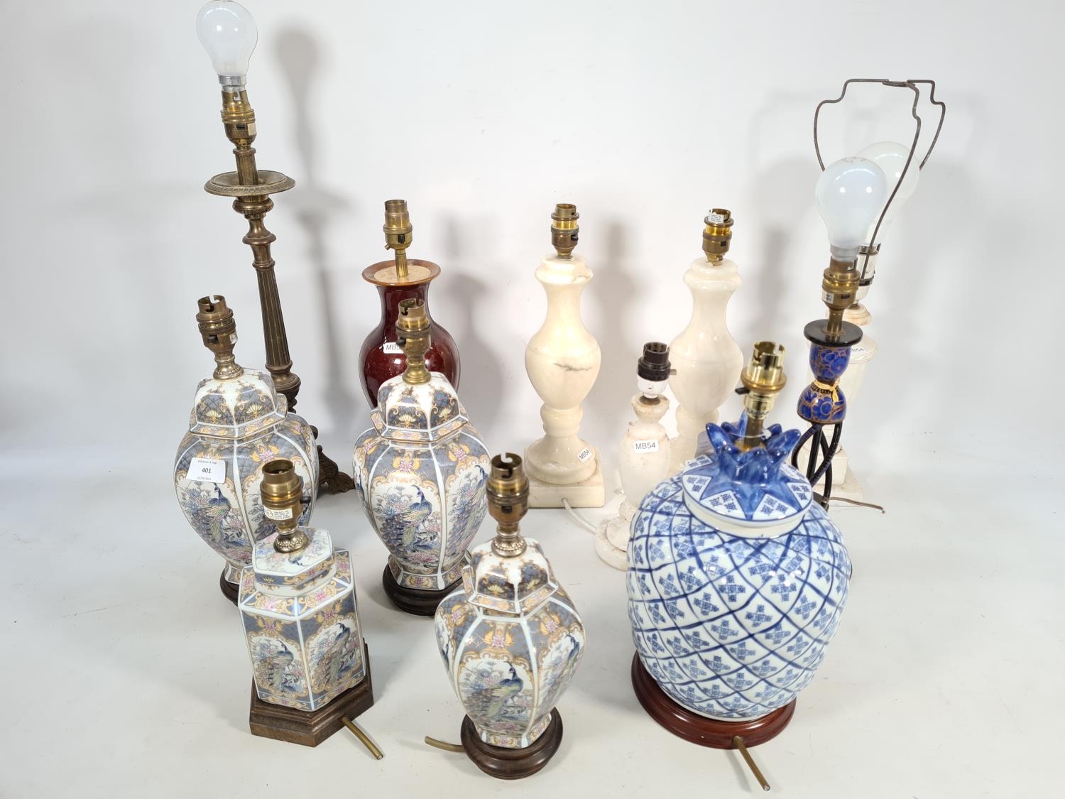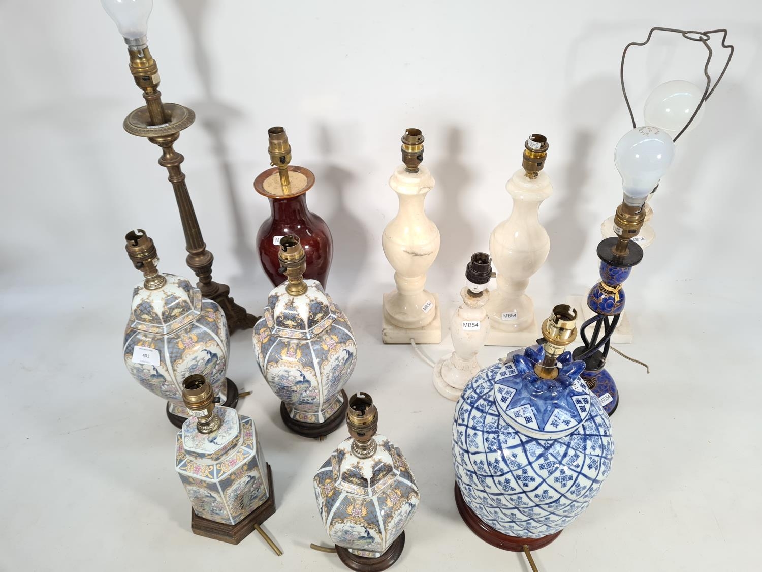 Twelve various table lamps, four white alabaster, six ceramic, one brass effect and one carved wooden hand painted example