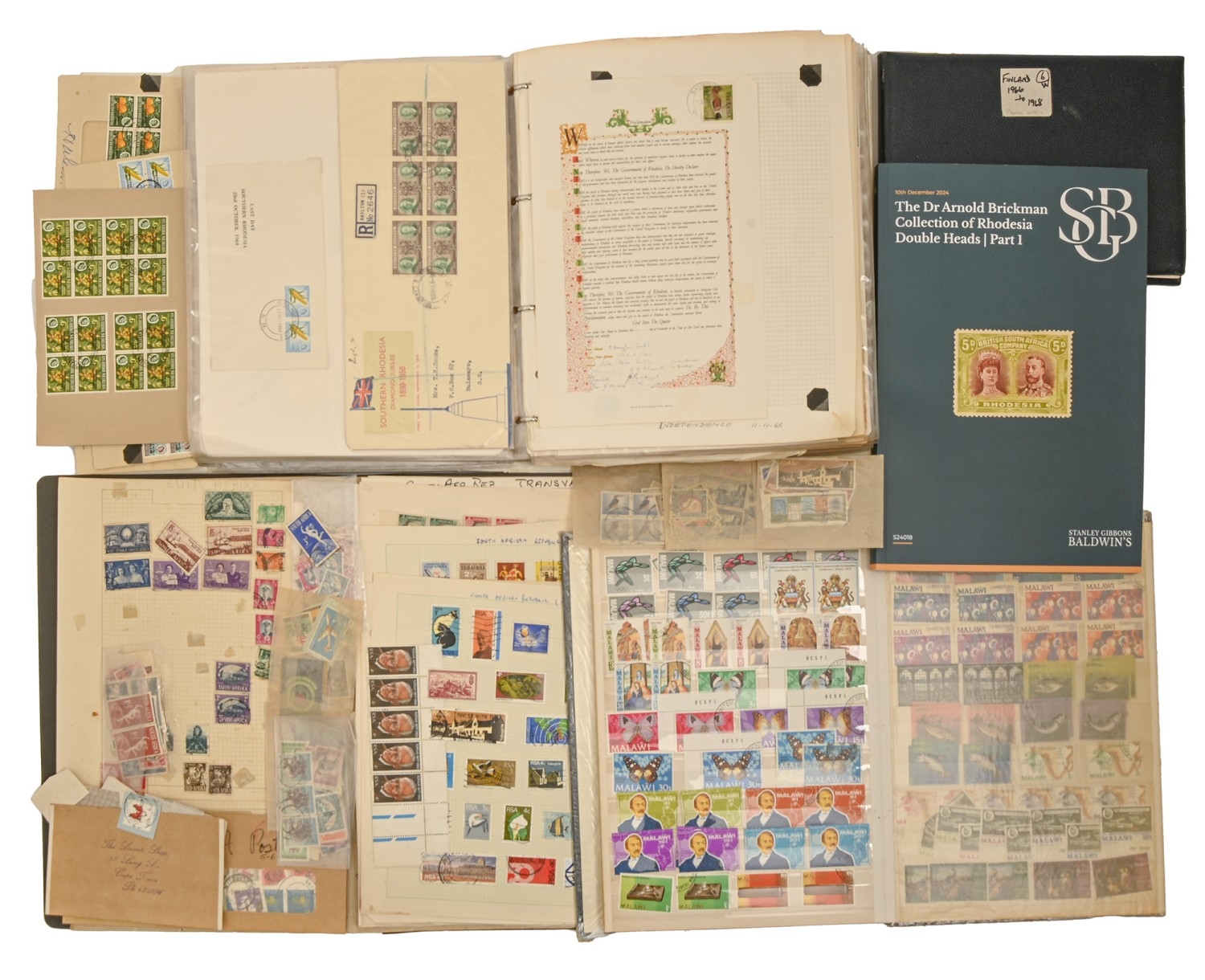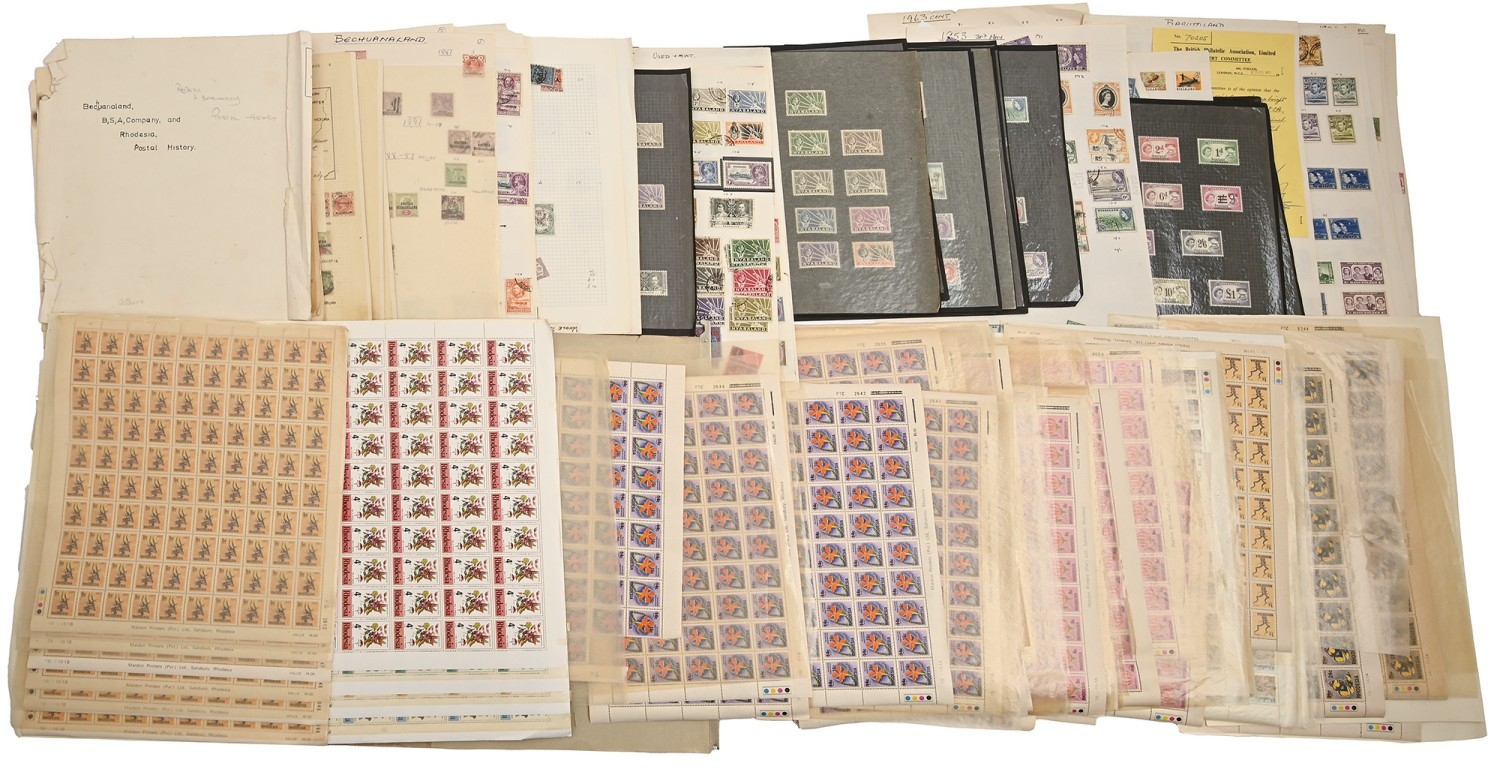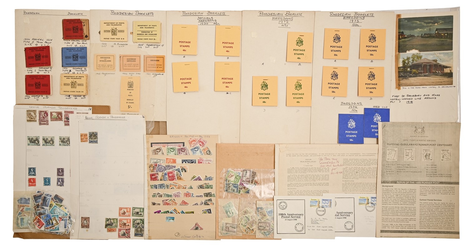 An extraordinary old ‘collection of collections’ of the postage stamps of Rhodesia, 1892-QEII, principal items noted include Admiral and Double Heads to £1, including specialised studies of shades and Rhodesian post marks, earlier issues including overprints and surcharges, stamp booklets, bulging folder of QEII UM sheets, postal history and postal stationery from QV onwards, including a series of postcards addressed to Kingsley Ogilvie Fairbridge (1885-1924) of Utopia [House], Umtali [Mutare] and others of the family, first flights and FDCs, several still substantial accumulations of other African territories, including Northern and Southern Rhodesia, Orange Free State and Natal ranges, including many overprints and surcharges, KUT, Zambia, Nyasaland and Mozambique, also miscellaneous GB and world, in eleven albums and stockbooks and on numerous leaves, in folders and loose, condition from UM and Fine Used to very poor on account of the African climate and insect damage, extremely untidily arranged but containing better/scarce items several with old BPA certificates, and a collection which should repay close inspection