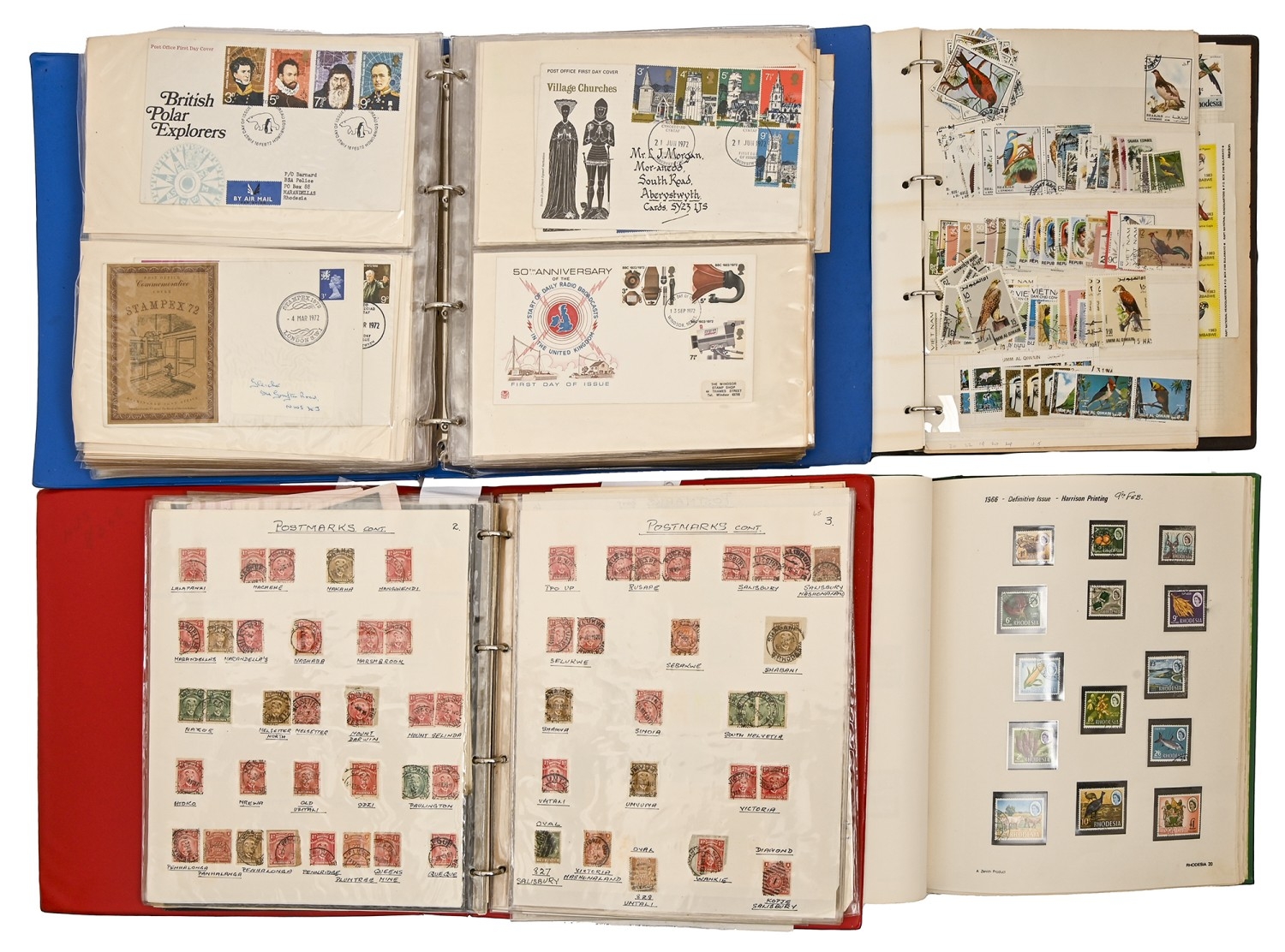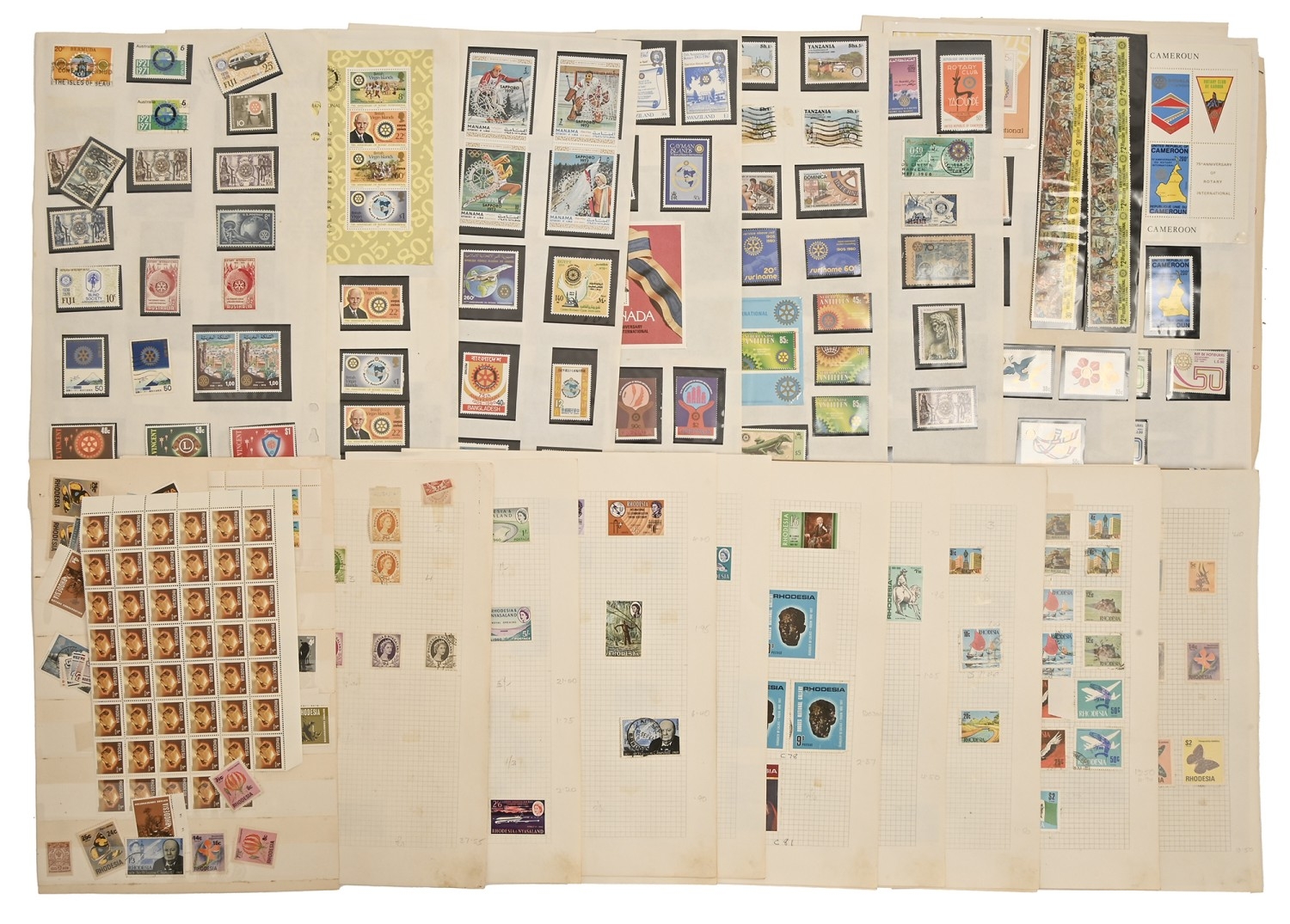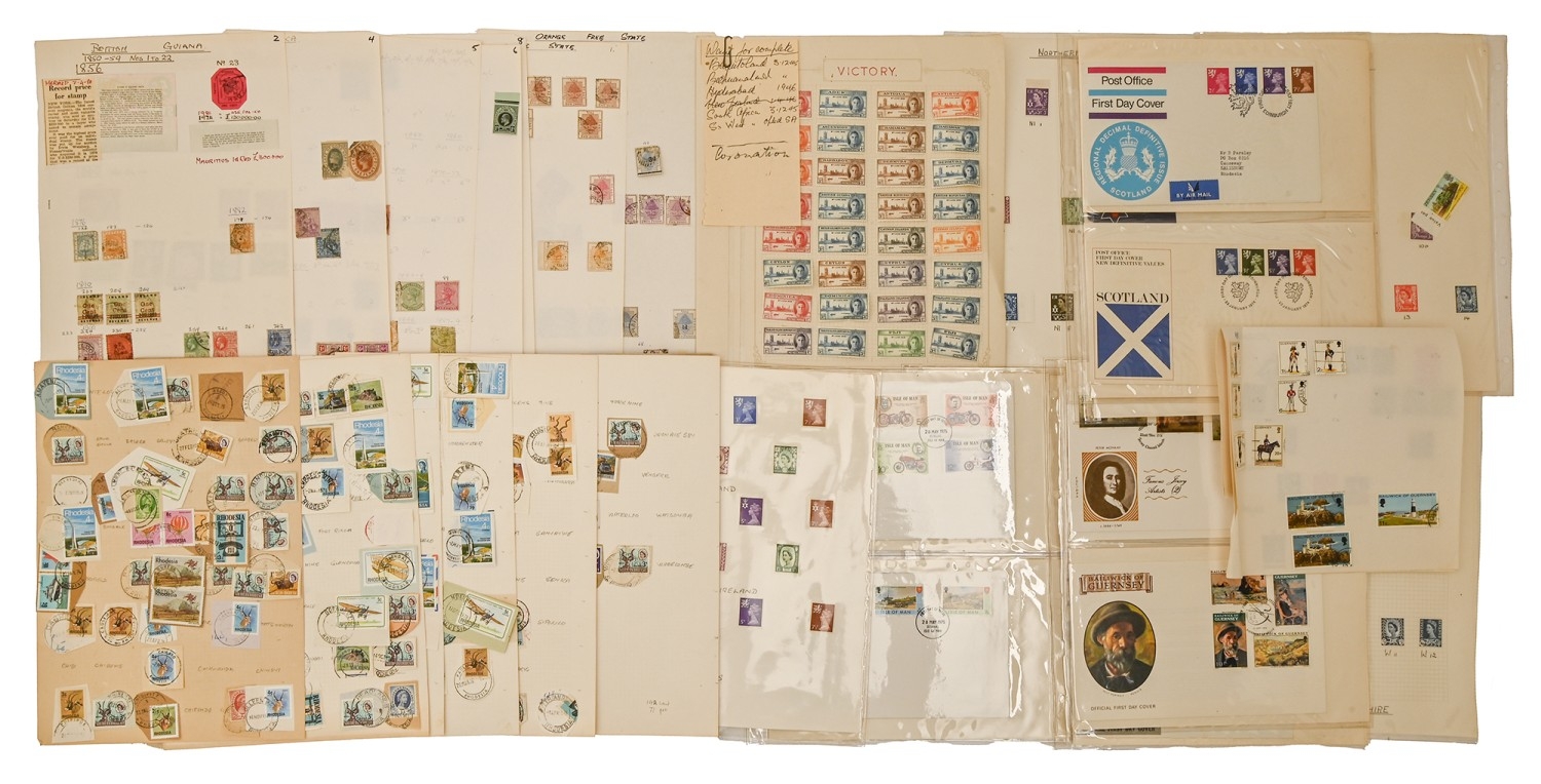 An extraordinary old ‘collection of collections’ of the postage stamps of Rhodesia, 1892-QEII, principal items noted include Admiral and Double Heads to £1, including specialised studies of shades and Rhodesian post marks, earlier issues including overprints and surcharges, stamp booklets, bulging folder of QEII UM sheets, postal history and postal stationery from QV onwards, including a series of postcards addressed to Kingsley Ogilvie Fairbridge (1885-1924) of Utopia [House], Umtali [Mutare] and others of the family, first flights and FDCs, several still substantial accumulations of other African territories, including Northern and Southern Rhodesia, Orange Free State and Natal ranges, including many overprints and surcharges, KUT, Zambia, Nyasaland and Mozambique, also miscellaneous GB and world, in eleven albums and stockbooks and on numerous leaves, in folders and loose, condition from UM and Fine Used to very poor on account of the African climate and insect damage, extremely untidily arranged but containing better/scarce items several with old BPA certificates, and a collection which should repay close inspection