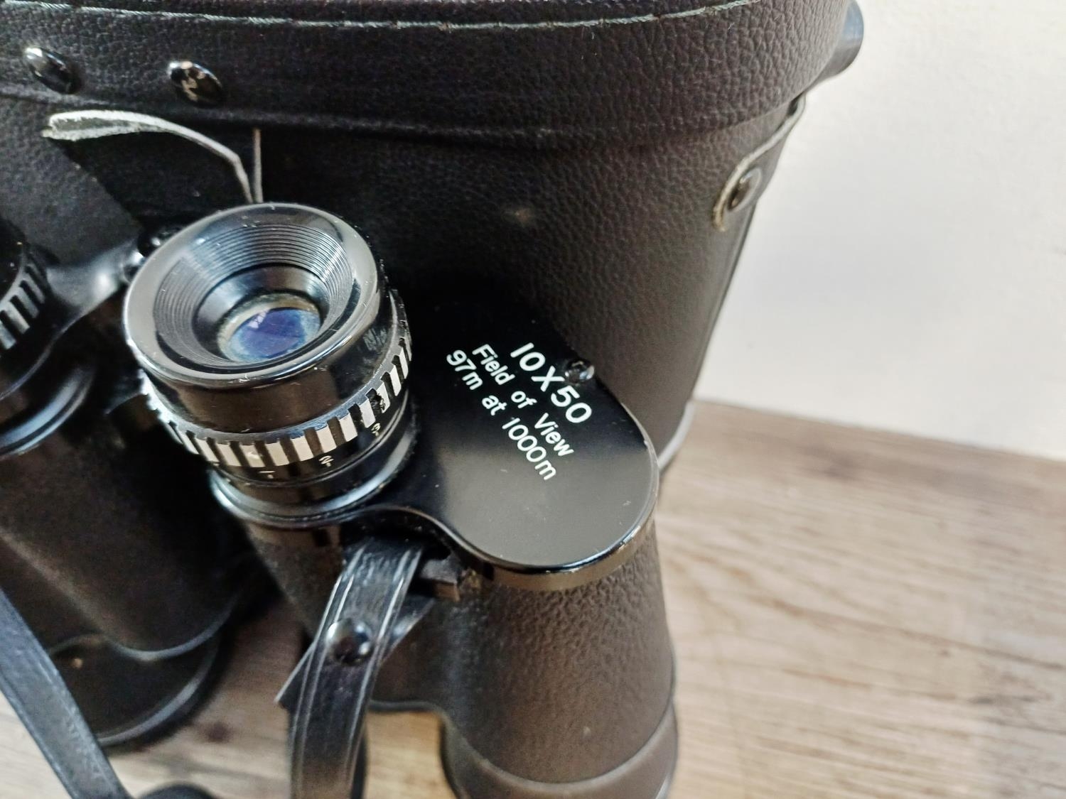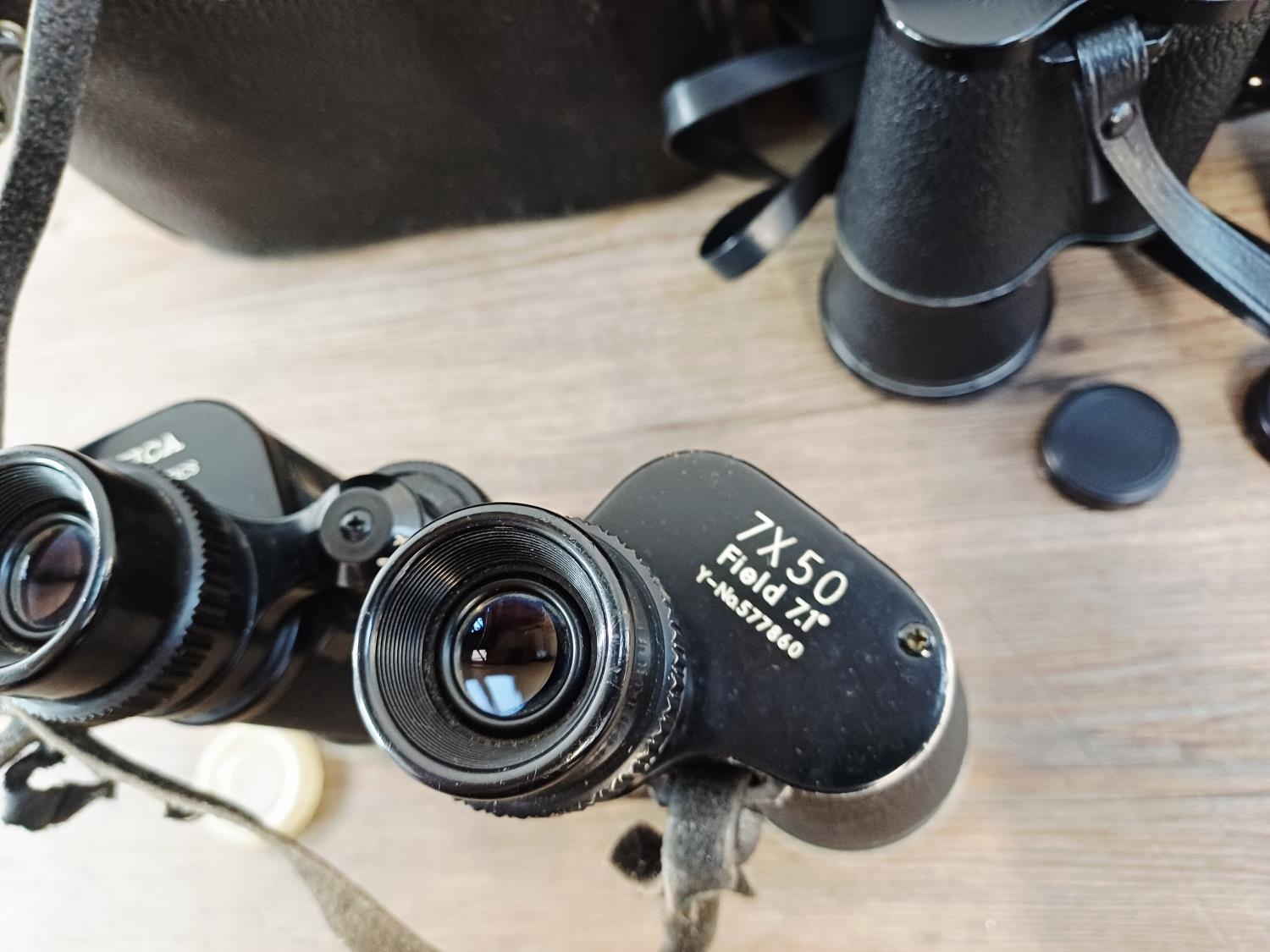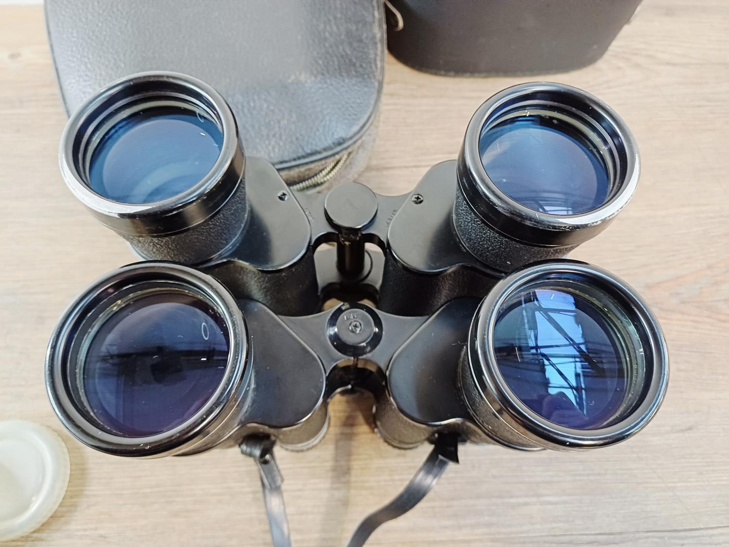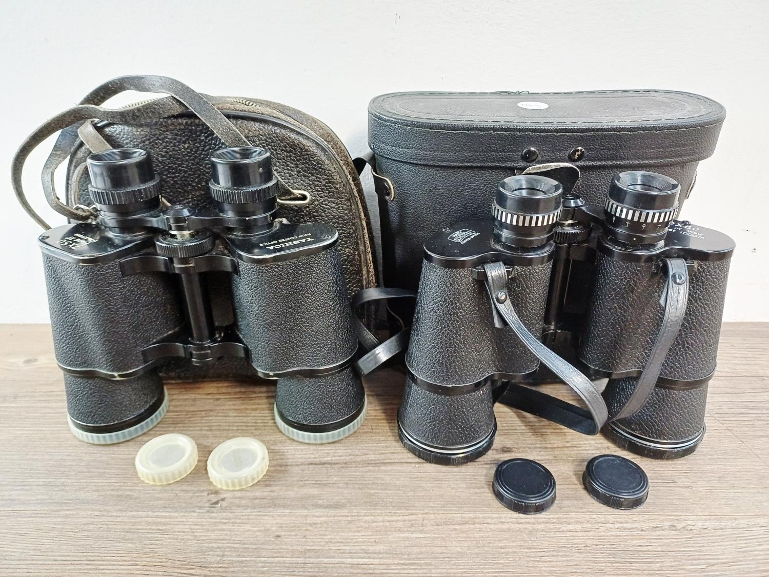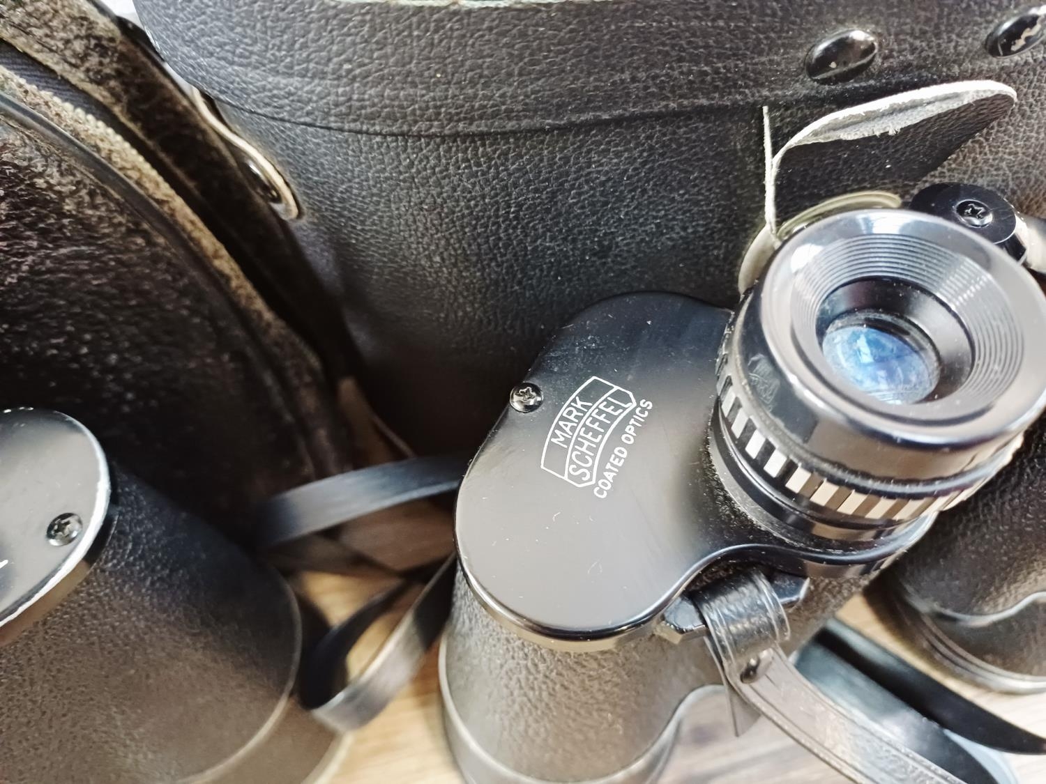Two cased pairs of binoculars with caps, one Mark Scheffel 10x50 and one Yashica 7x50