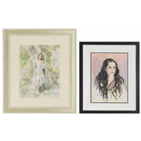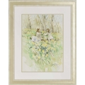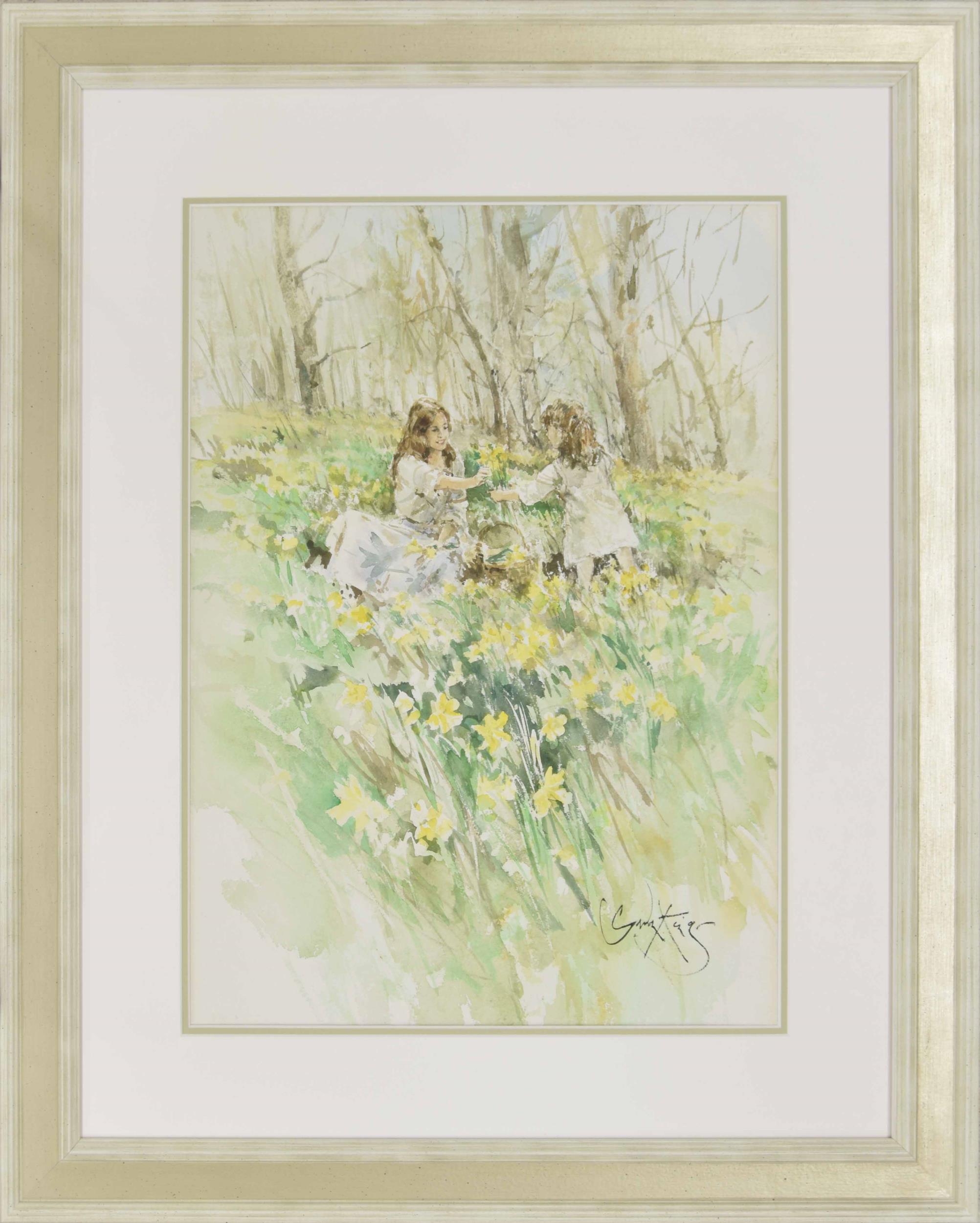 Gordon King (1939-2022) - Mother and child picking daffodils in a sunlit meadow, signed pencil and watercolour heightened with white 19.75" x 14.25"