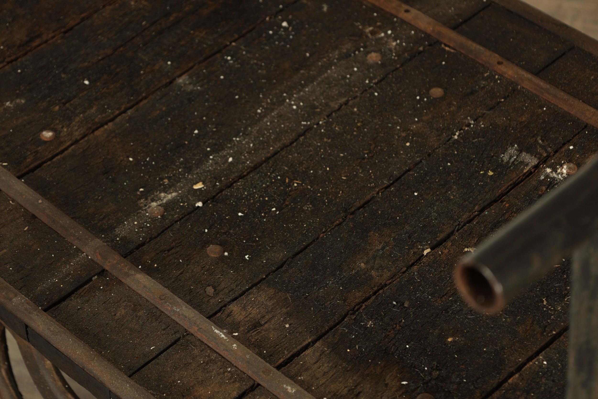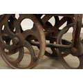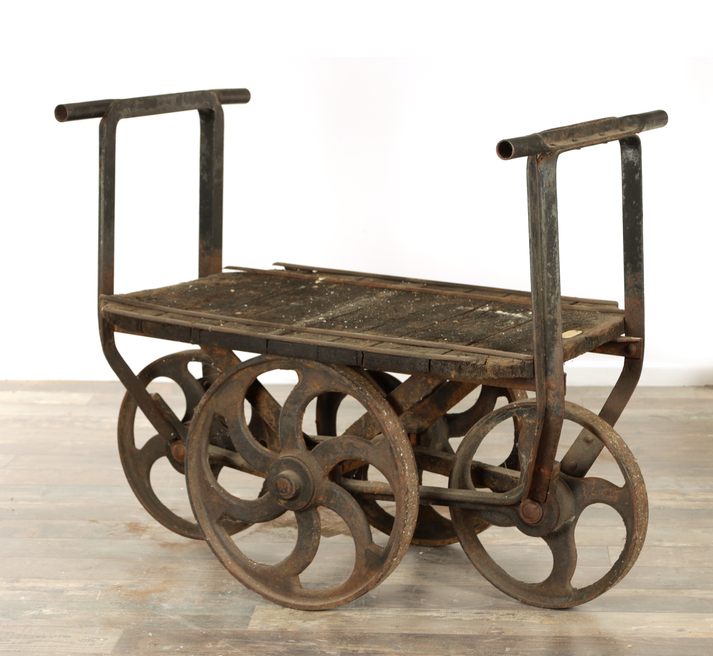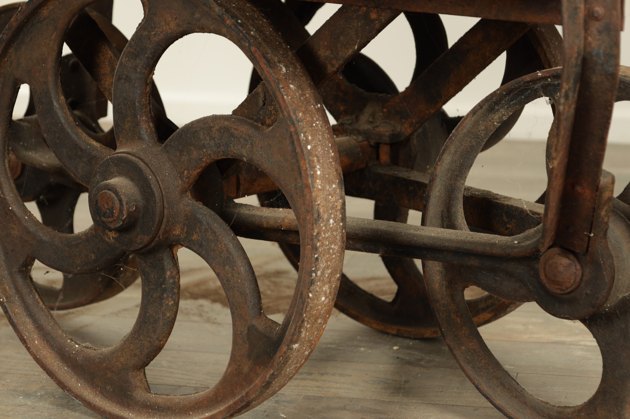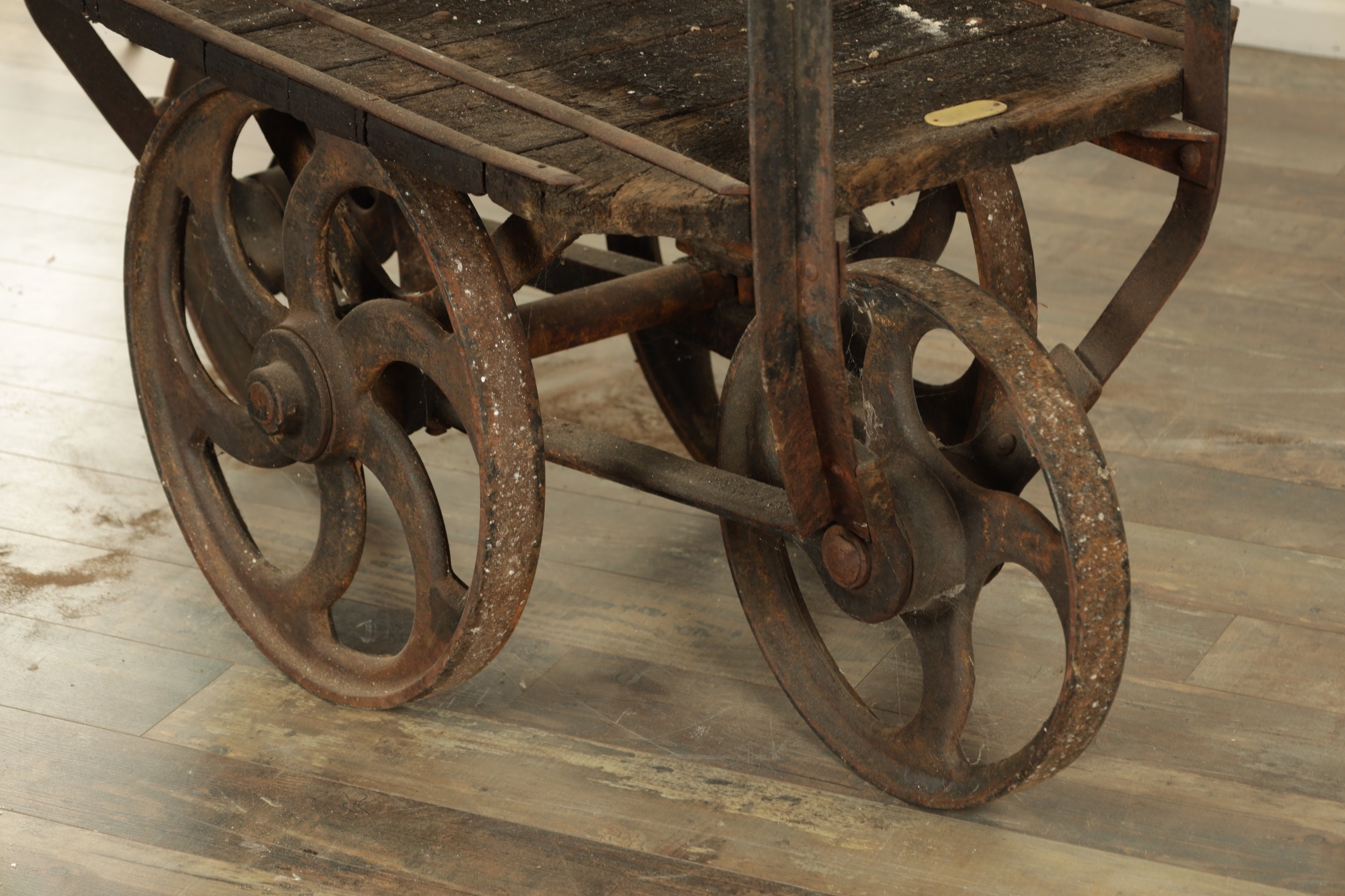 A 19TH CENTURY RAILWAY LUGGAGE/INDUSTRIAL MILL TROLLEY with cast iron spoked wheels.