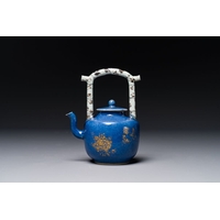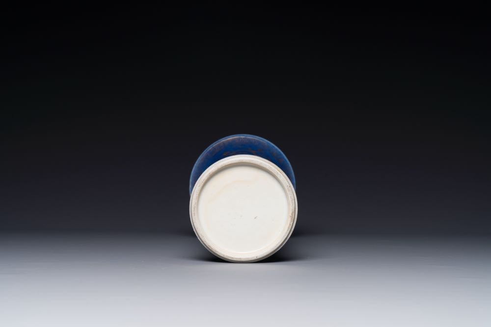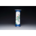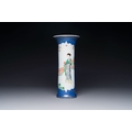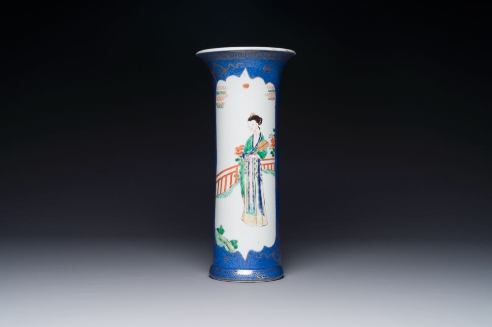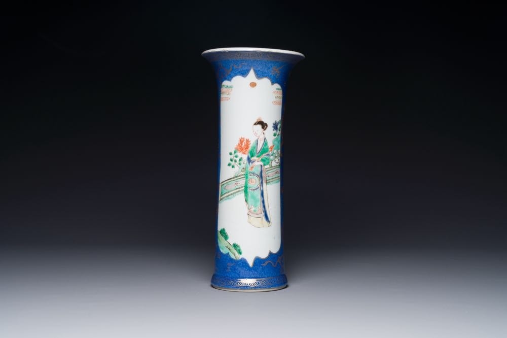 A Chinese famille verte powder-blue-ground 'court lady' beaker vase, Kangxi