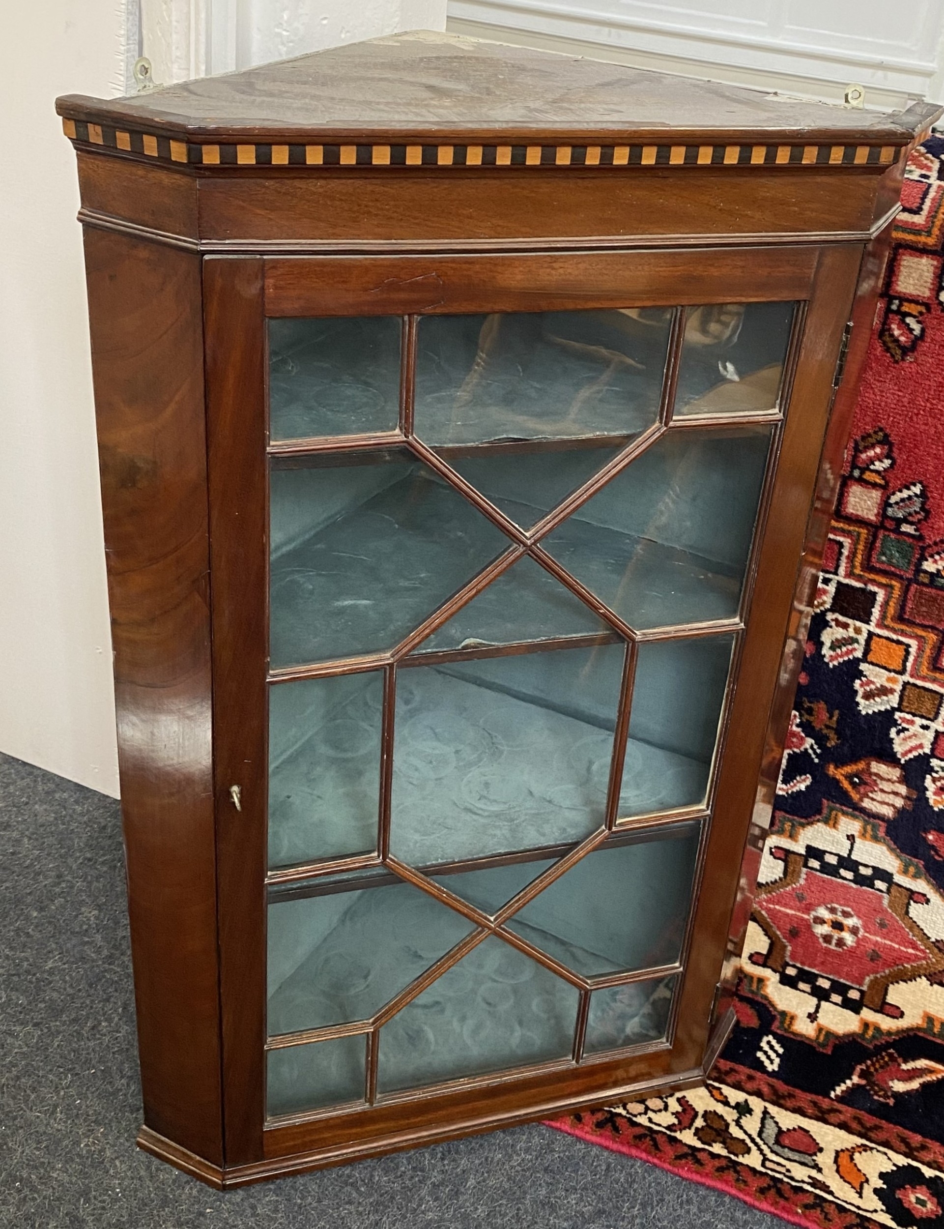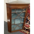 A 19th century glazed mahogany hanging corner cabinet, having an inlaid moulded cornice above the astragal glazed door enclosing three fixed shelves, 64cm wide by 96cm high.