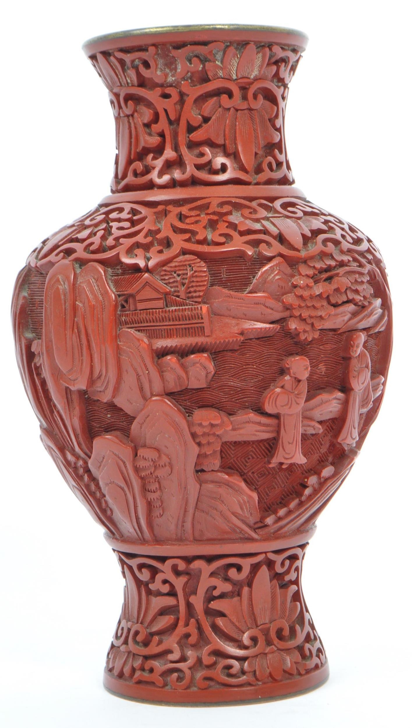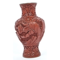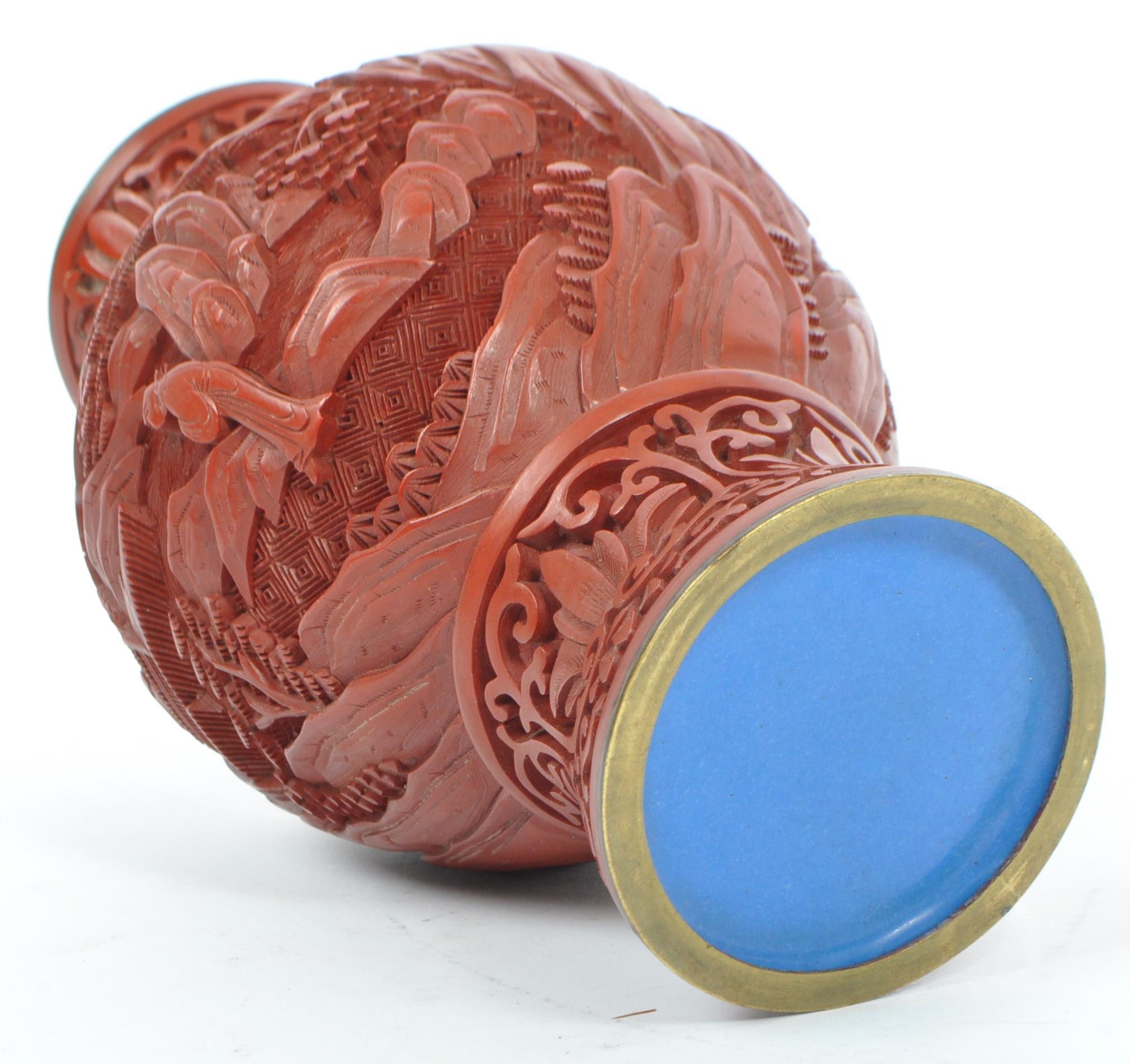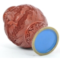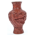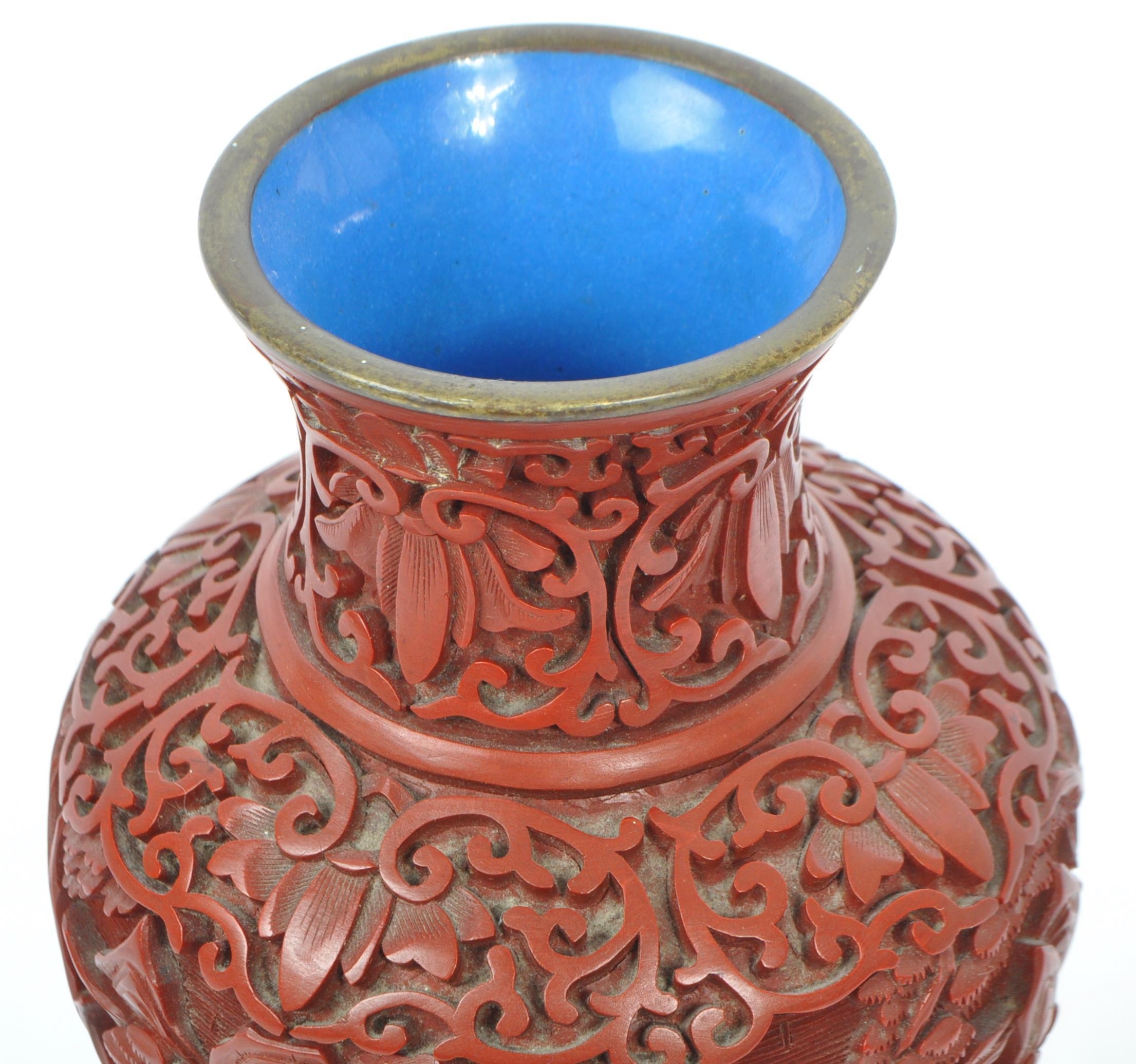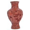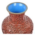 A 19th century Chinese cinnabar enamelled baluster vase. The vase having bronze rim with interior of blue enamel and the body being carved with village scenes. Measures 17cm tall.