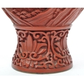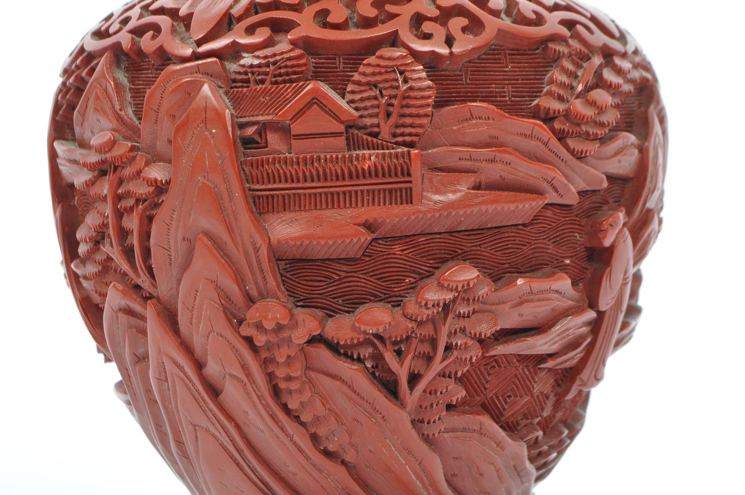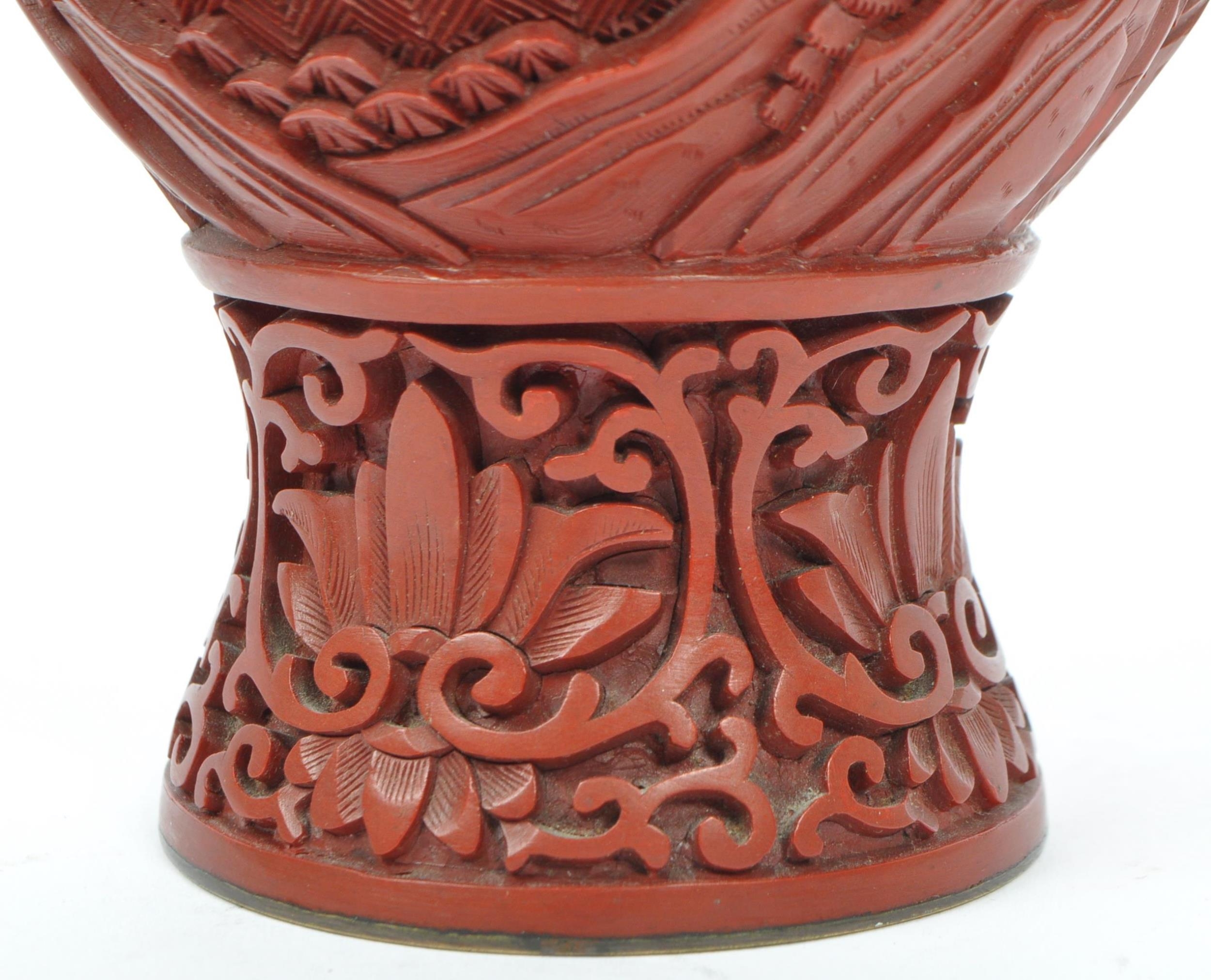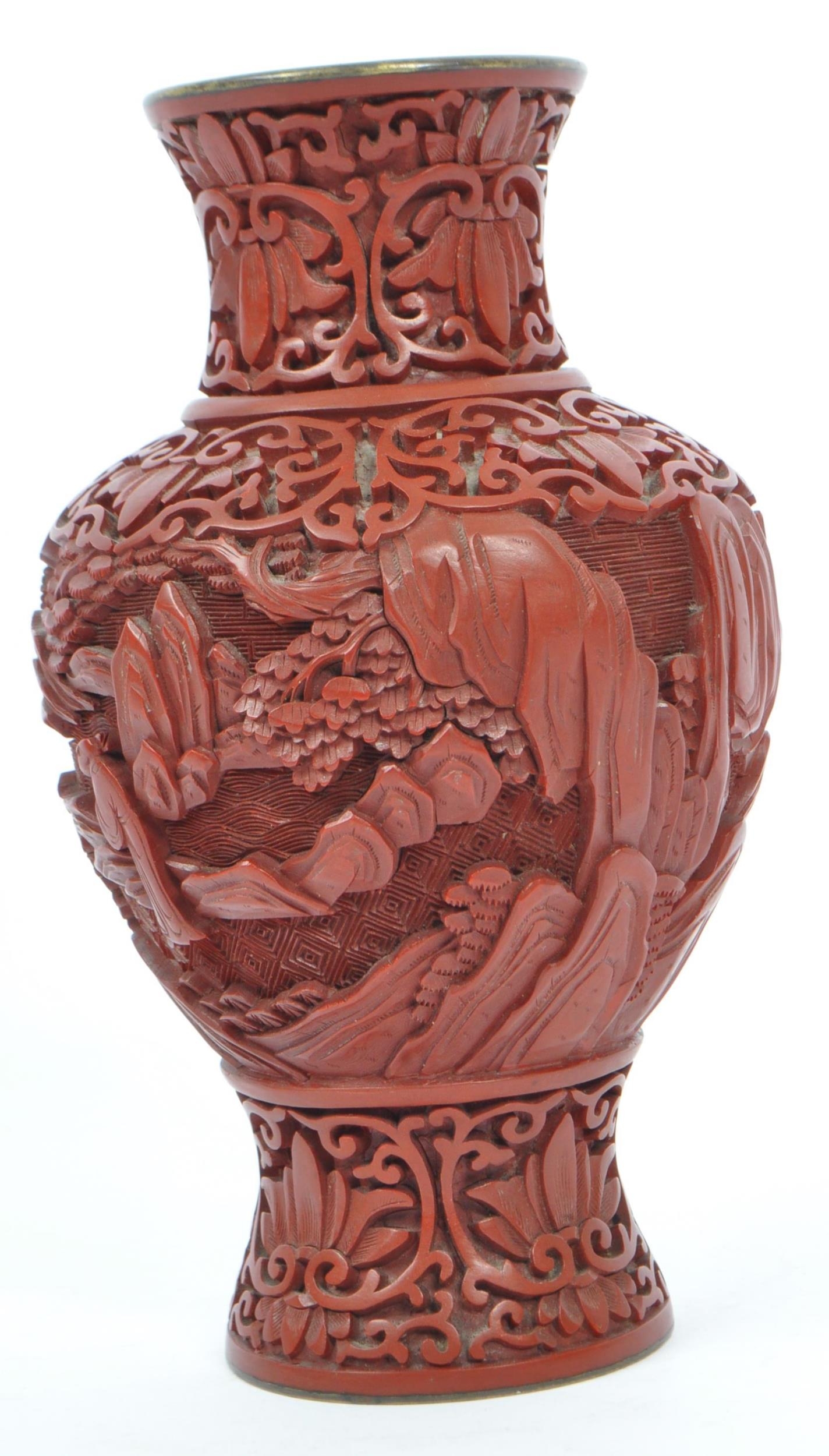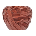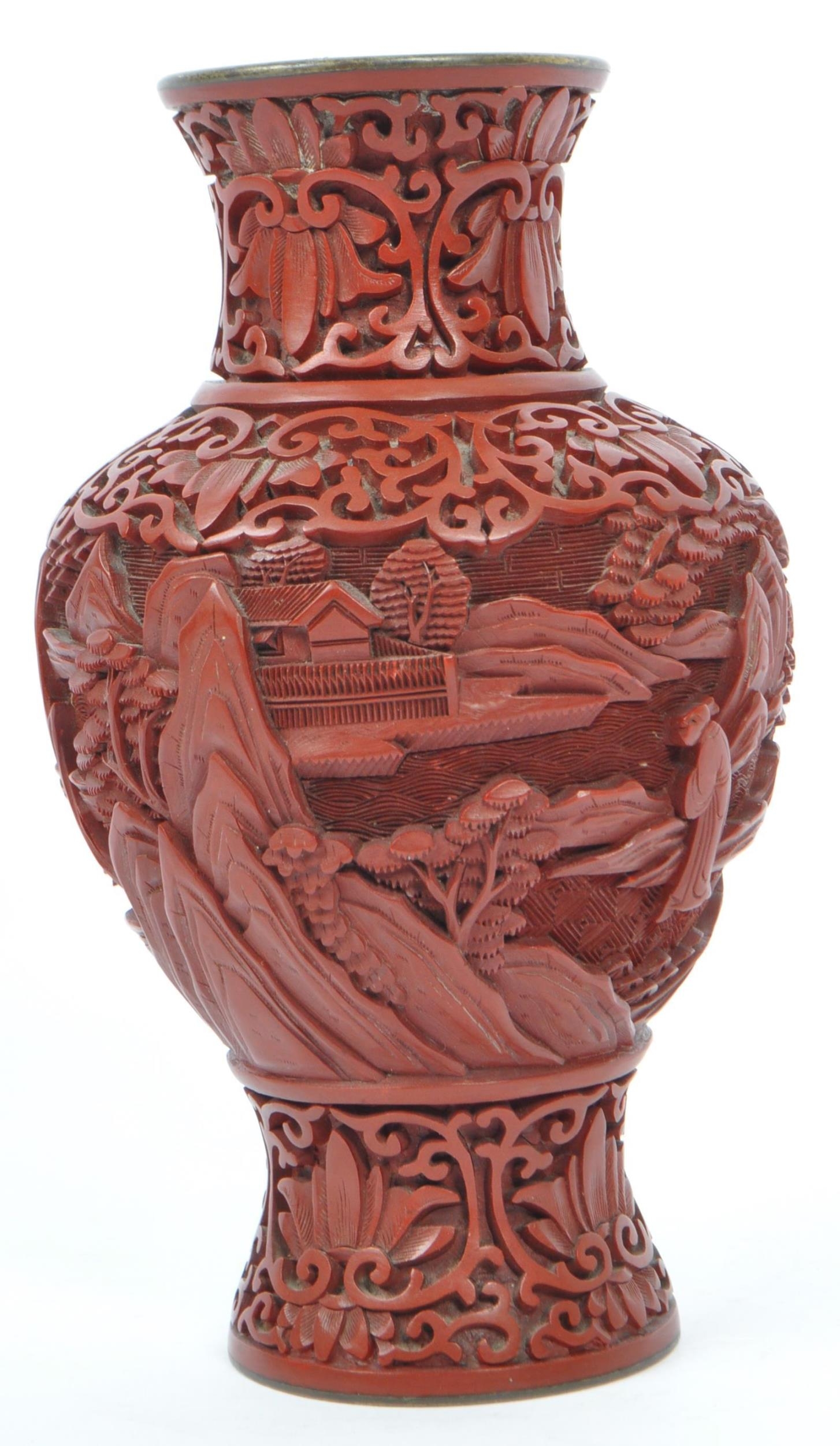 A 19th century Chinese cinnabar enamelled baluster vase. The vase having bronze rim with interior of blue enamel and the body being carved with village scenes. Measures 17cm tall.