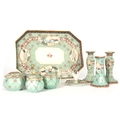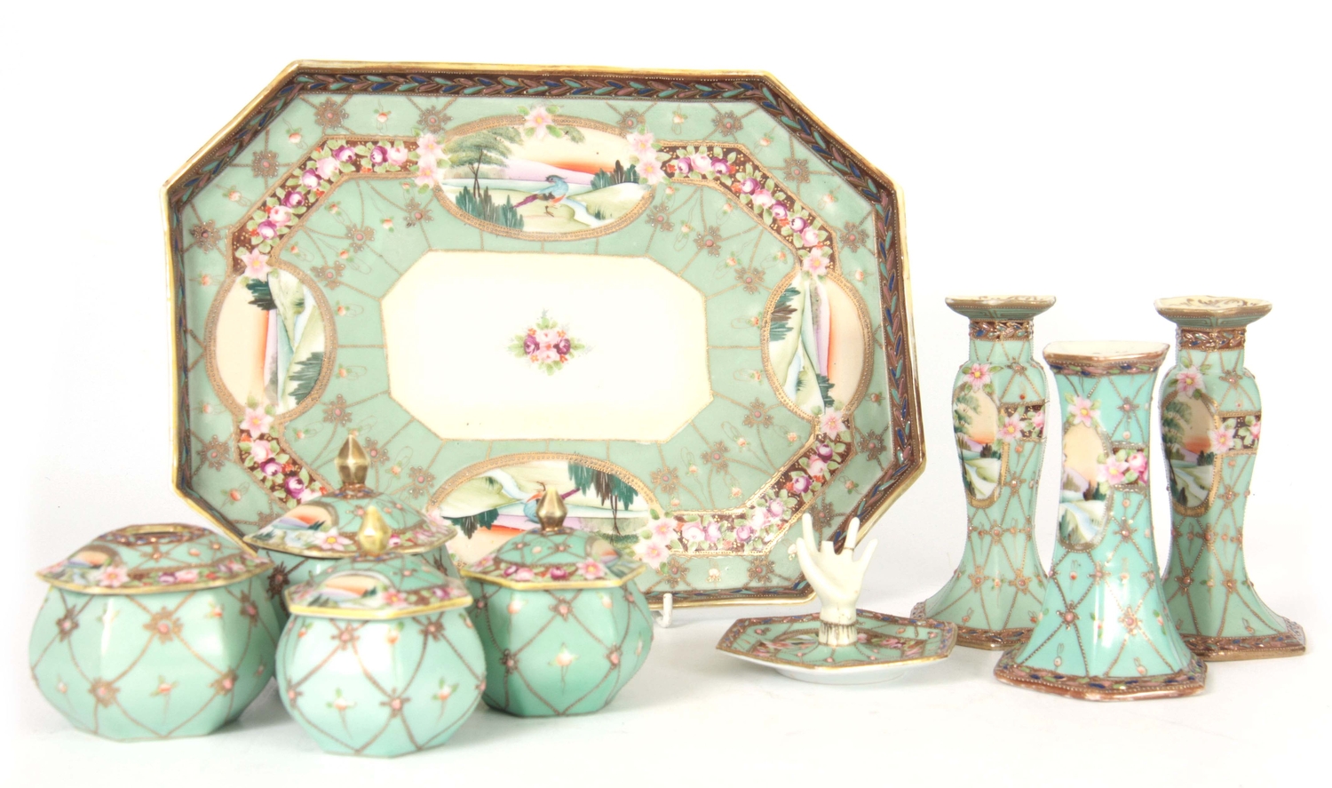 A JAPANESE NORITAKE TRINKET SET having a duck egg blue ground and floral band decoration inset with landscape scenes, 9 pieces in total