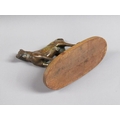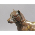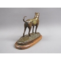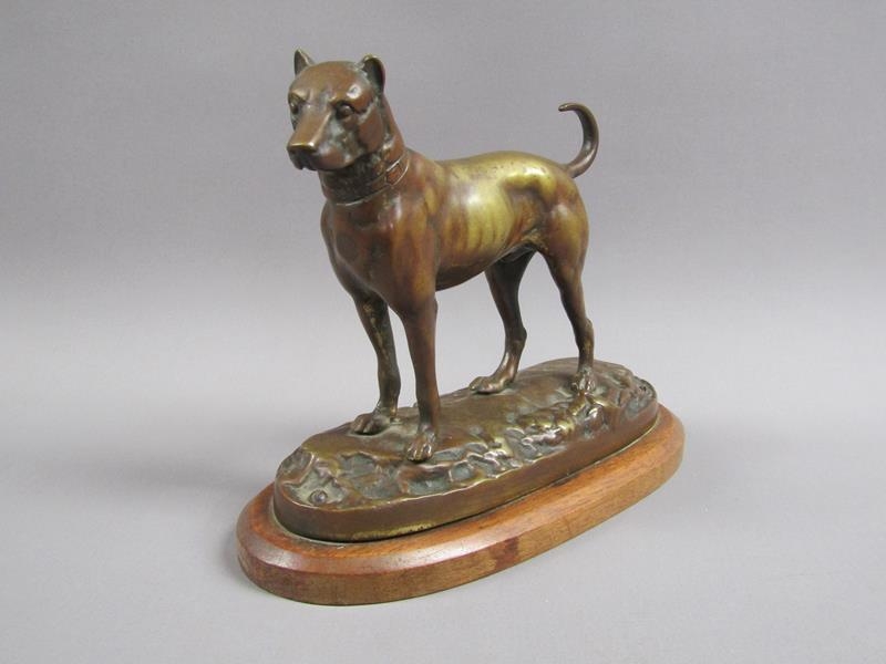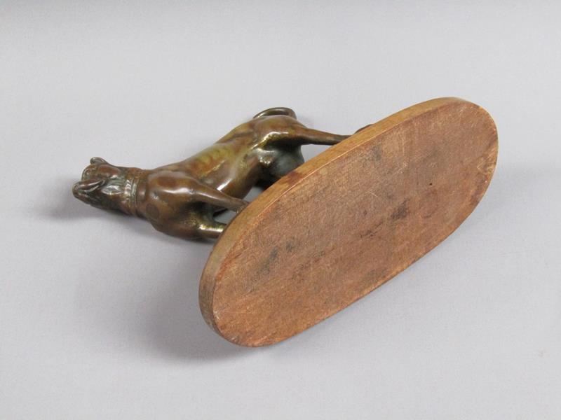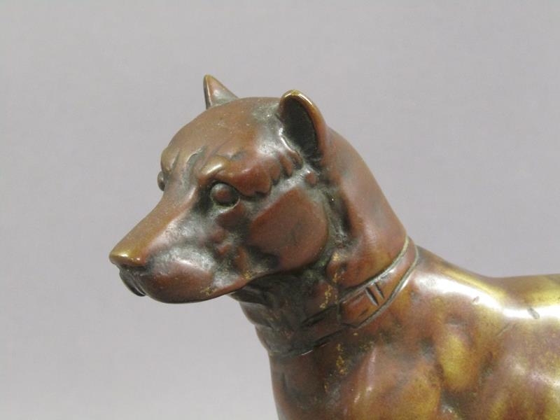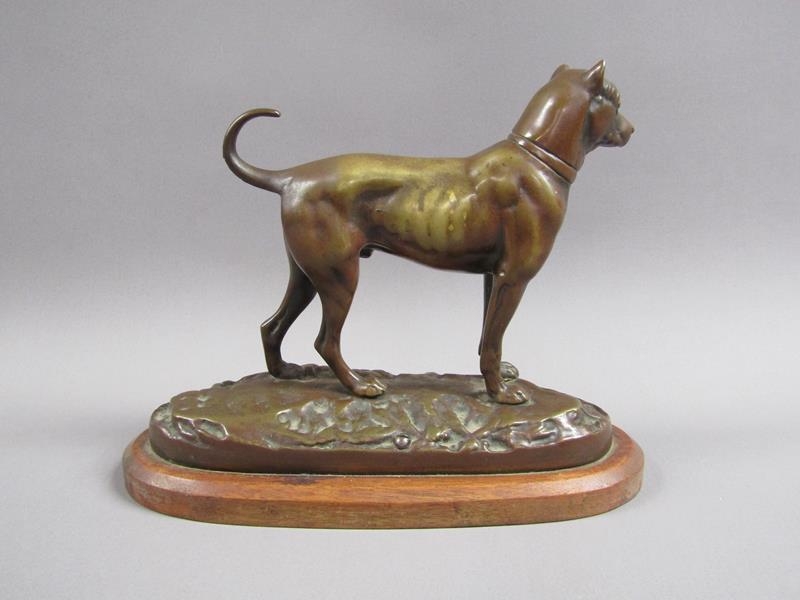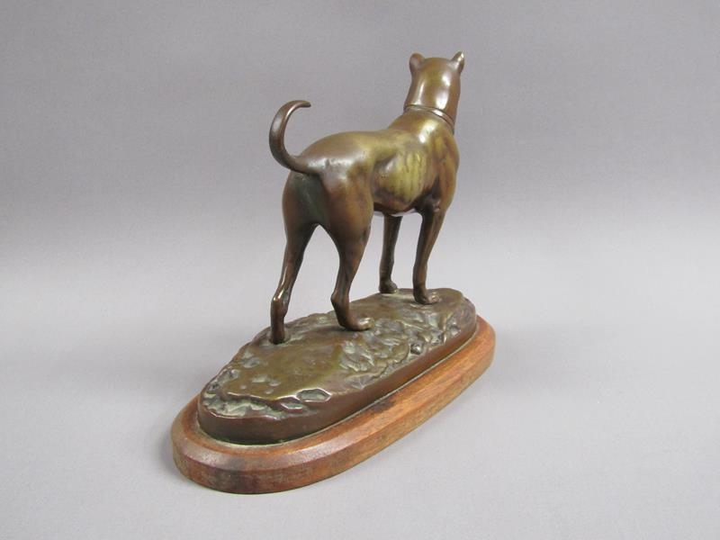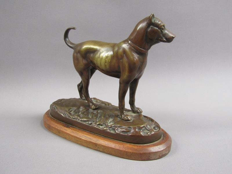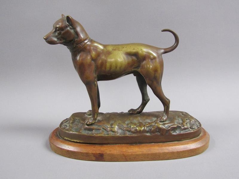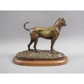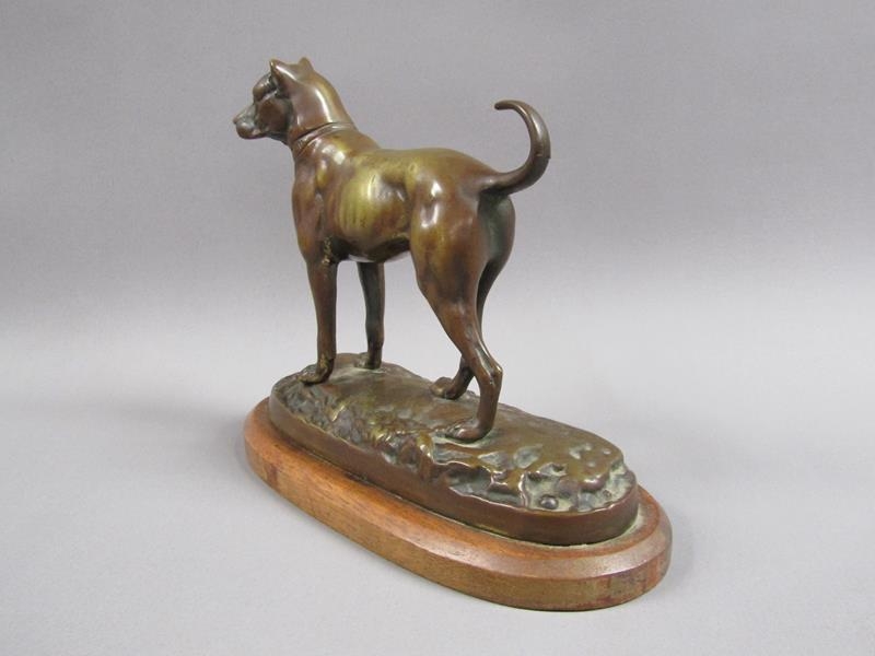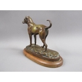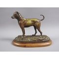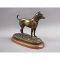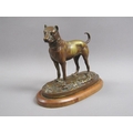 A 20c patinated bronze figure of a terrier dog, standing, and supported on a wooden base, 20cm w, 17cm h.