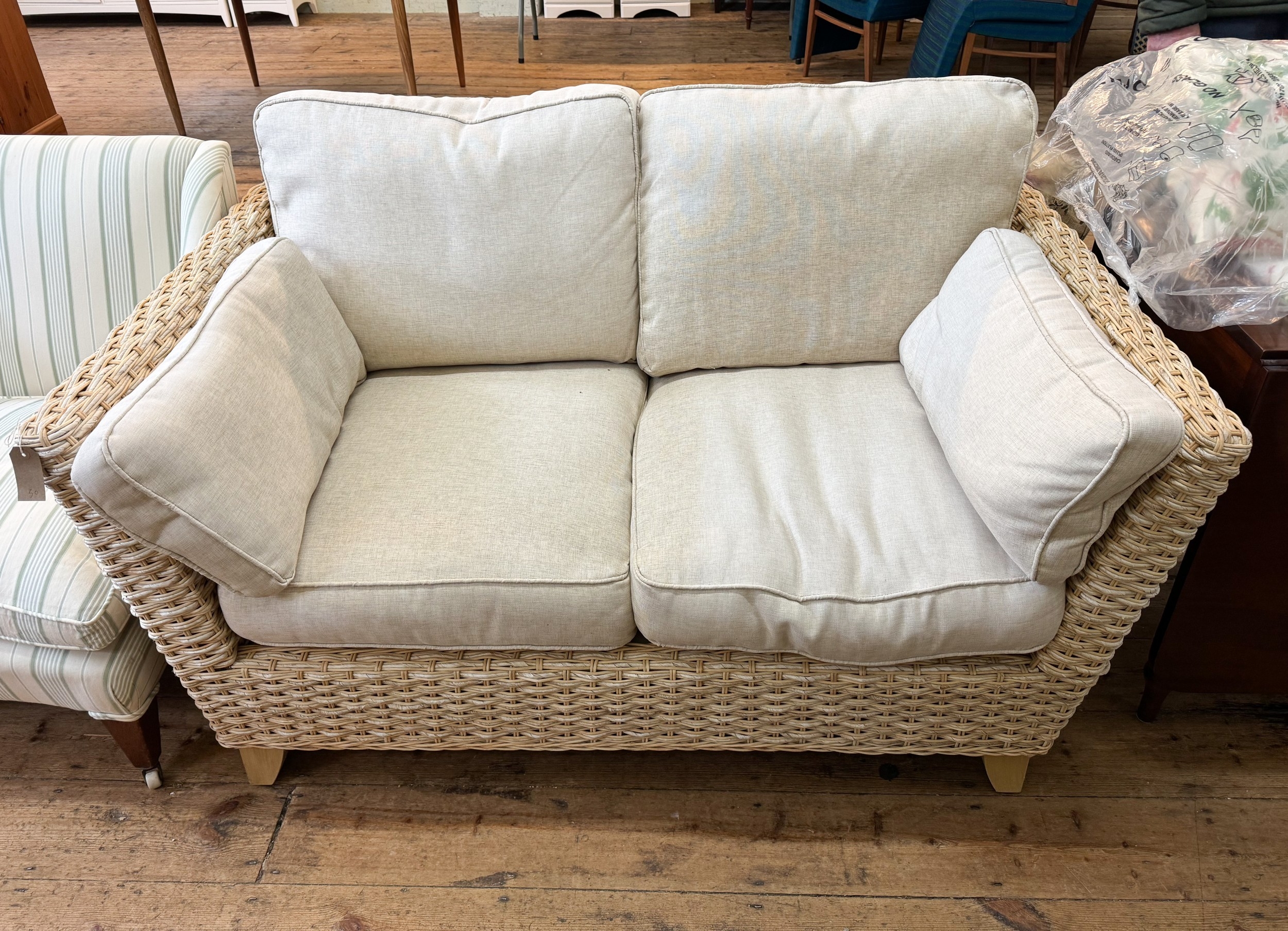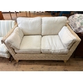 A modern wicker two seater conservatory sofa with pale beige linen cushions