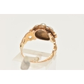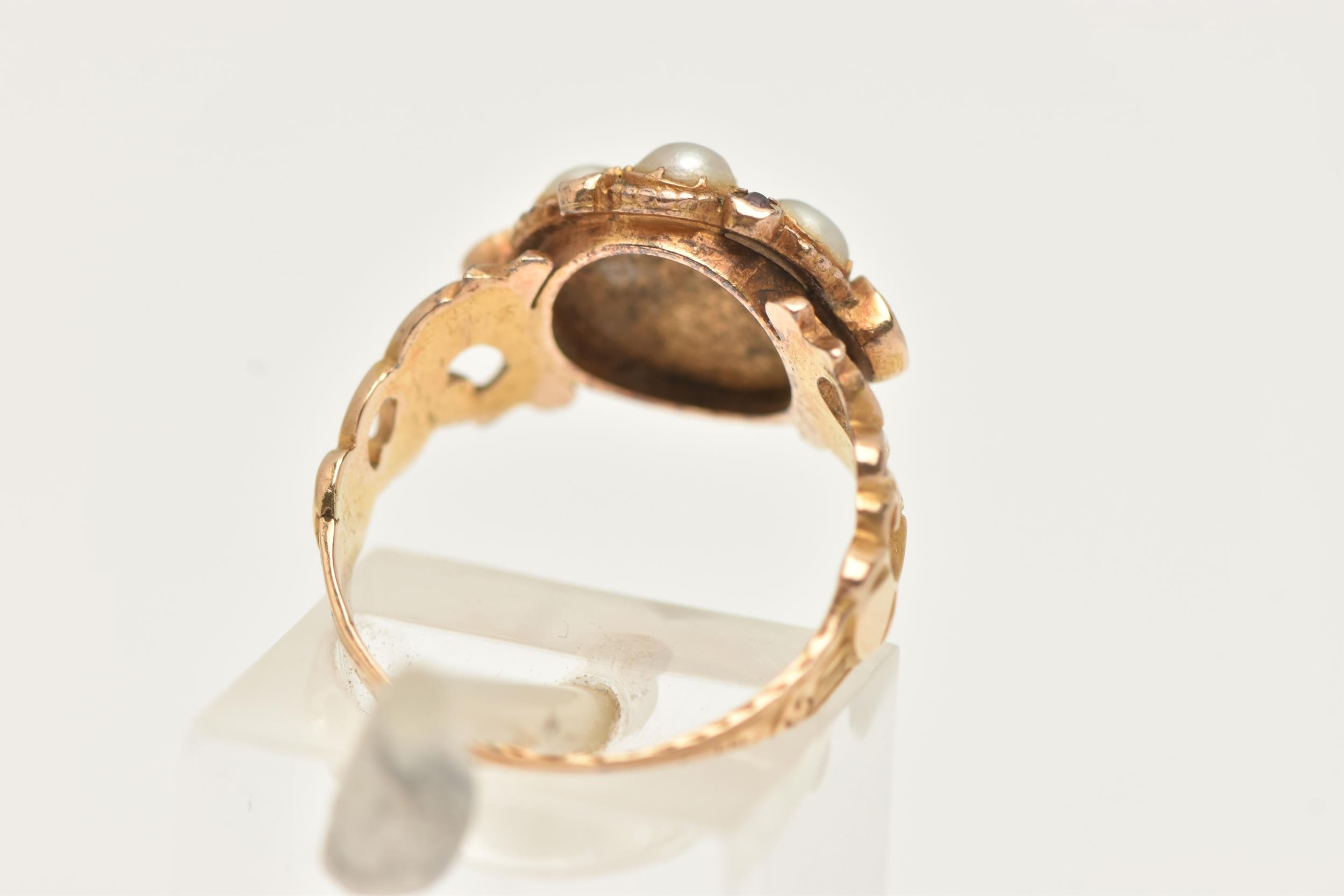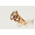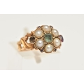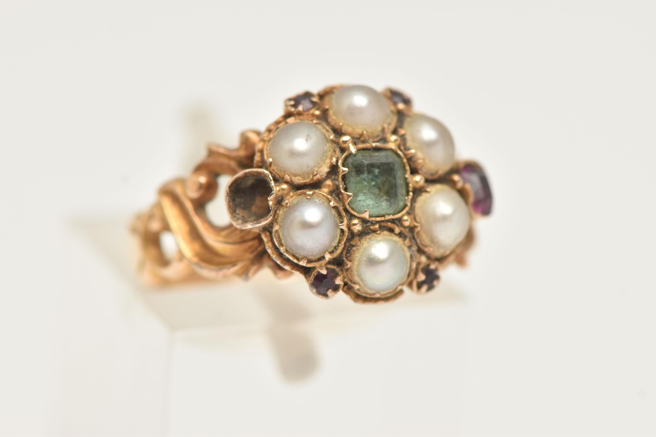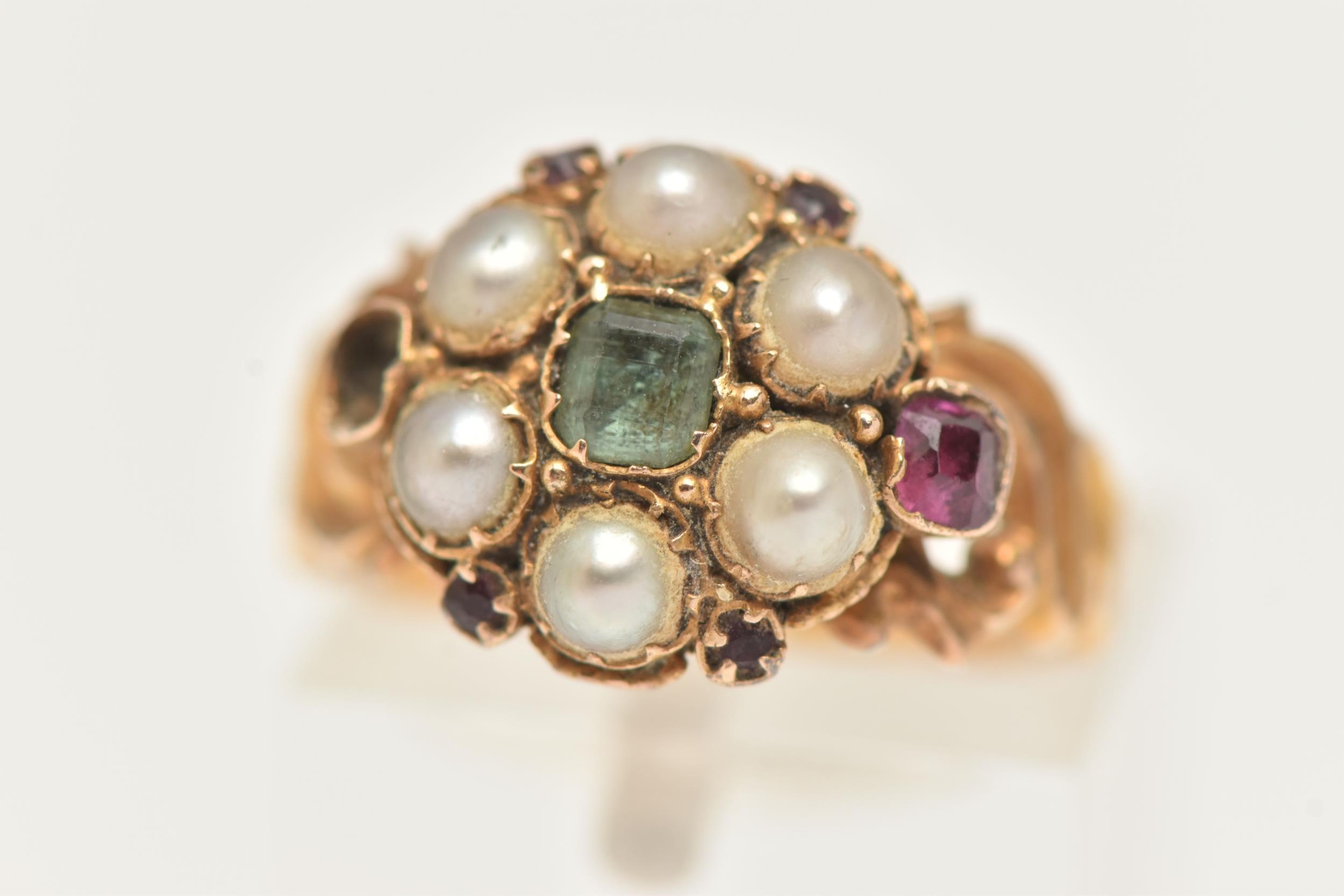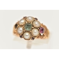 AN EARLY 20TH CENTURY 15CT GOLD CLUSTER RING, a floral cluster principally set with a light green square cut stone, a surround of six split pearls with pink spinel accents, milgrain detail leading on to scrolling shoulders, hallmarked 15ct Birmingham 1922, ring size K, approximate gross weight 3 grams (condition report: general moderate wear, one spinel missing from setting, would benefit from a gentle clean)