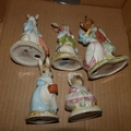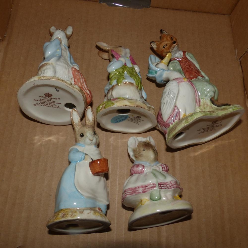Royal Albert Beatrix Potter figures Mrs Rabbit Cooking, Peter ate a Radish, Peter and the Red Pocket Handkerchief, Jemima Puddleduck with Foxy Whiskered Gentleman and The Old Woman who Lived in a Shoe Knitting (6).