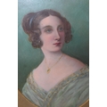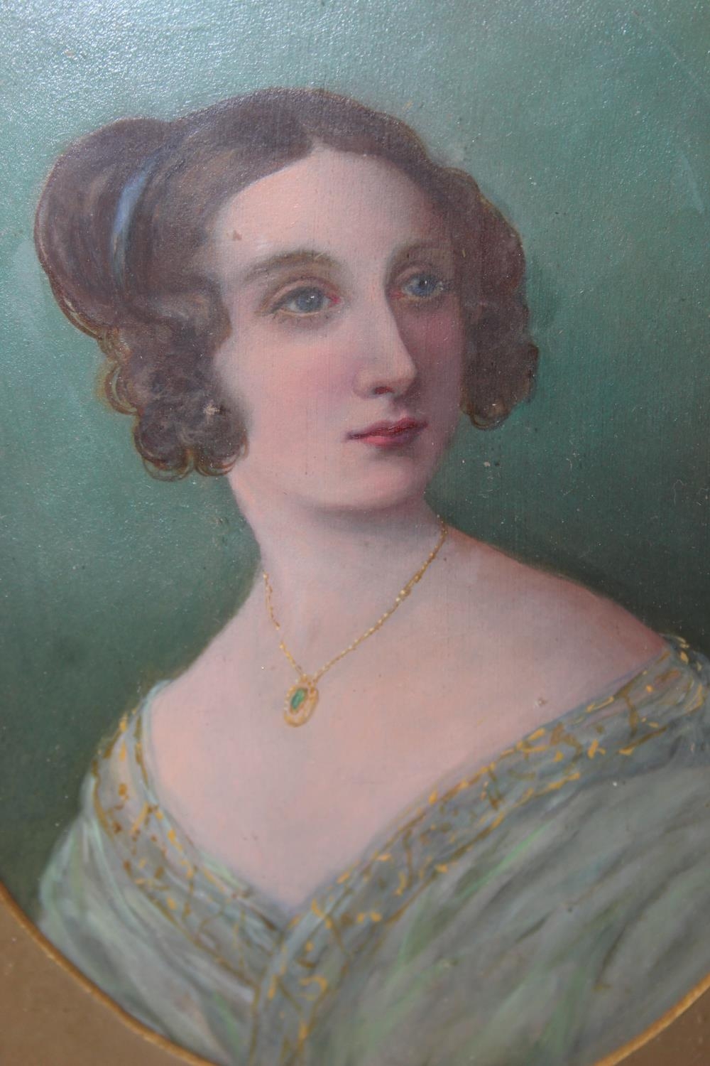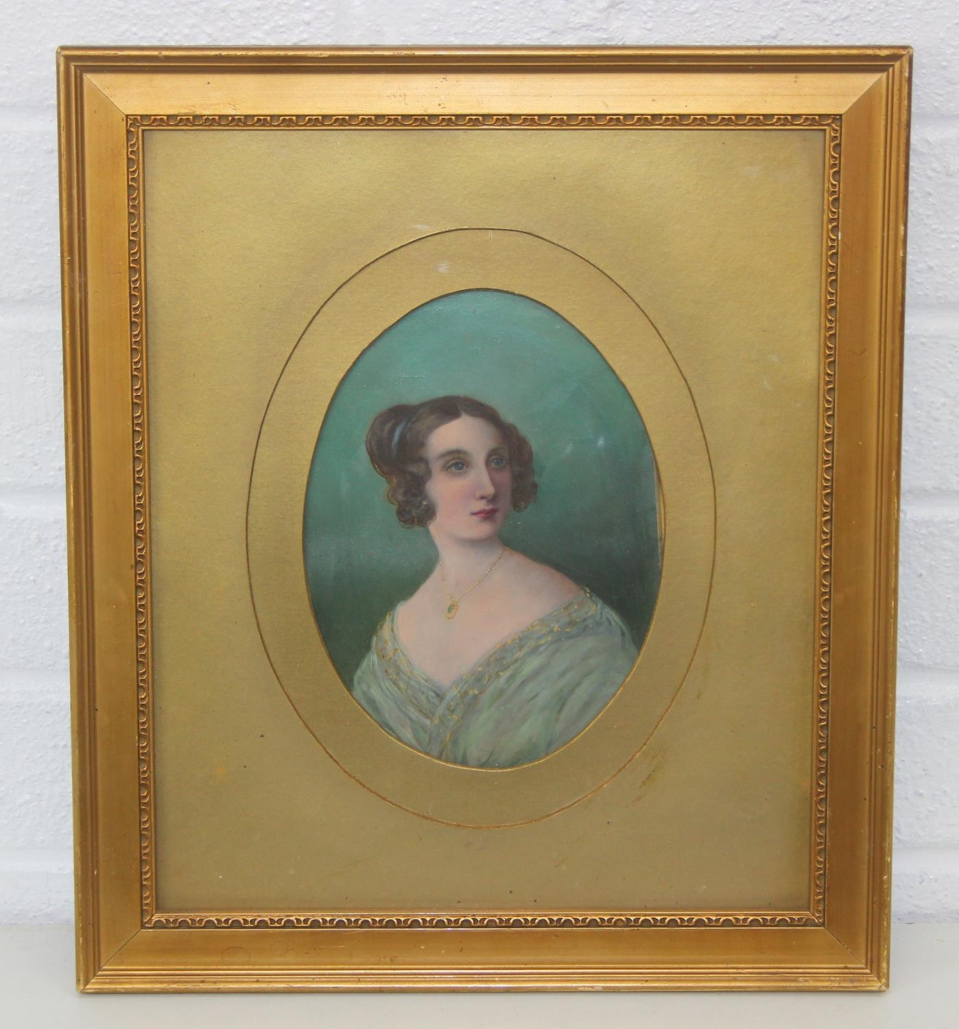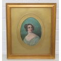 A 19th century watercolour of a female in turquoise dress, unsigned, possibly an overpainted print, in oval mount and gilt frame, 37cm x 32cm