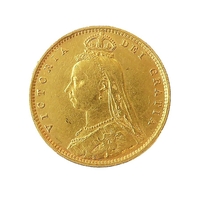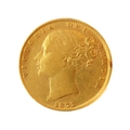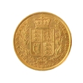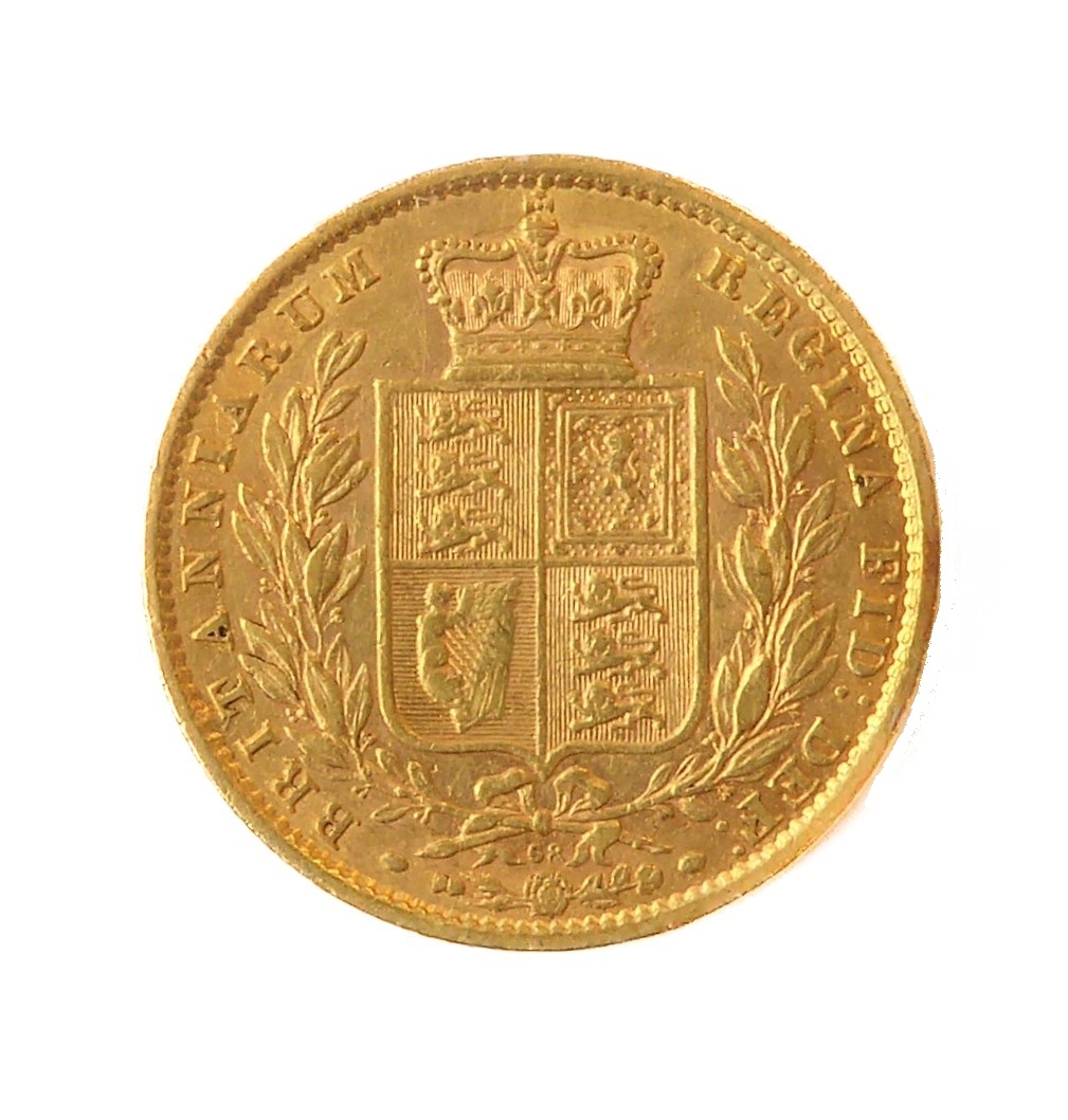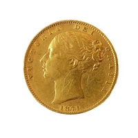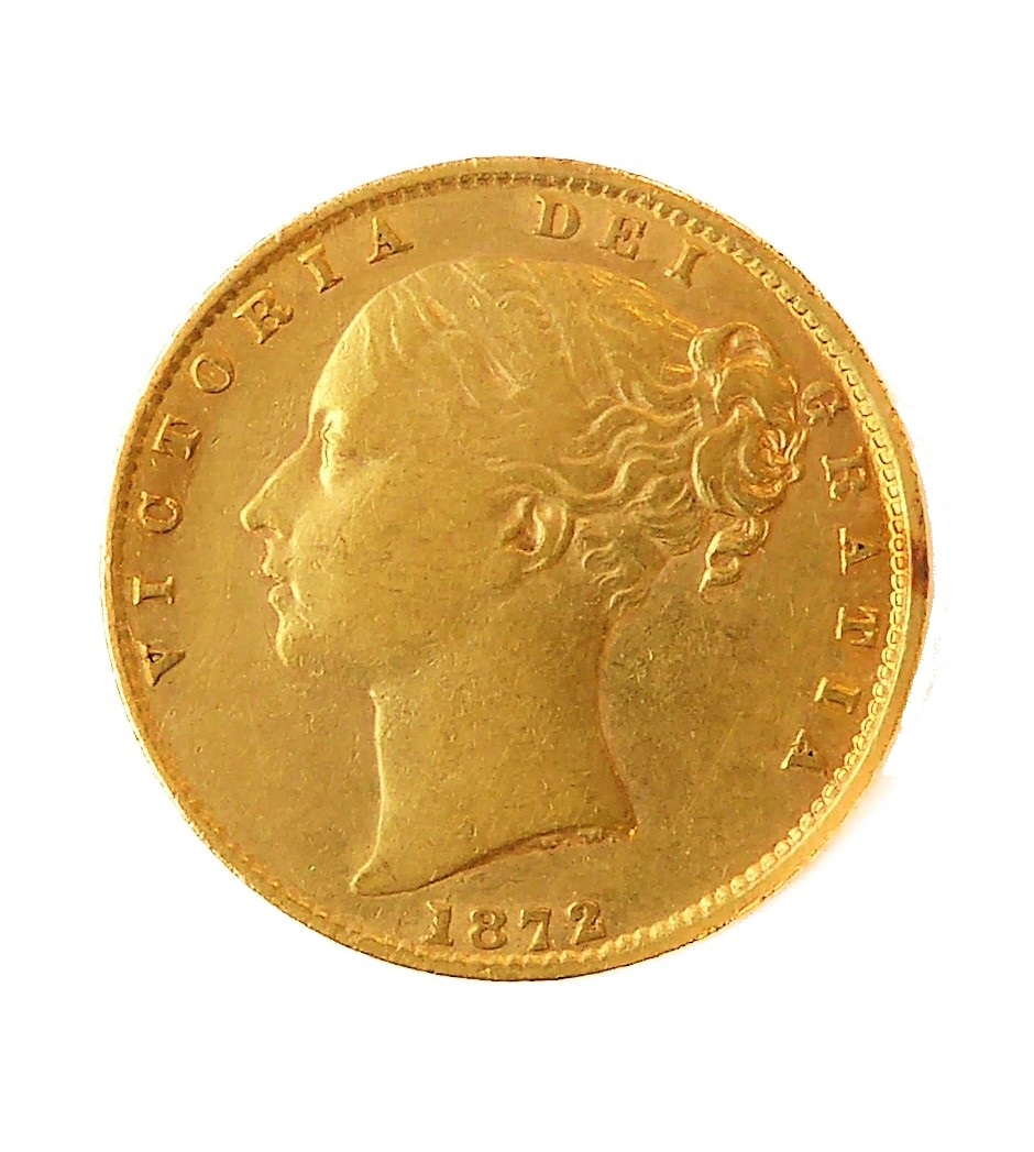 An 1872 gold sovereign (young head obverse and royal arms reverse).