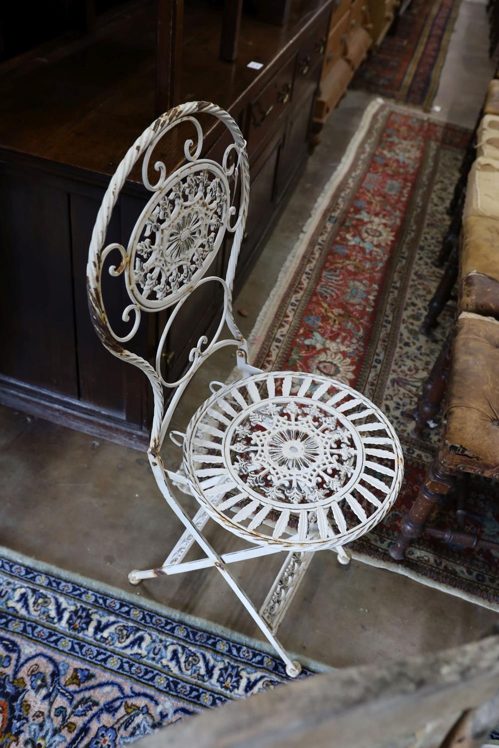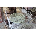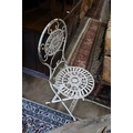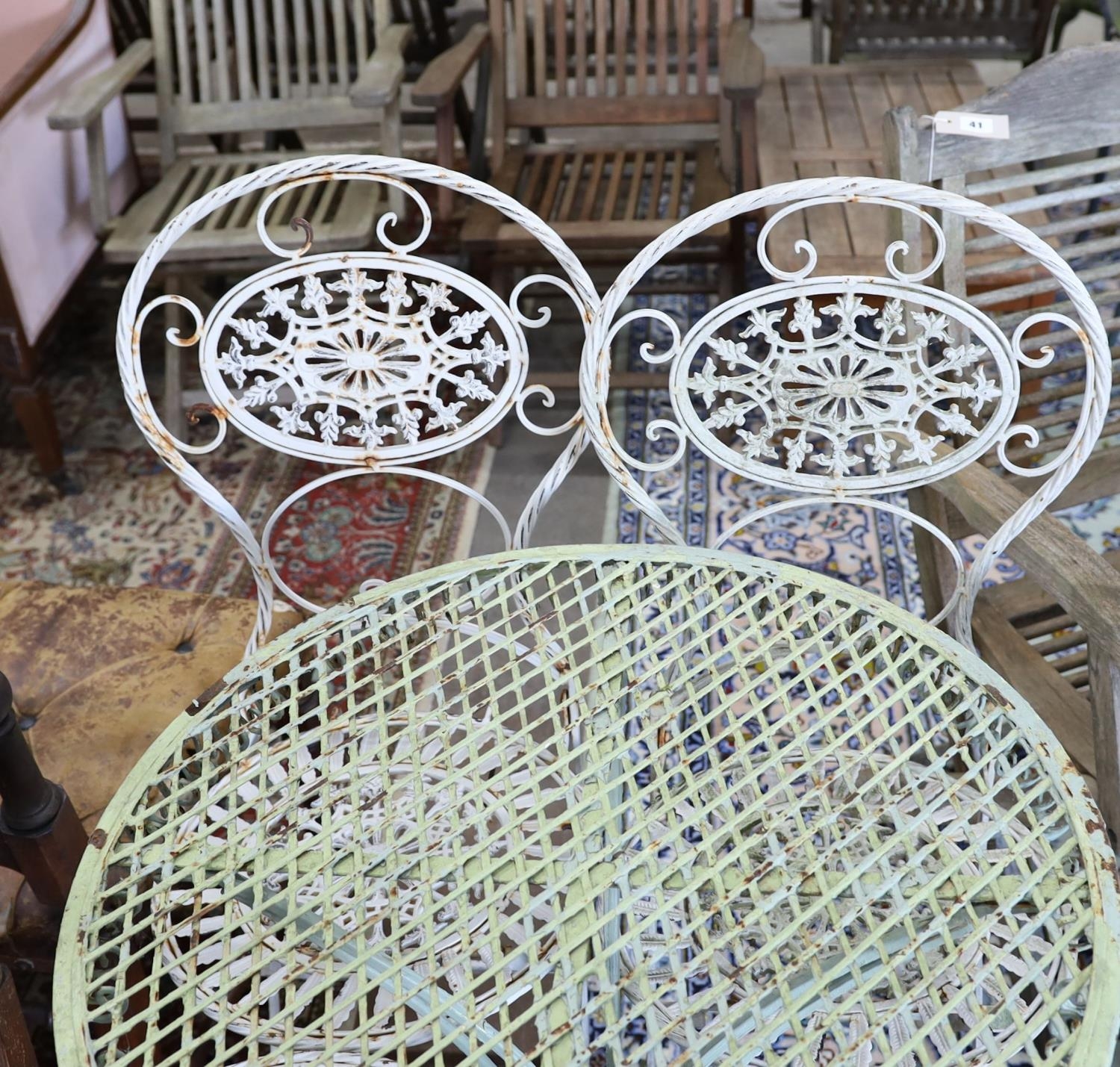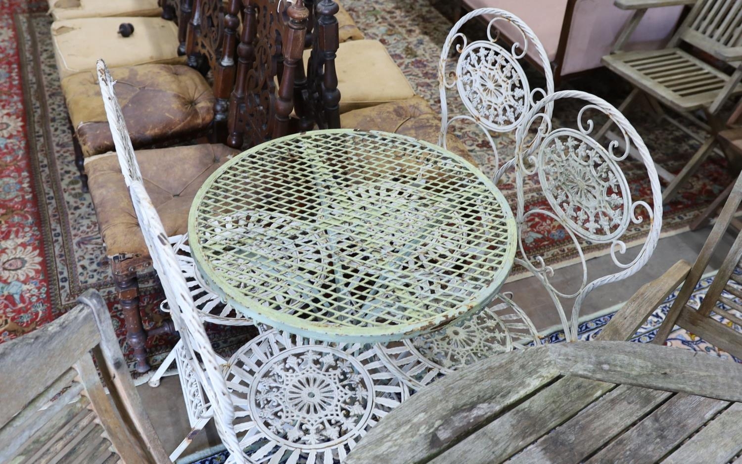 A wrought iron circular garden table, diameter 65cm, height 74cm and four folding chairs