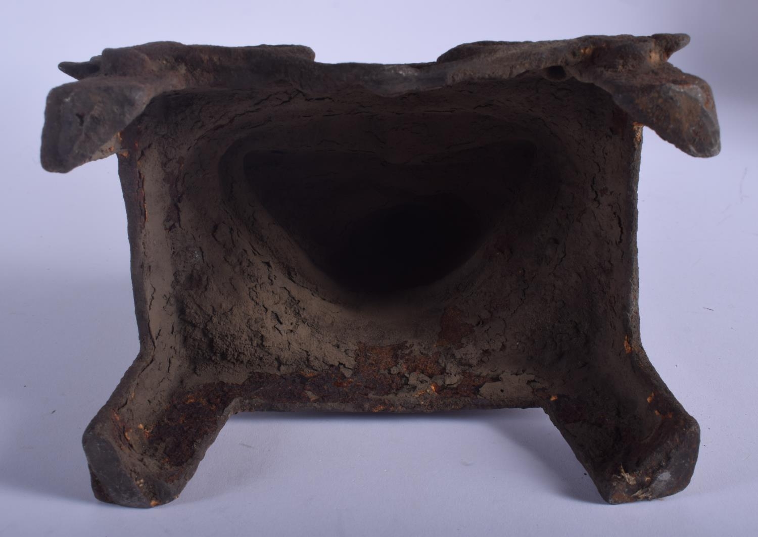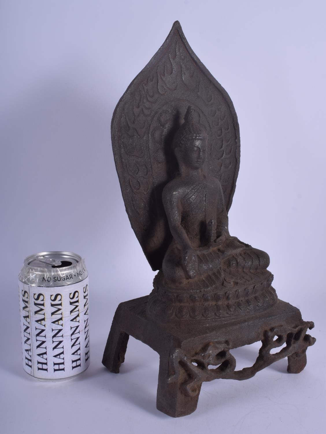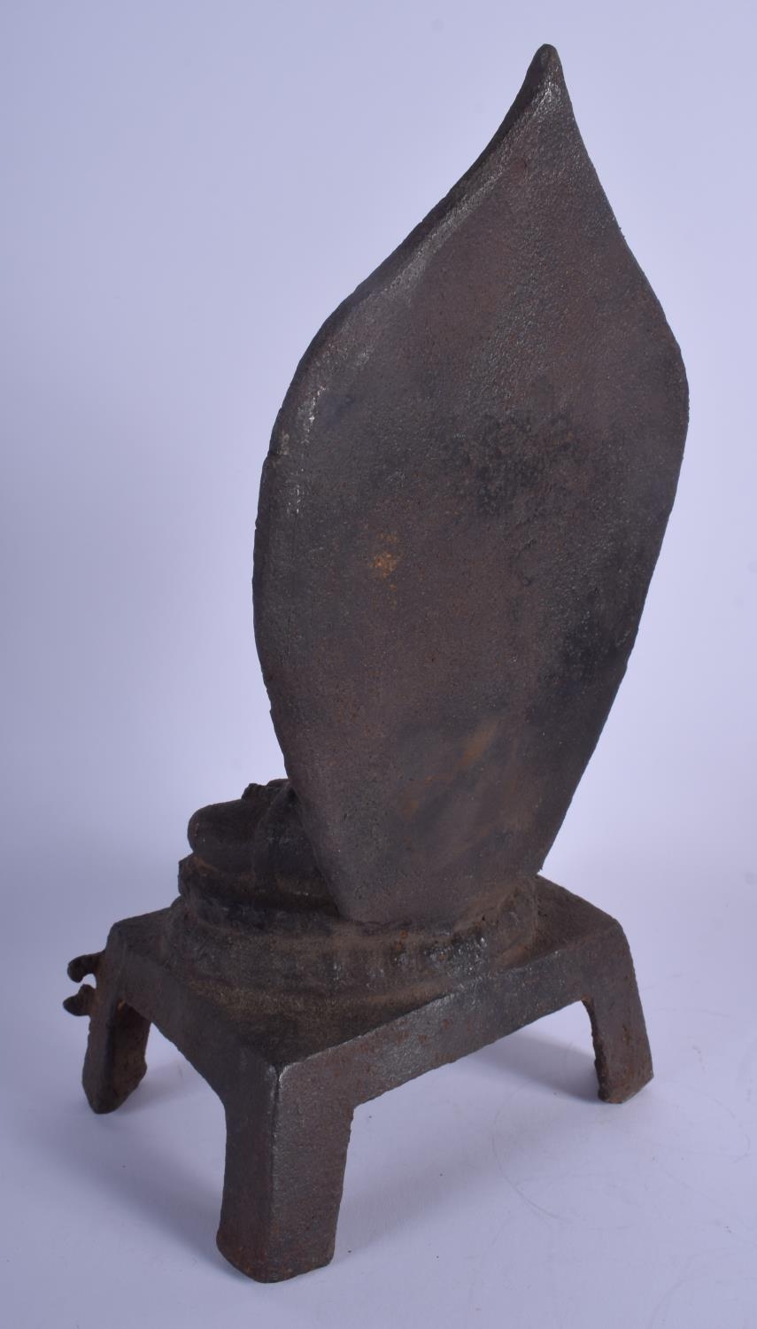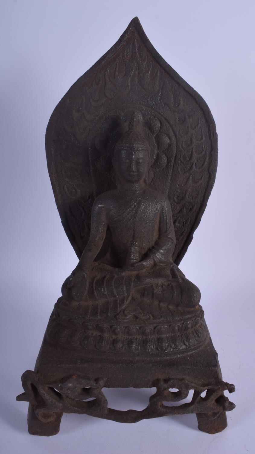 AN EARLY 20TH CENTURY CHINESE IRON FIGURE OF A BUDDHA modelled holding a stupa upon an openwork base. 35 cm x 13 cm.
