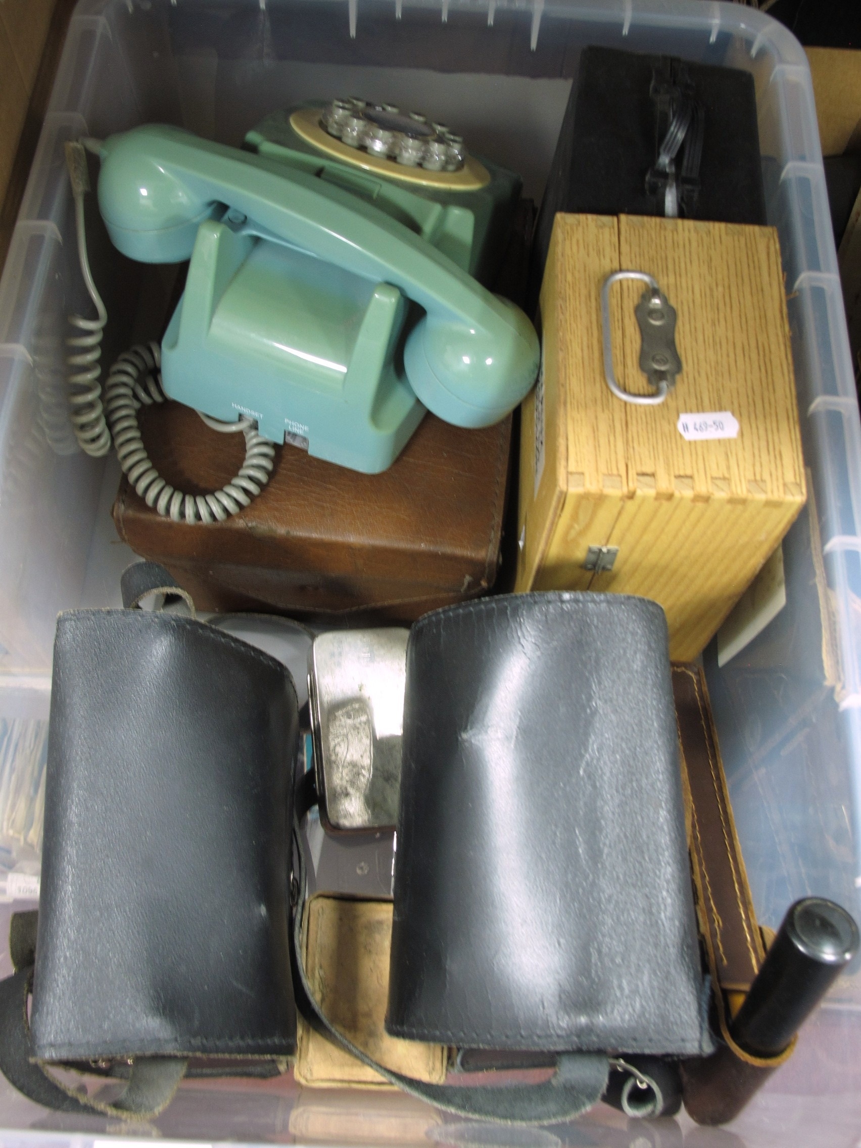Two cased Junior pigeon timing clocks, leather cased AVO Avometer Eight MK6, leather cased Air Thermometer with Tubes, wooden cased Marley Zoom 900 microscope and one boxed example, vintage rotary telephone etc. One box.