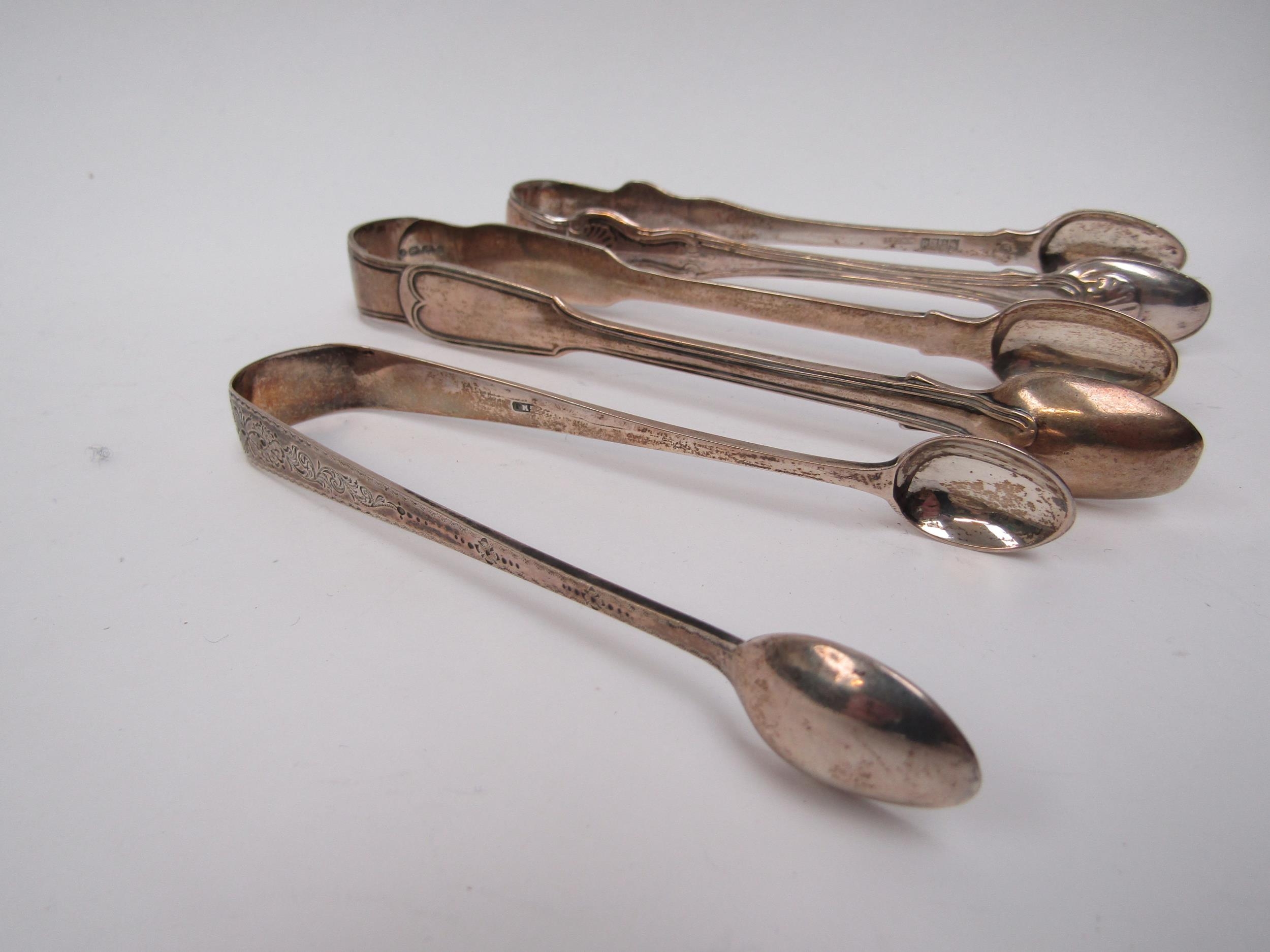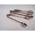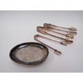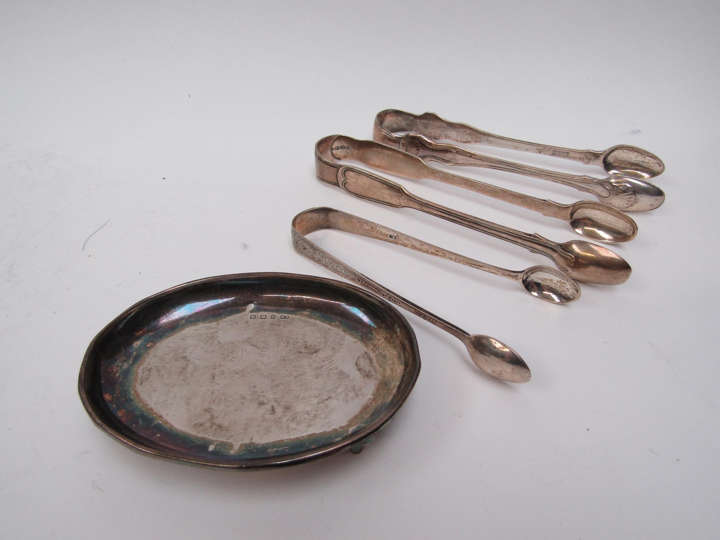 A silver pin dish and three pairs of silver sugar tongs, various makers and dates, 206g
