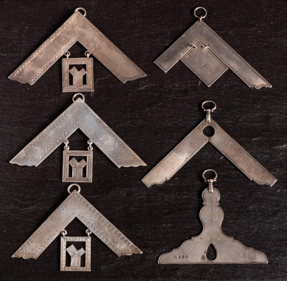Six silver Masonic suspensions: one for Senior warden, one for Master of the Lodge and four for Past Masters, various makers and dates, 9.2oz
