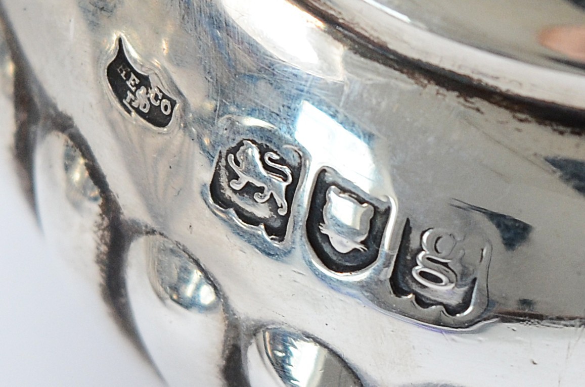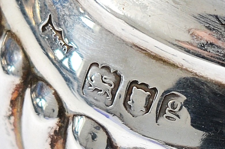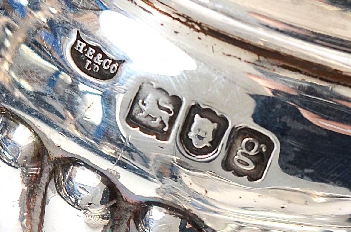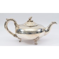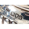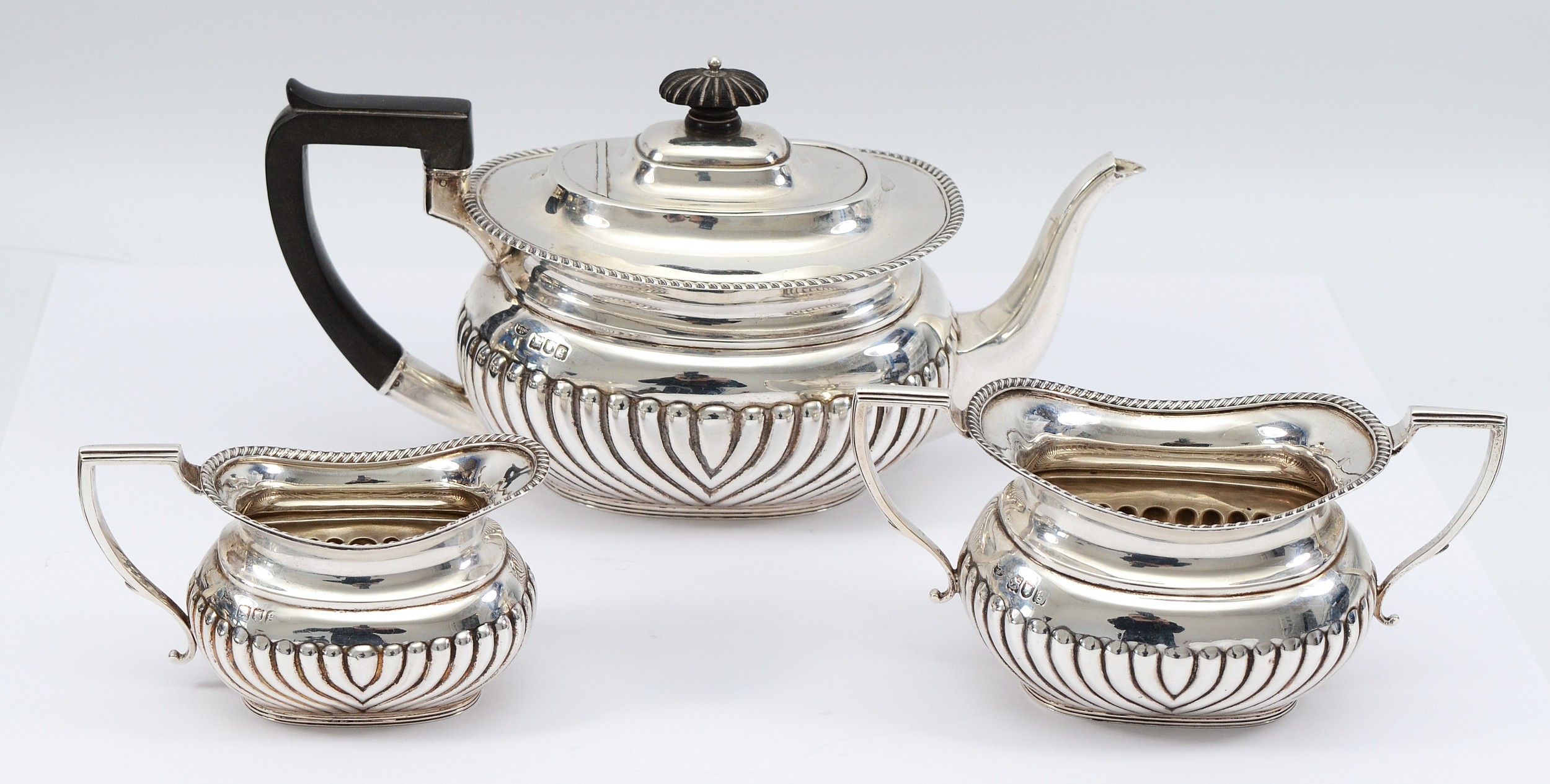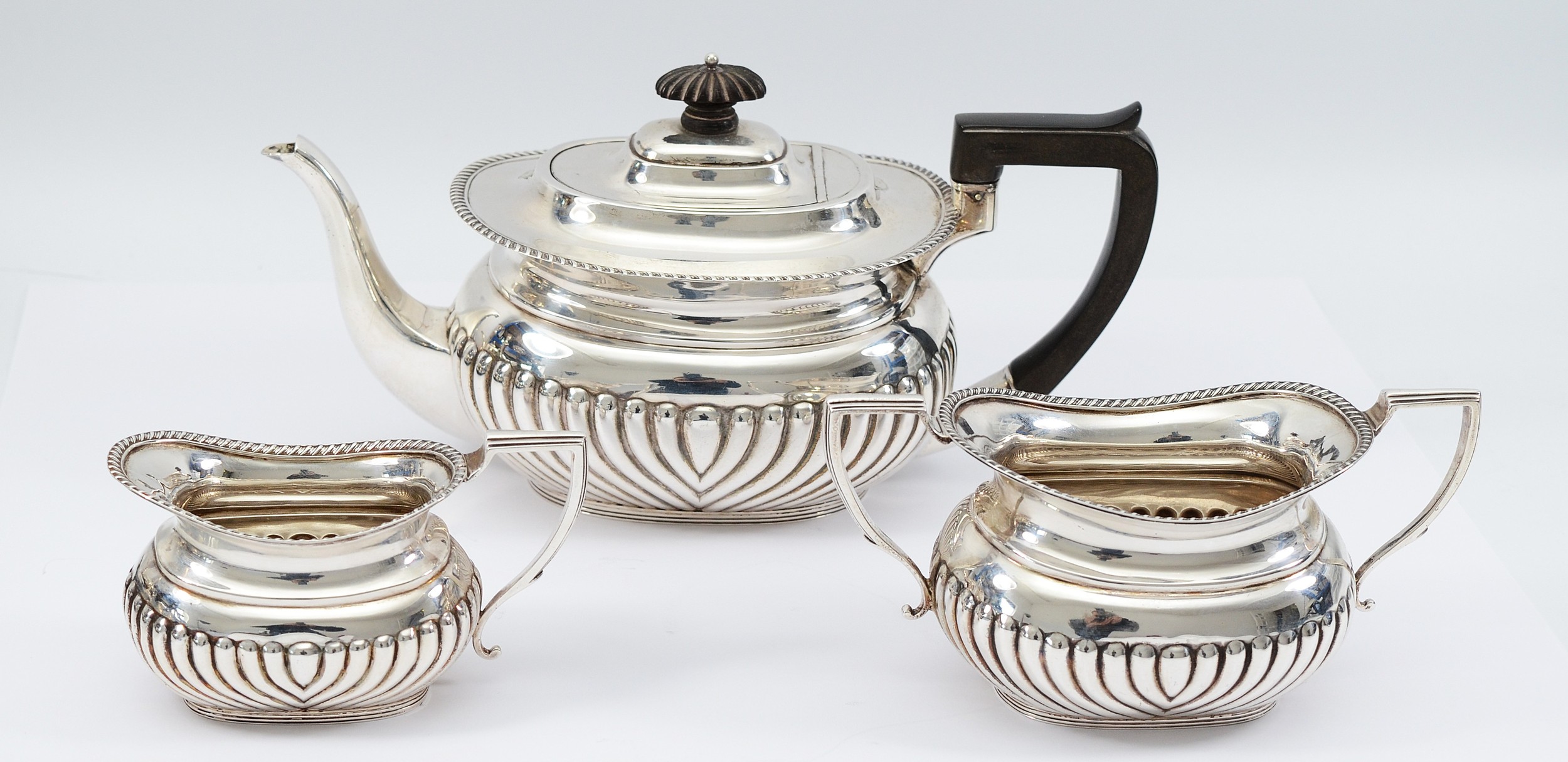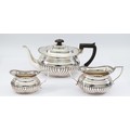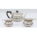 An Edwardian silver tea set, London 1902, by Hawksworth, Eyre & Co Ltd, compromising of a silver teapot, having wood handle, with embossed gadrooned decoration to the sides, 16x12cm, a matching twin handled silver sugar bowl and milk jug, 800gm.