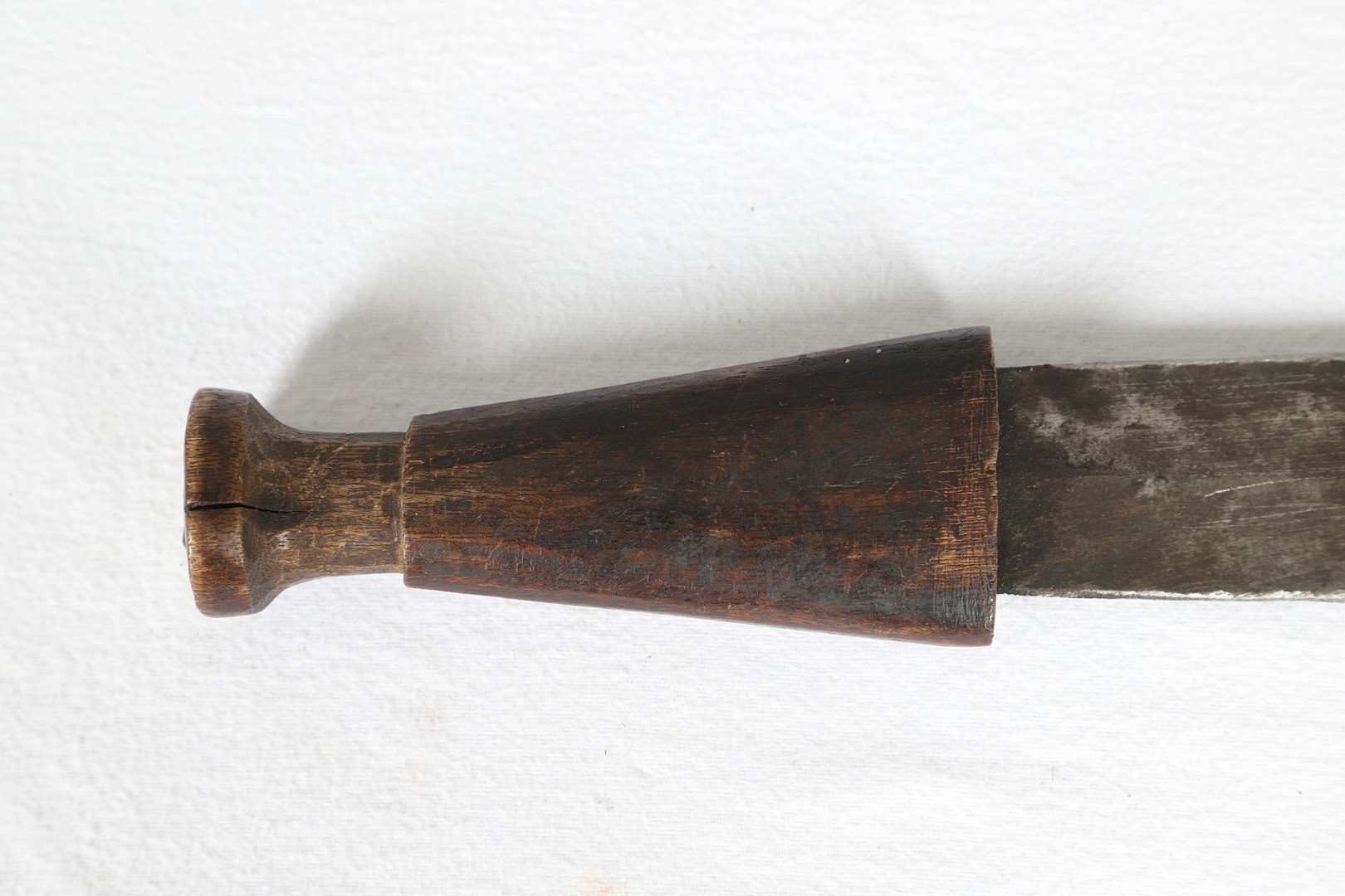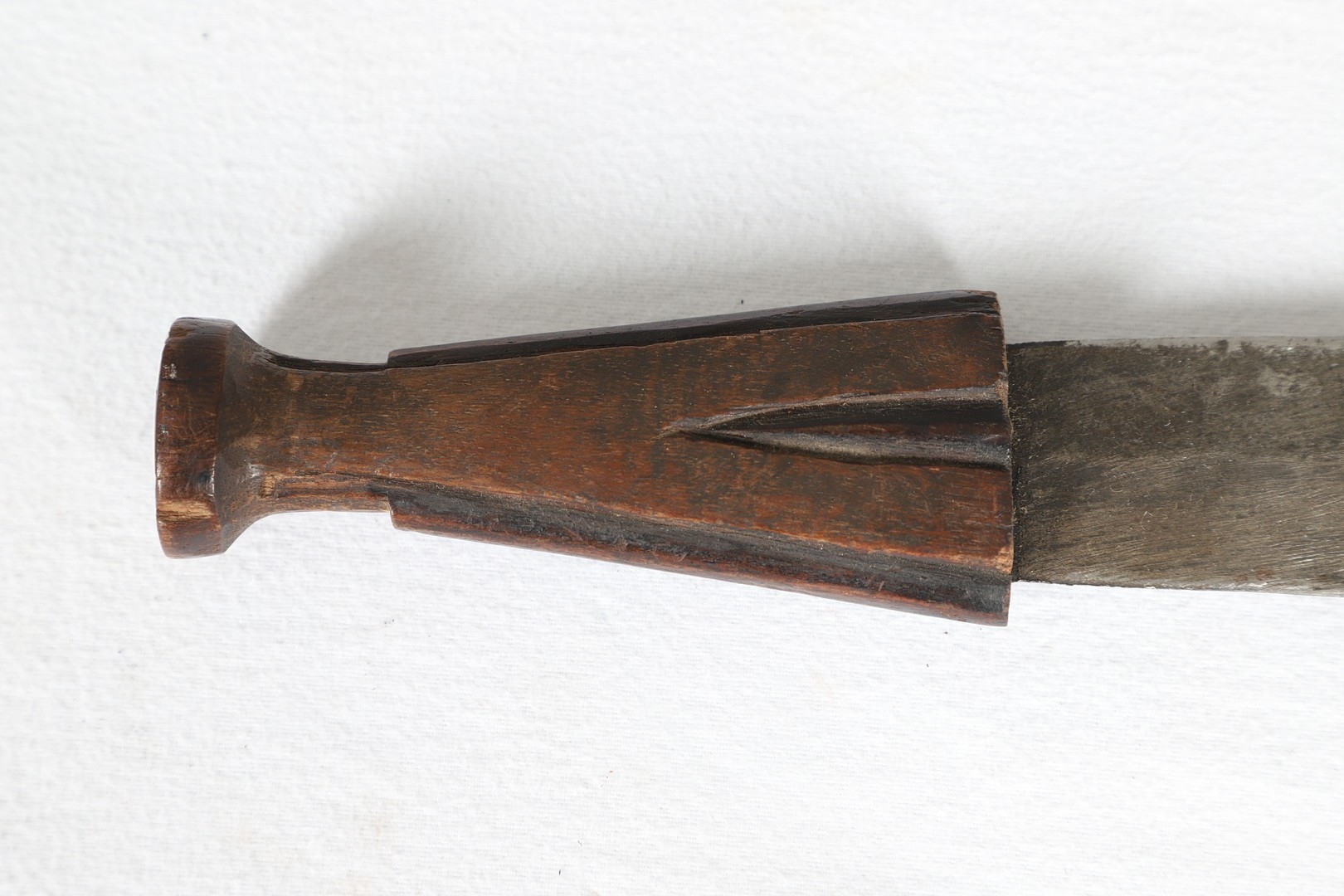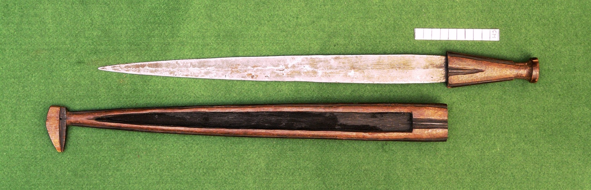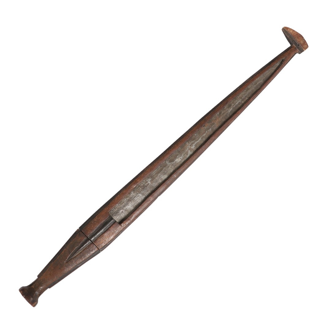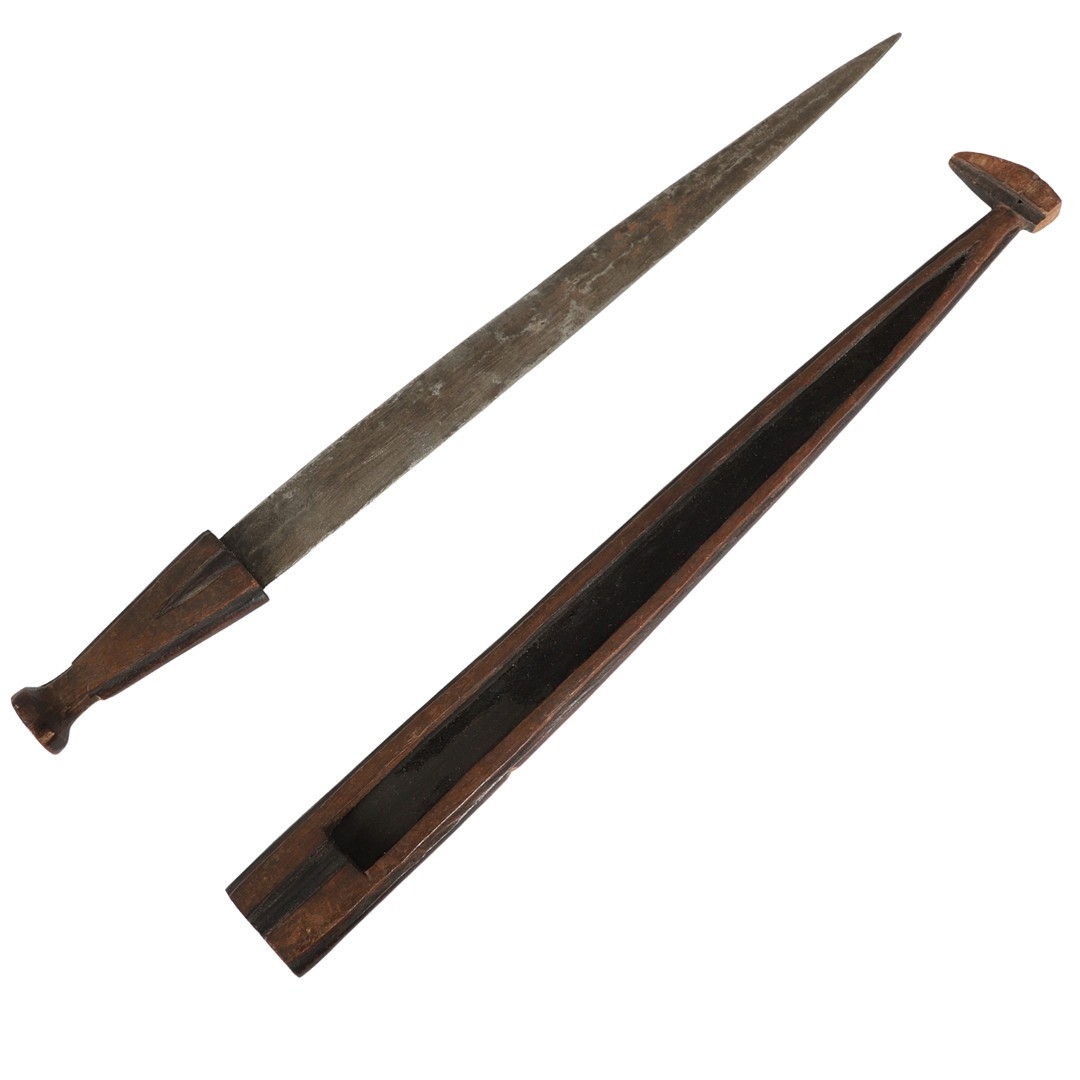 AN AMBO OR OVAMBO KNIFE AND SCABBARD, NORTHERN NAMIBIA. The 41 cm straight pointed blade with central spine and sharpened edges. On a slender wooden grip with circular flared pommel. In a matching scabbard with cut-away section and pierced holes for wear, with distinctive curved lower end. 57 cm.
