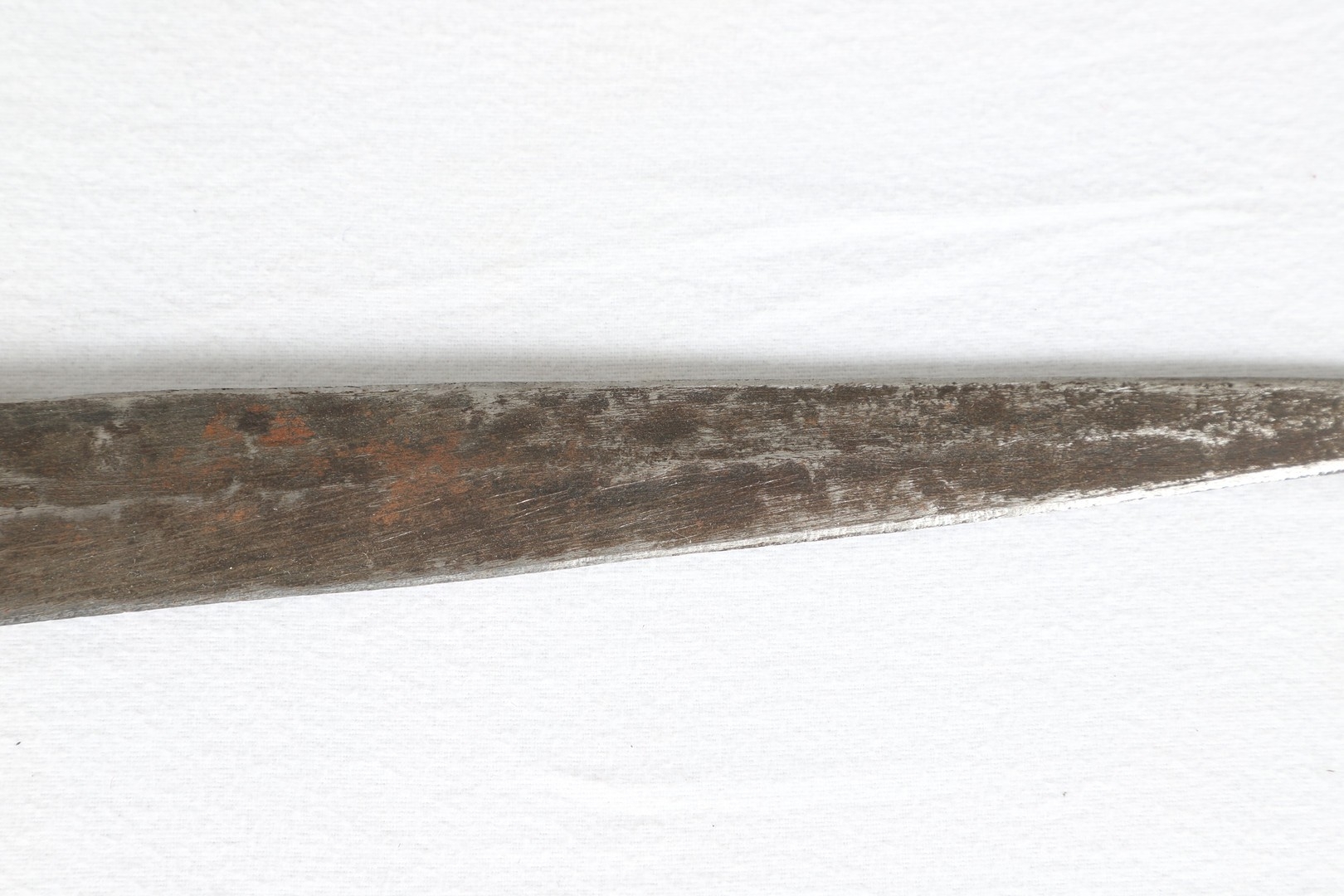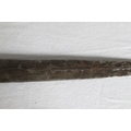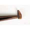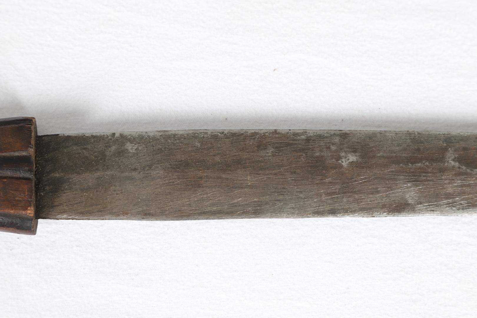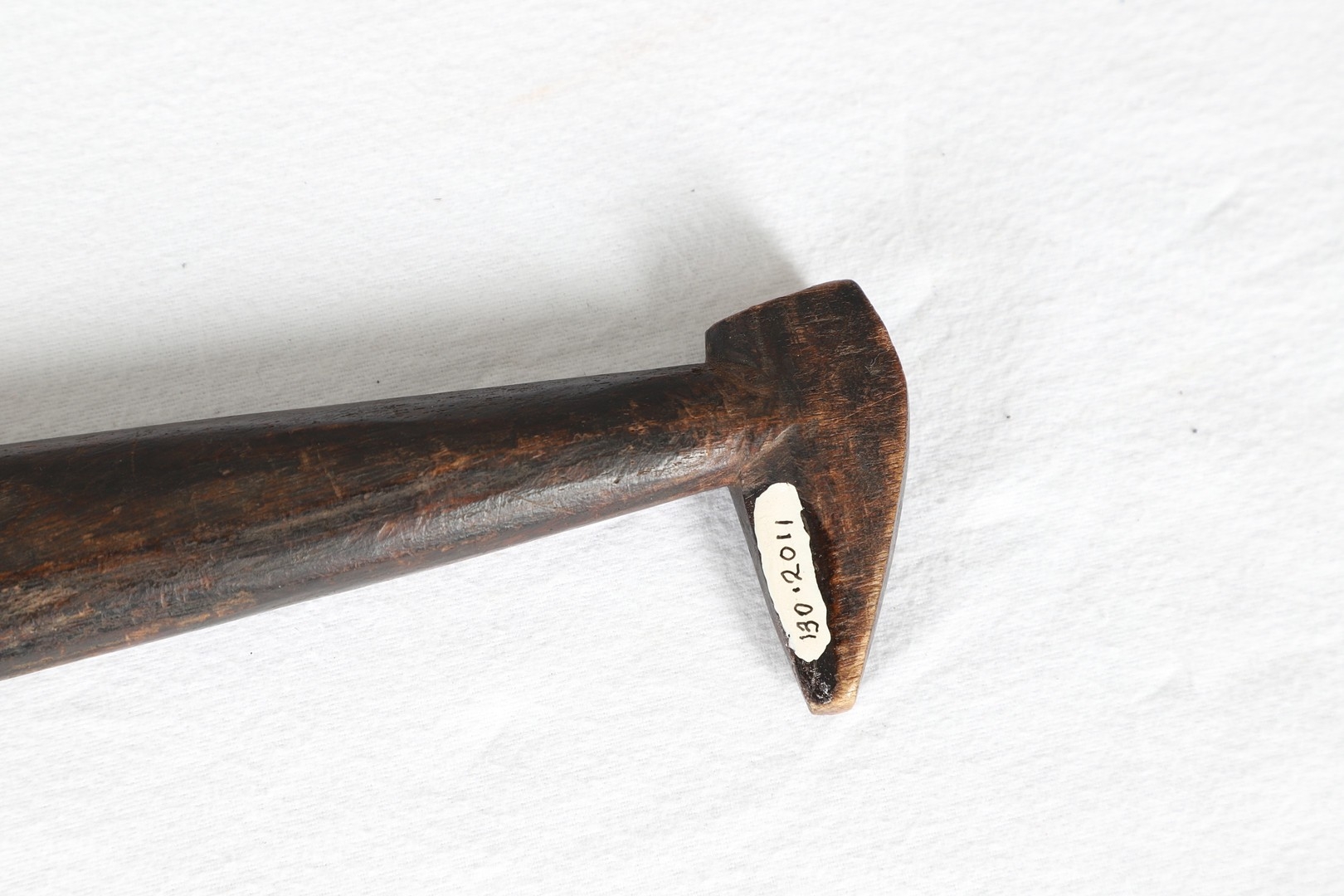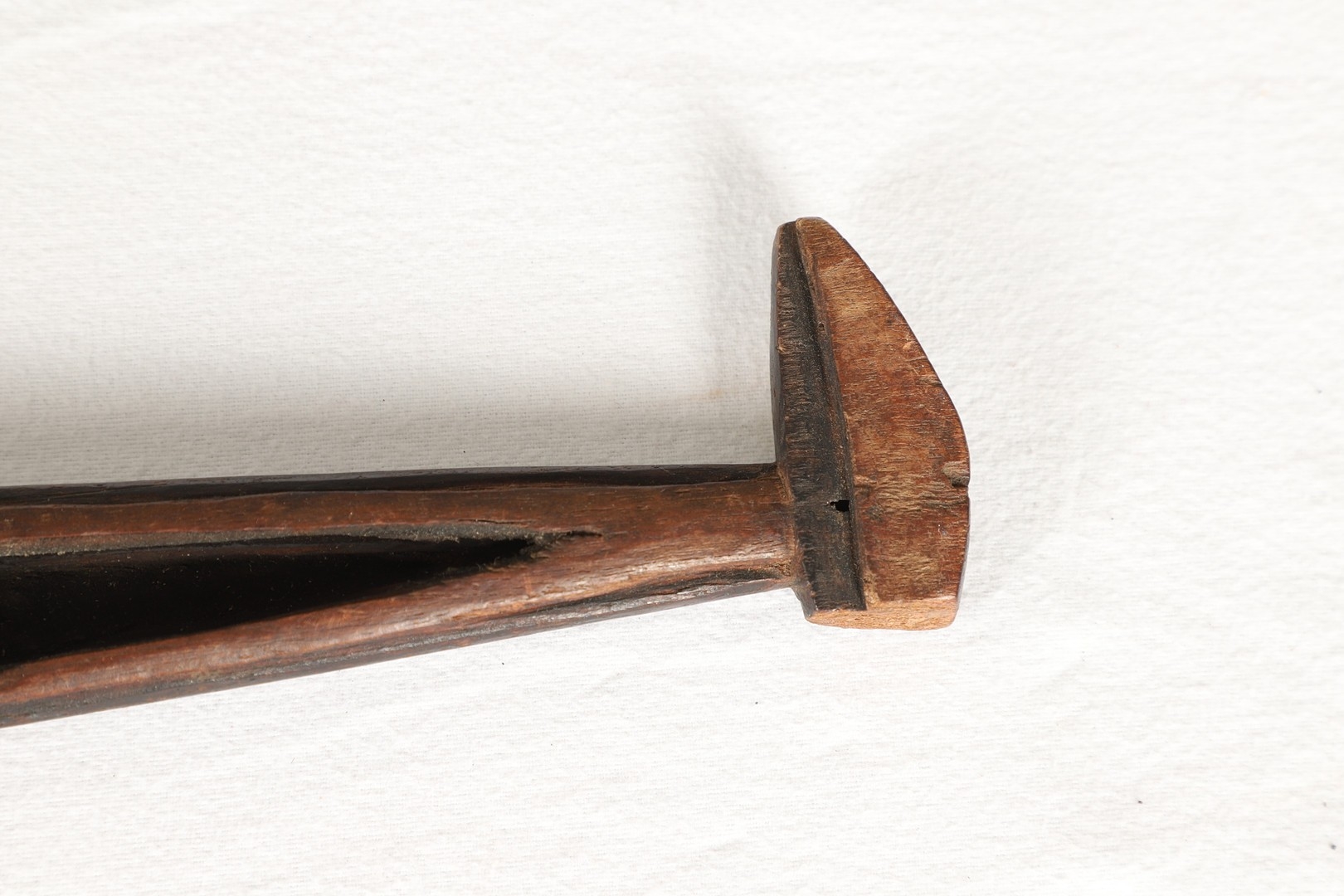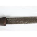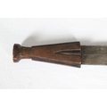 AN AMBO OR OVAMBO KNIFE AND SCABBARD, NORTHERN NAMIBIA. The 41 cm straight pointed blade with central spine and sharpened edges. On a slender wooden grip with circular flared pommel. In a matching scabbard with cut-away section and pierced holes for wear, with distinctive curved lower end. 57 cm.