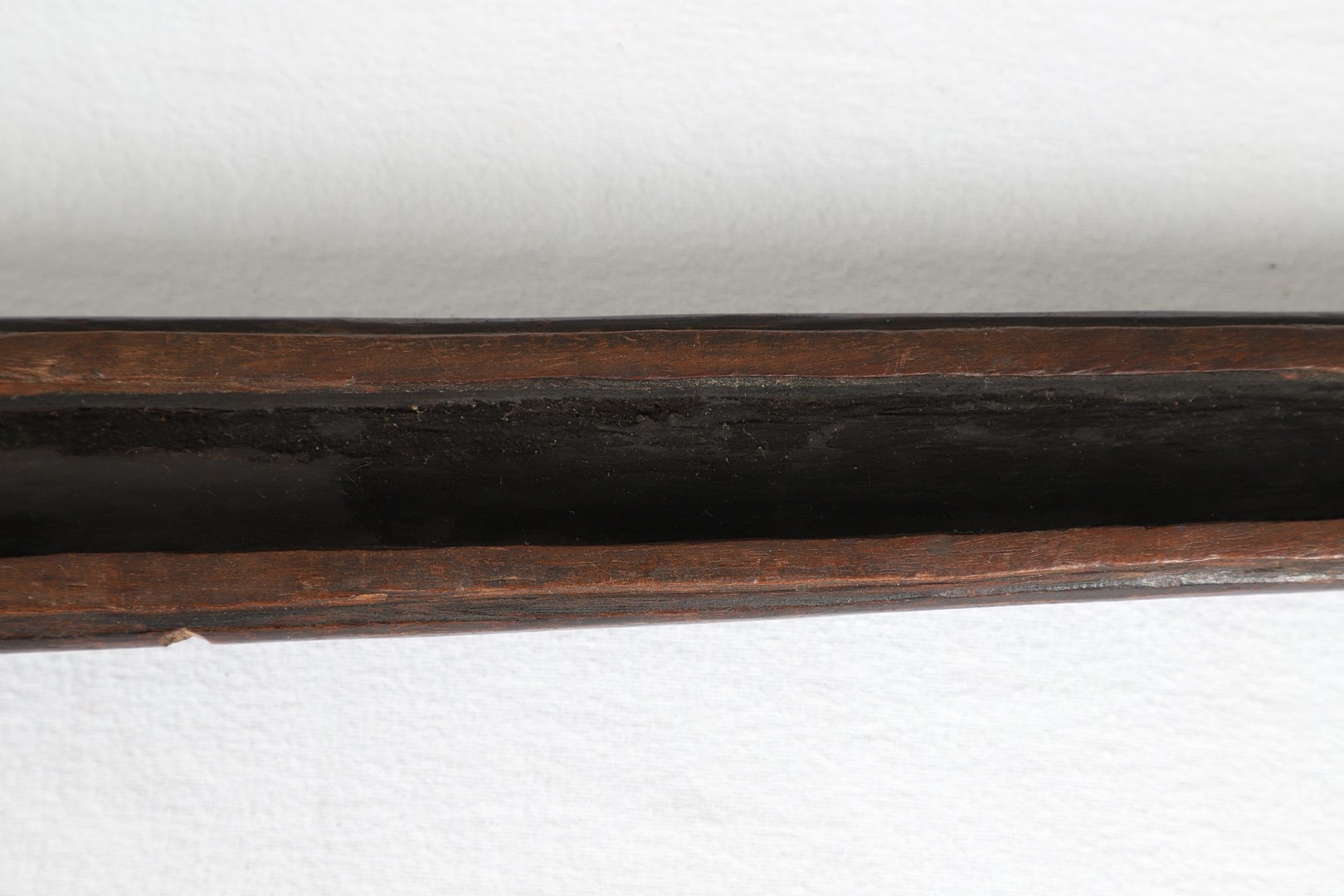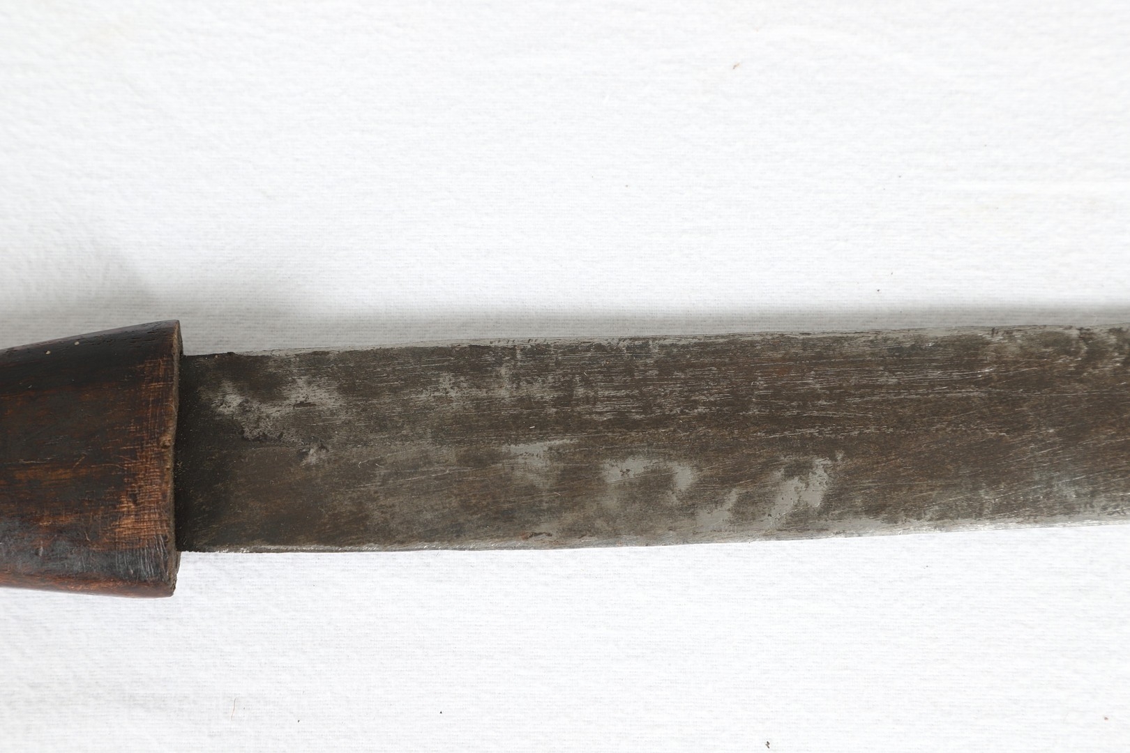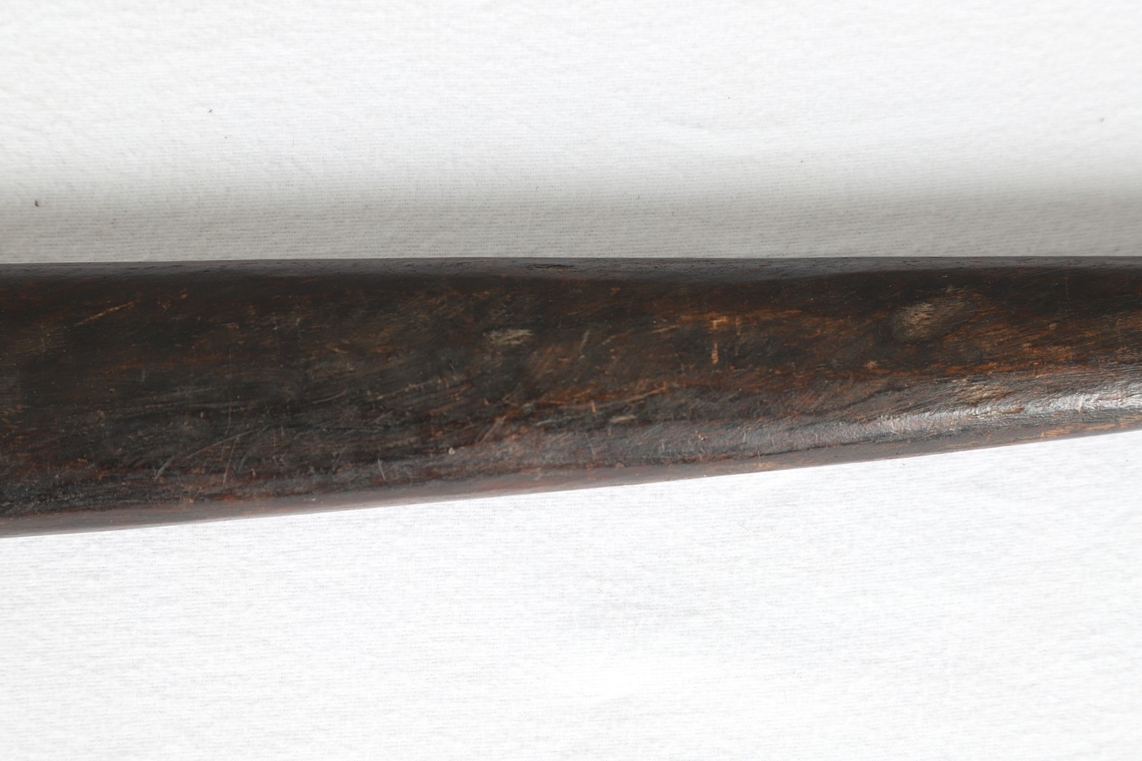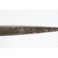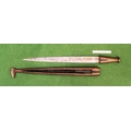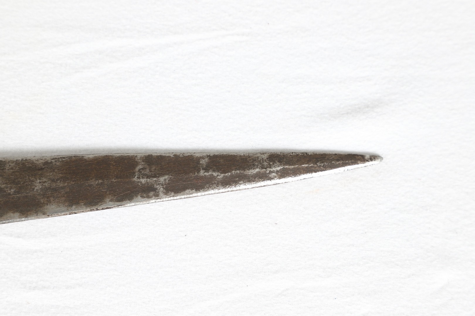 AN AMBO OR OVAMBO KNIFE AND SCABBARD, NORTHERN NAMIBIA. The 41 cm straight pointed blade with central spine and sharpened edges. On a slender wooden grip with circular flared pommel. In a matching scabbard with cut-away section and pierced holes for wear, with distinctive curved lower end. 57 cm.