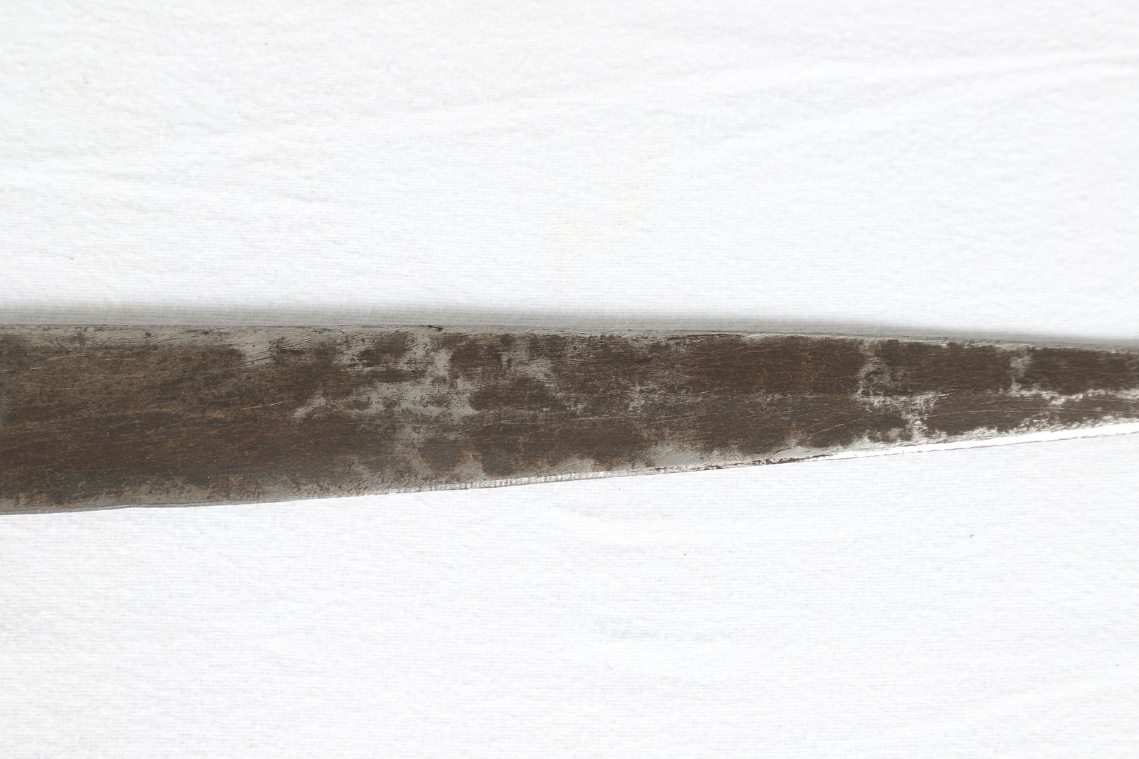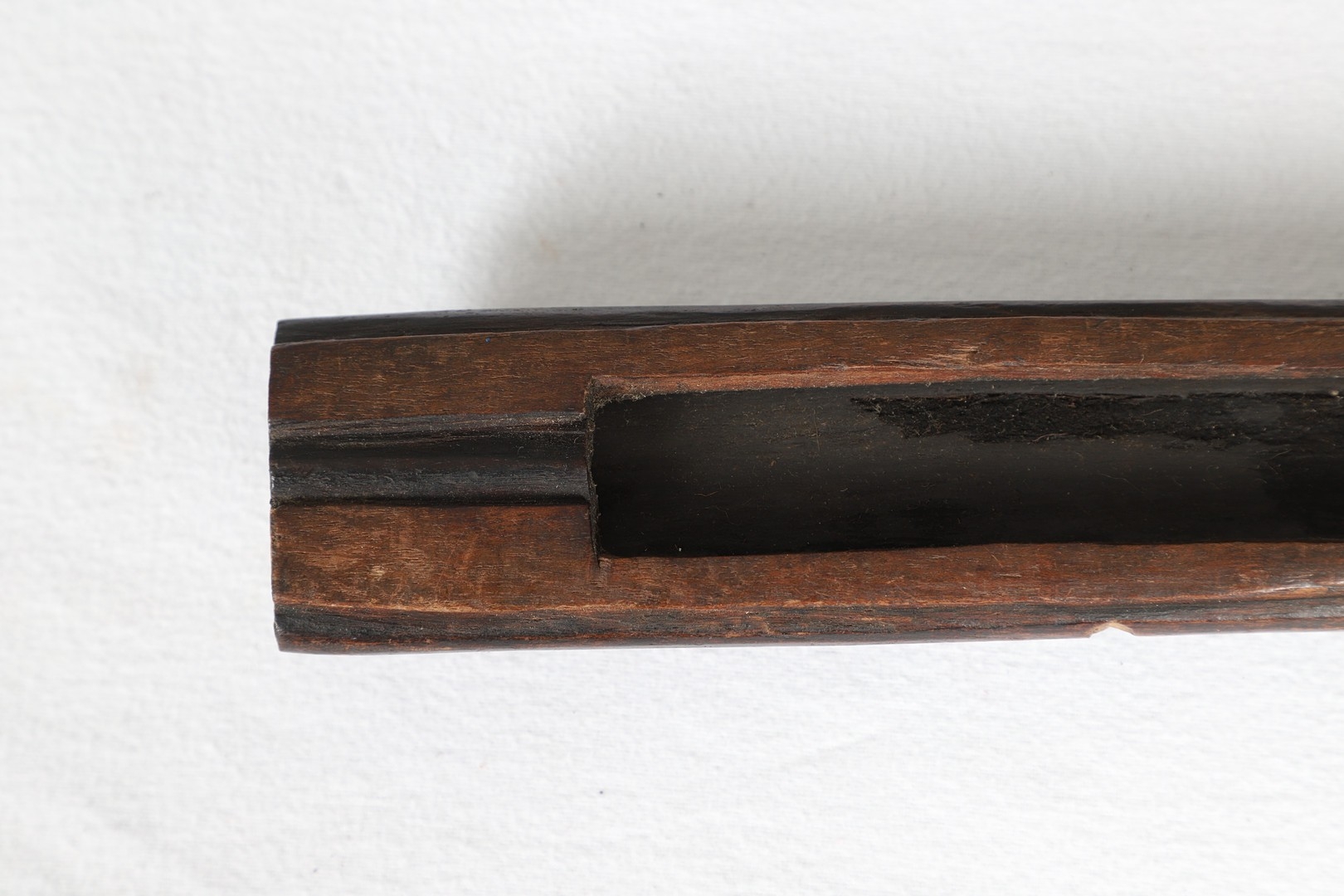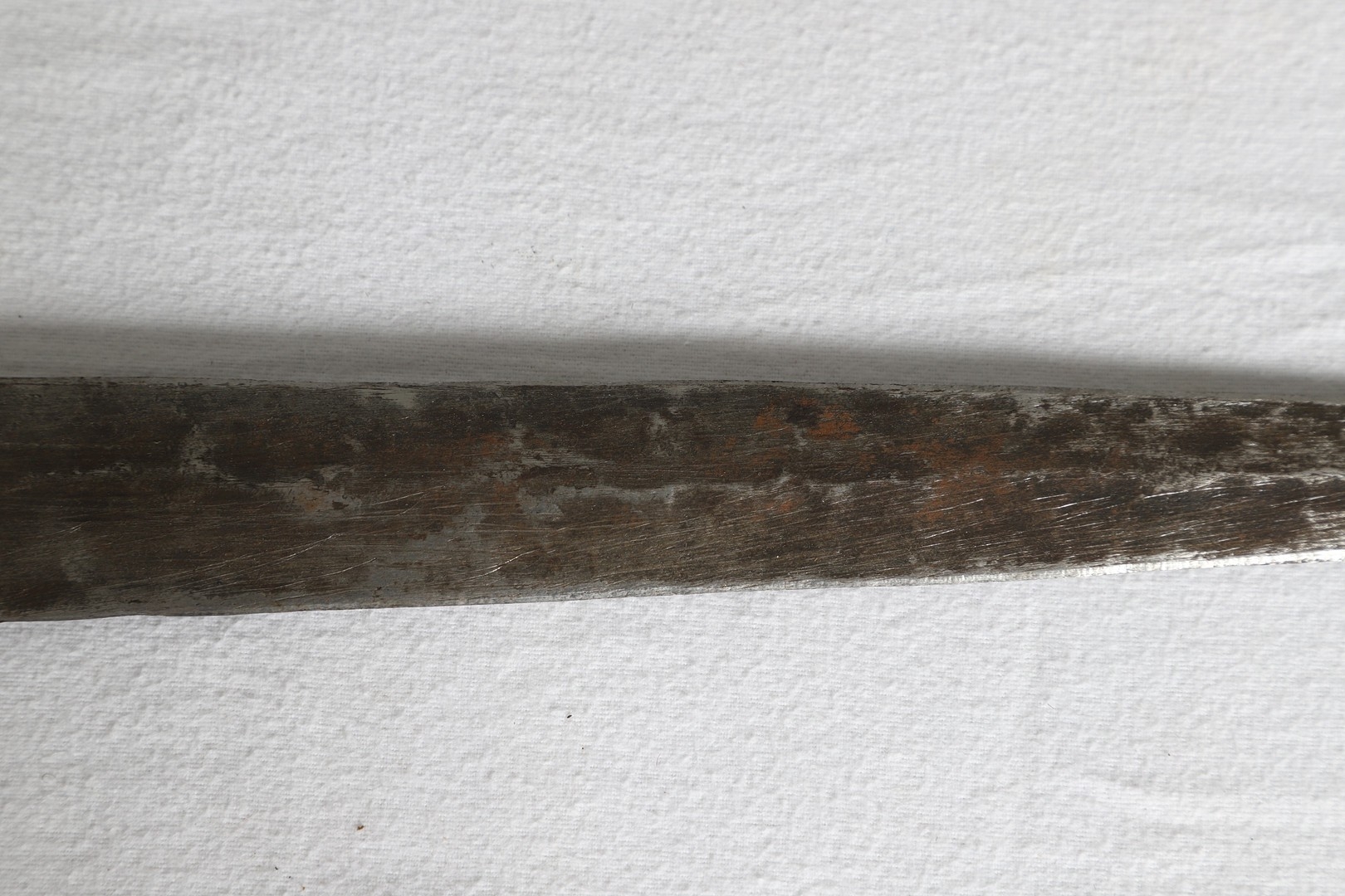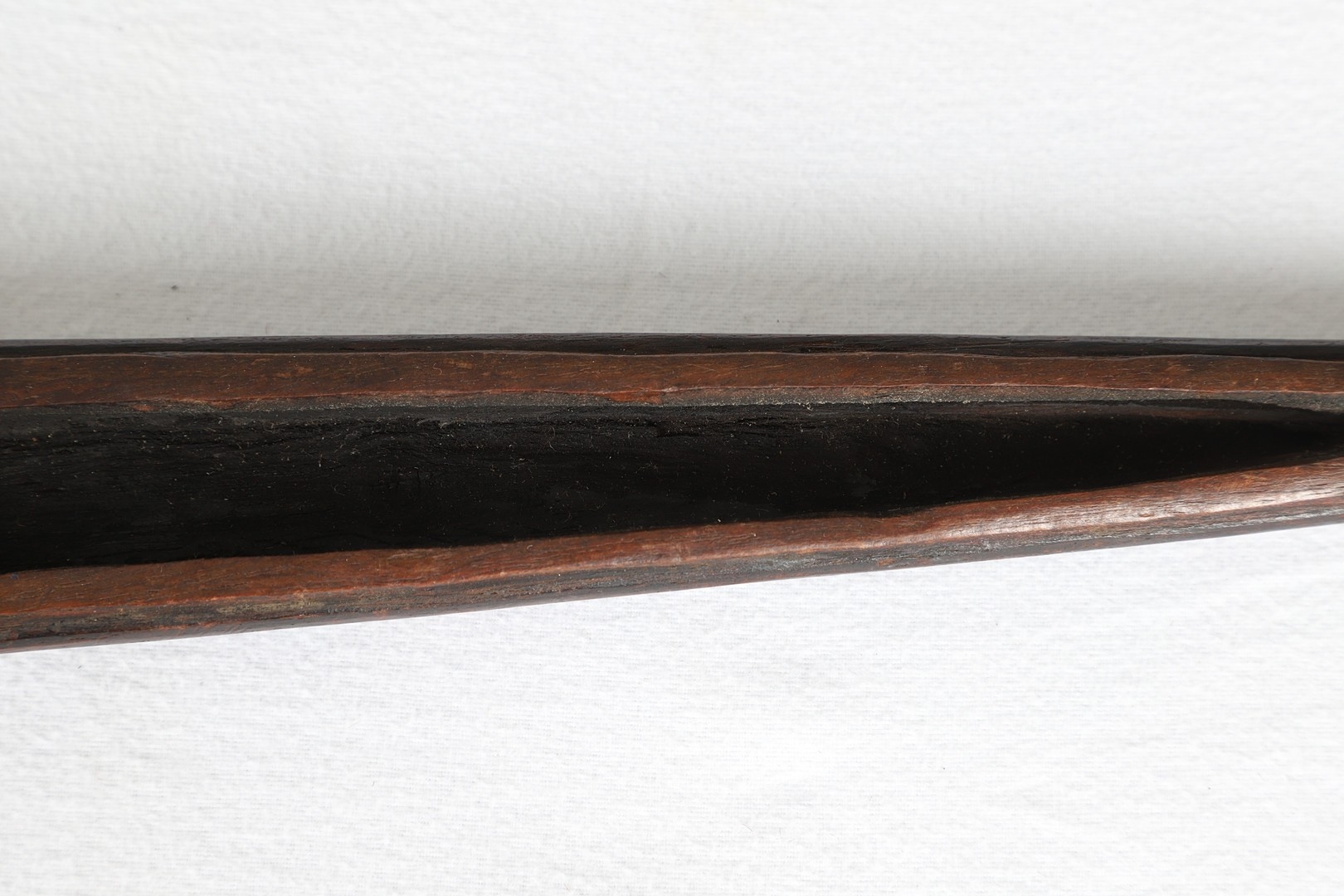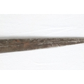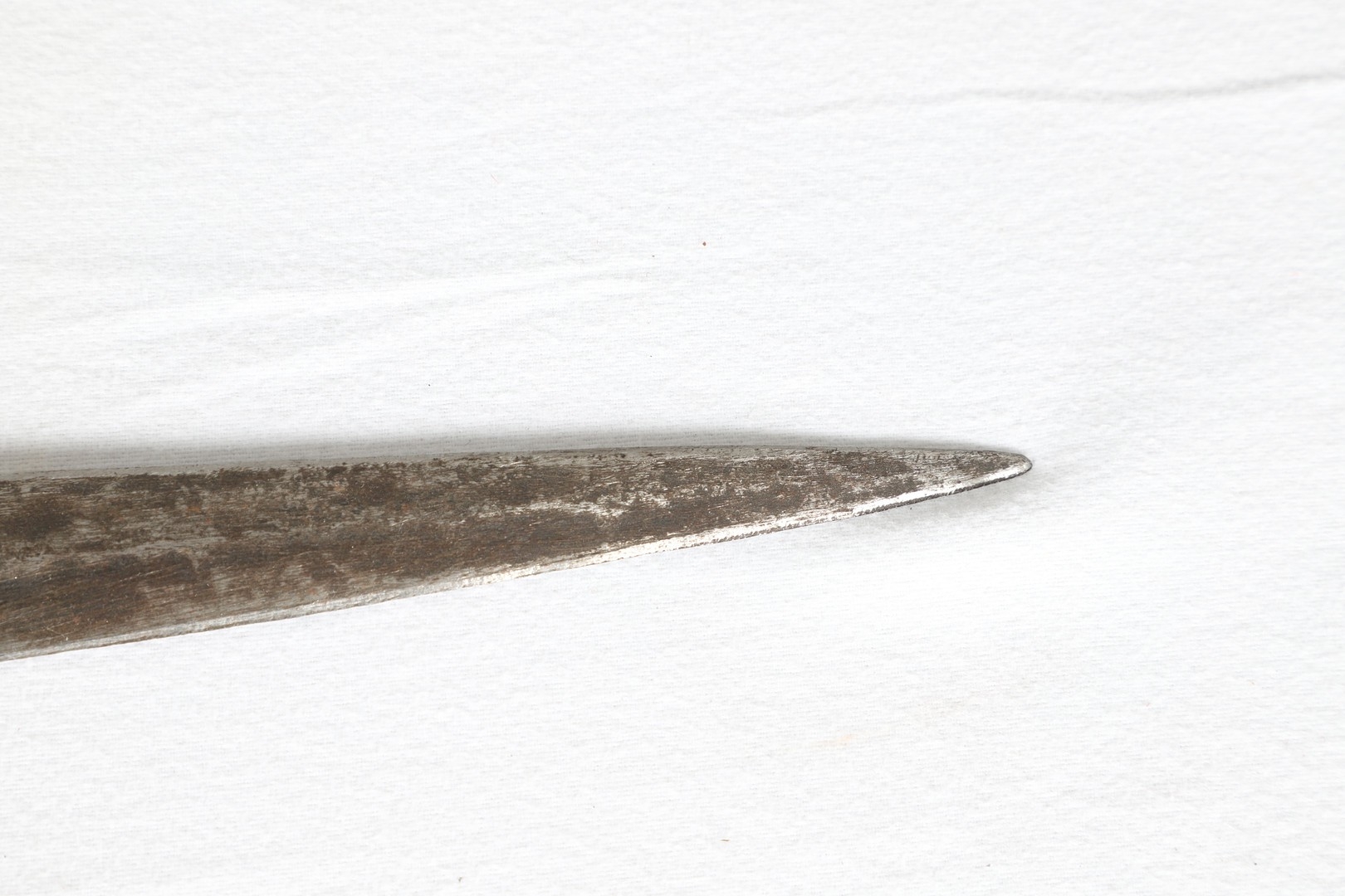 AN AMBO OR OVAMBO KNIFE AND SCABBARD, NORTHERN NAMIBIA. The 41 cm straight pointed blade with central spine and sharpened edges. On a slender wooden grip with circular flared pommel. In a matching scabbard with cut-away section and pierced holes for wear, with distinctive curved lower end. 57 cm.