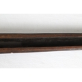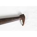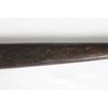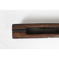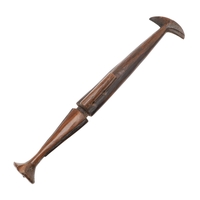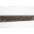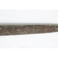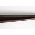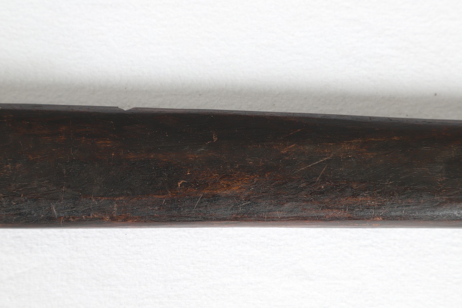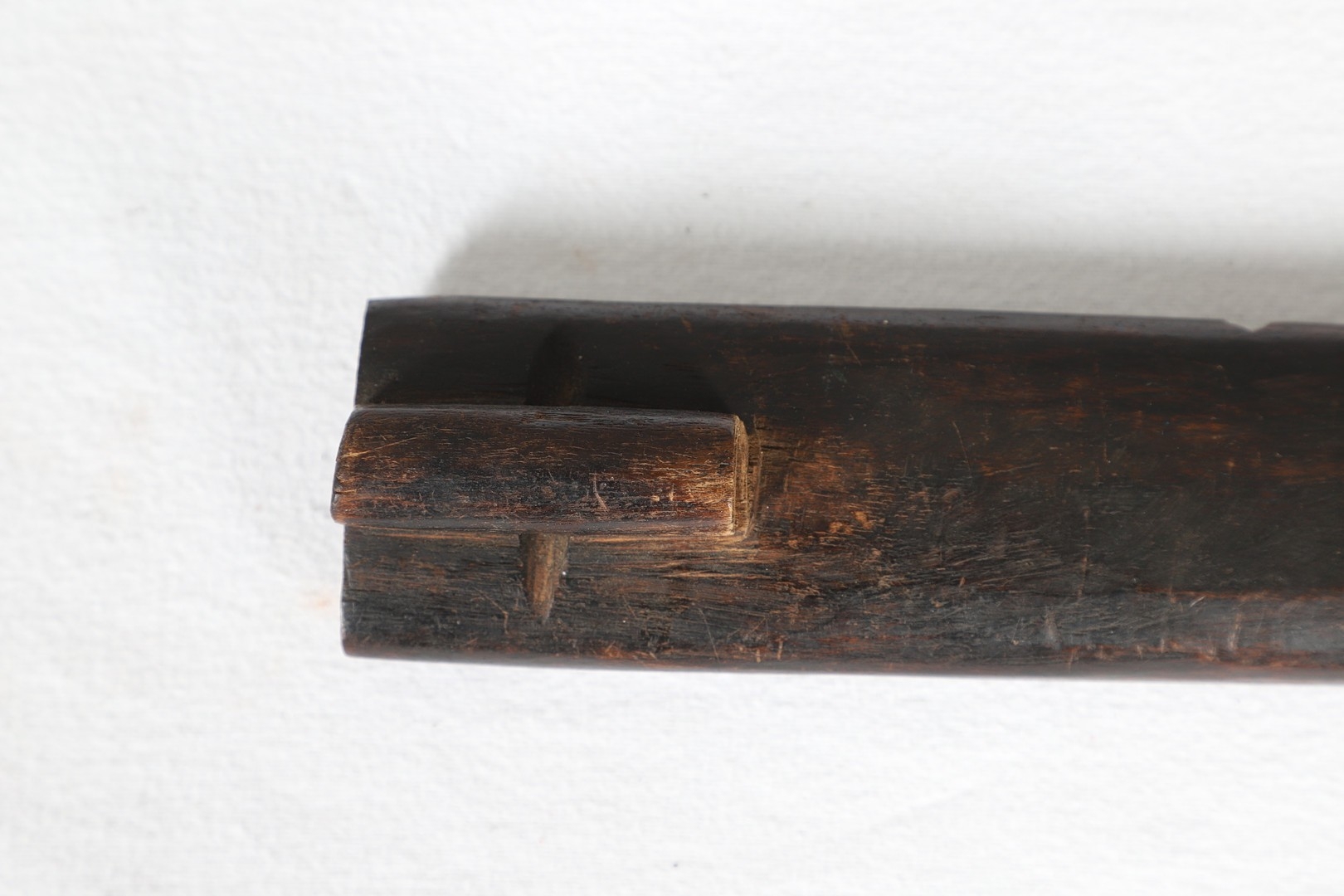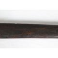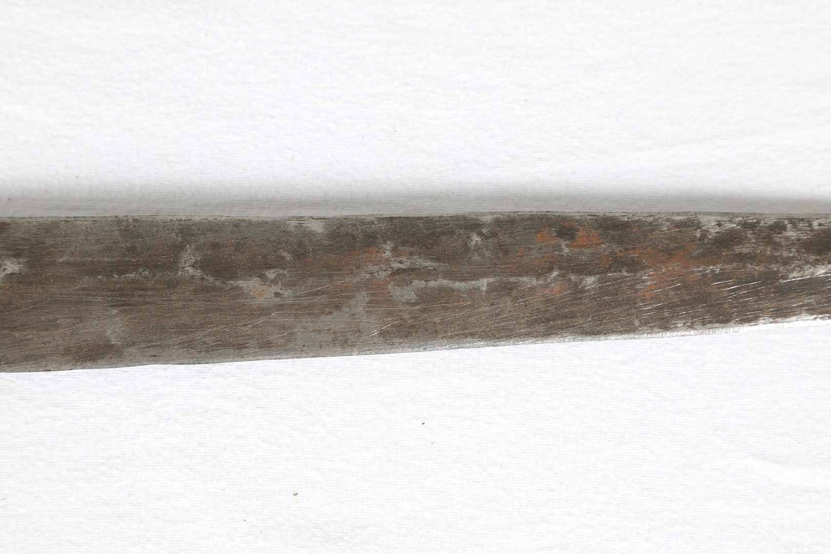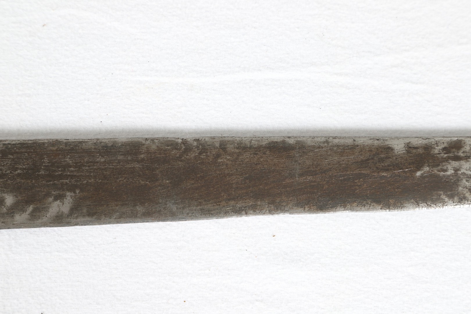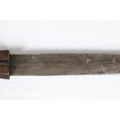AN AMBO OR OVAMBO KNIFE AND SCABBARD, NORTHERN NAMIBIA. The 41 cm straight pointed blade with central spine and sharpened edges. On a slender wooden grip with circular flared pommel. In a matching scabbard with cut-away section and pierced holes for wear, with distinctive curved lower end. 57 cm.