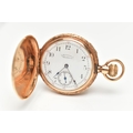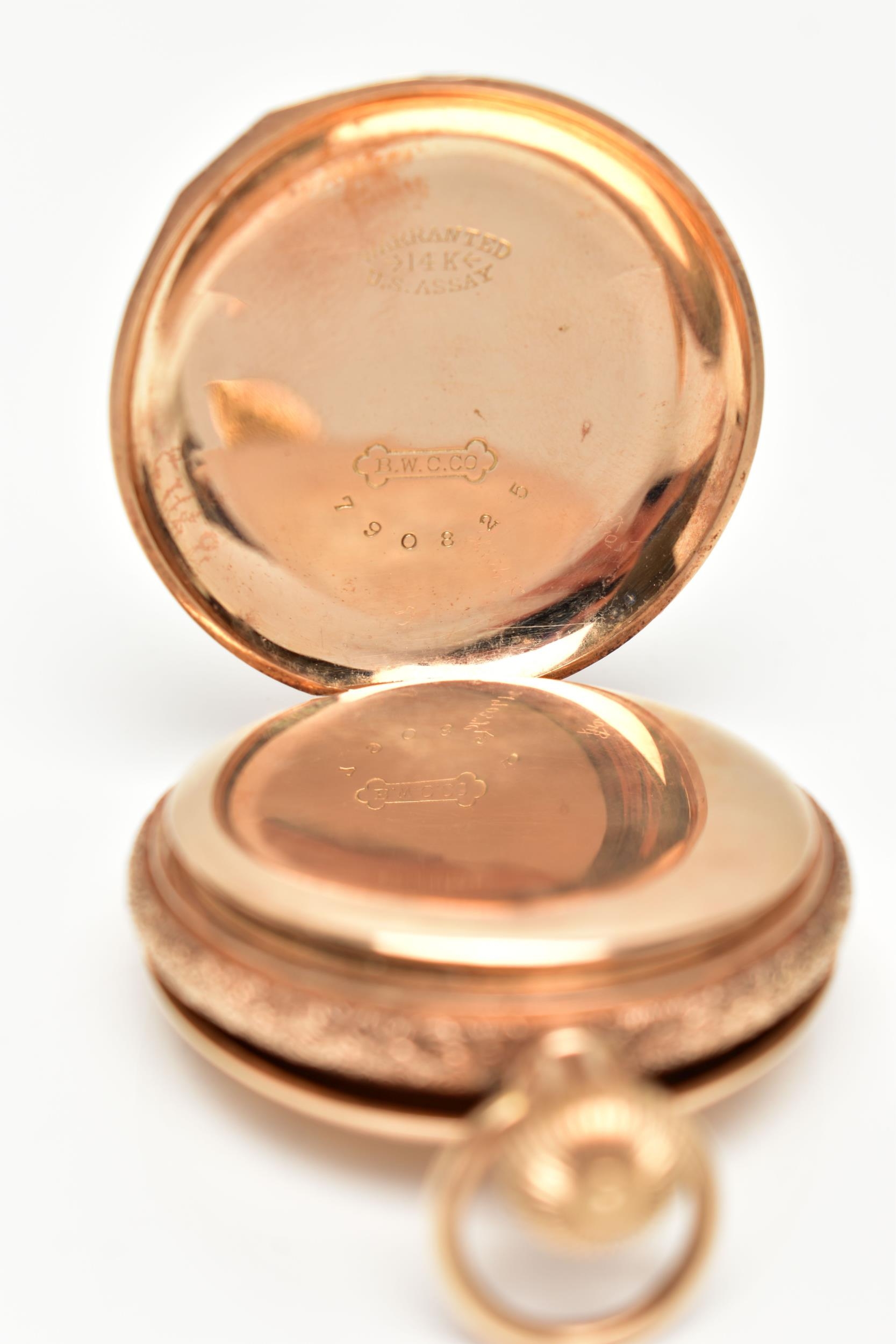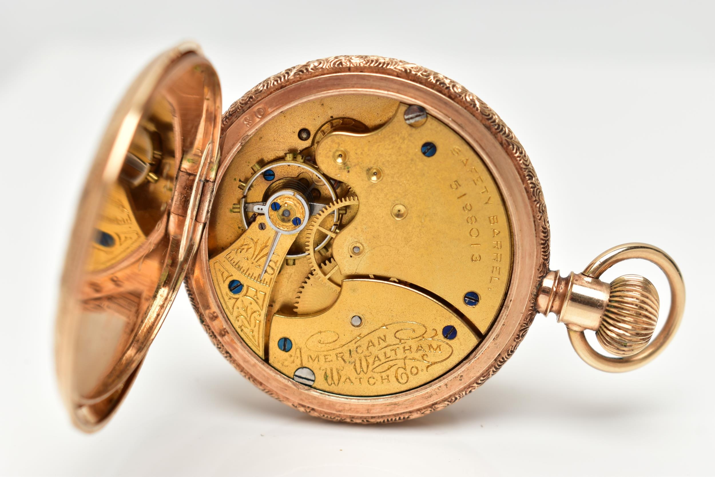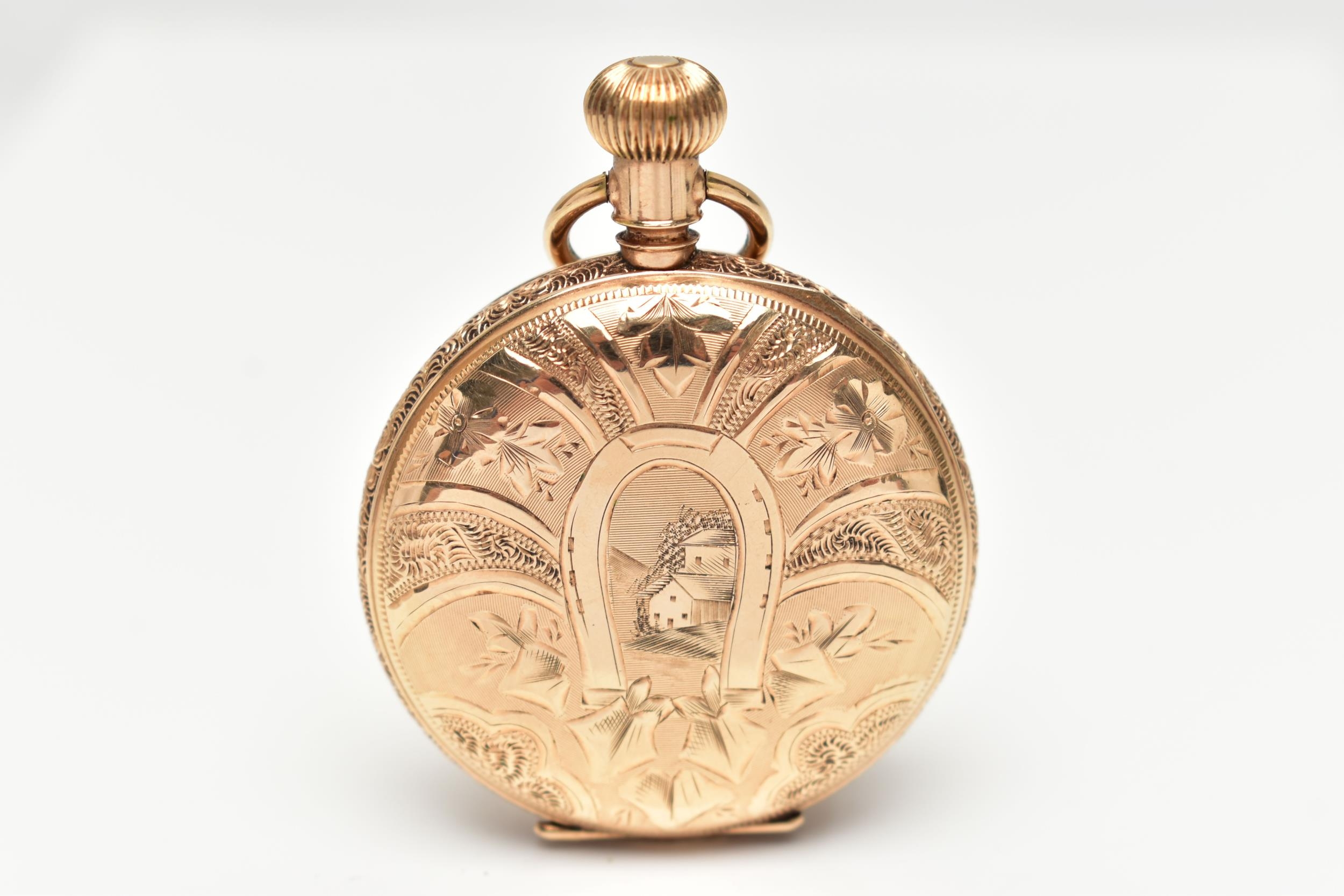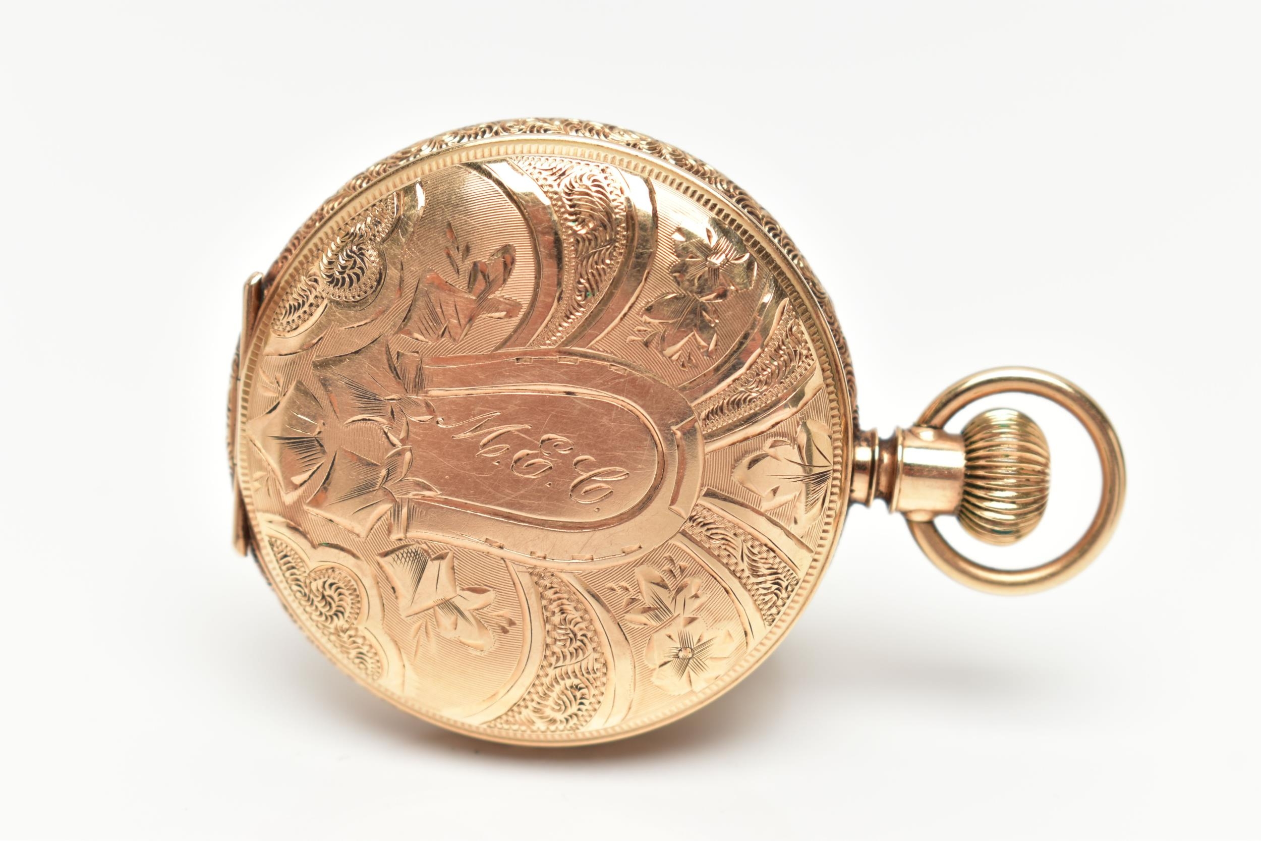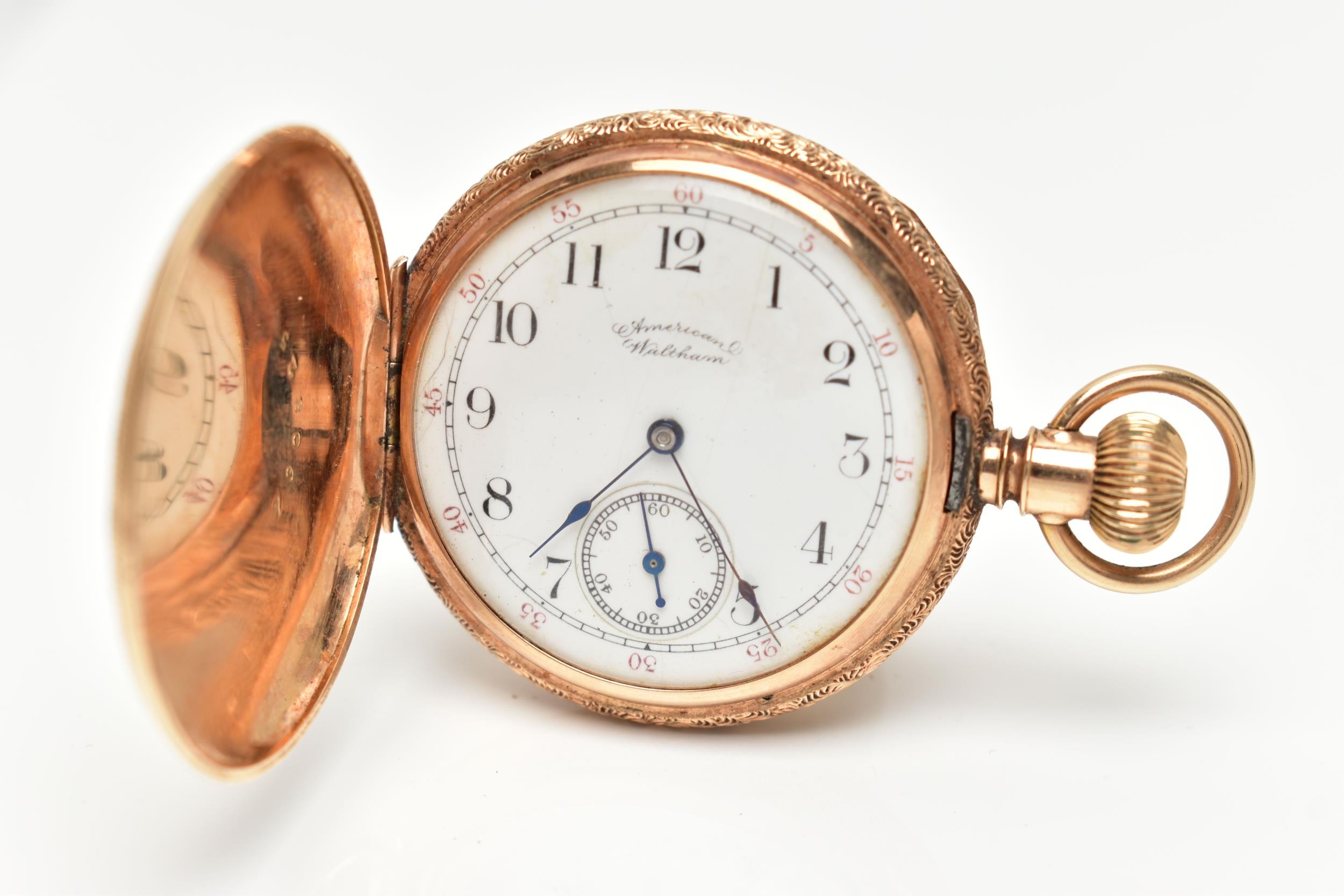 A FULL HUNTER POCKET WATCH, hand wound movement, white dial signed 'American Waltham', Arabic numerals, subsidiary seconds dial at the six o'clock position, yellow metal case, approximate case width 40mm, outer case detailed with floral, foliage and landscape engraving, monogram engraved cartouche, inside case back signed 'Warranted 14k U.S. Assay' 'B.W.C.Co' movement numbered 5198013, approximate gross weight 51.4 grams (condition report: general light wear, currently working at the time of cataloguing, time keeping not tested)