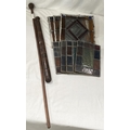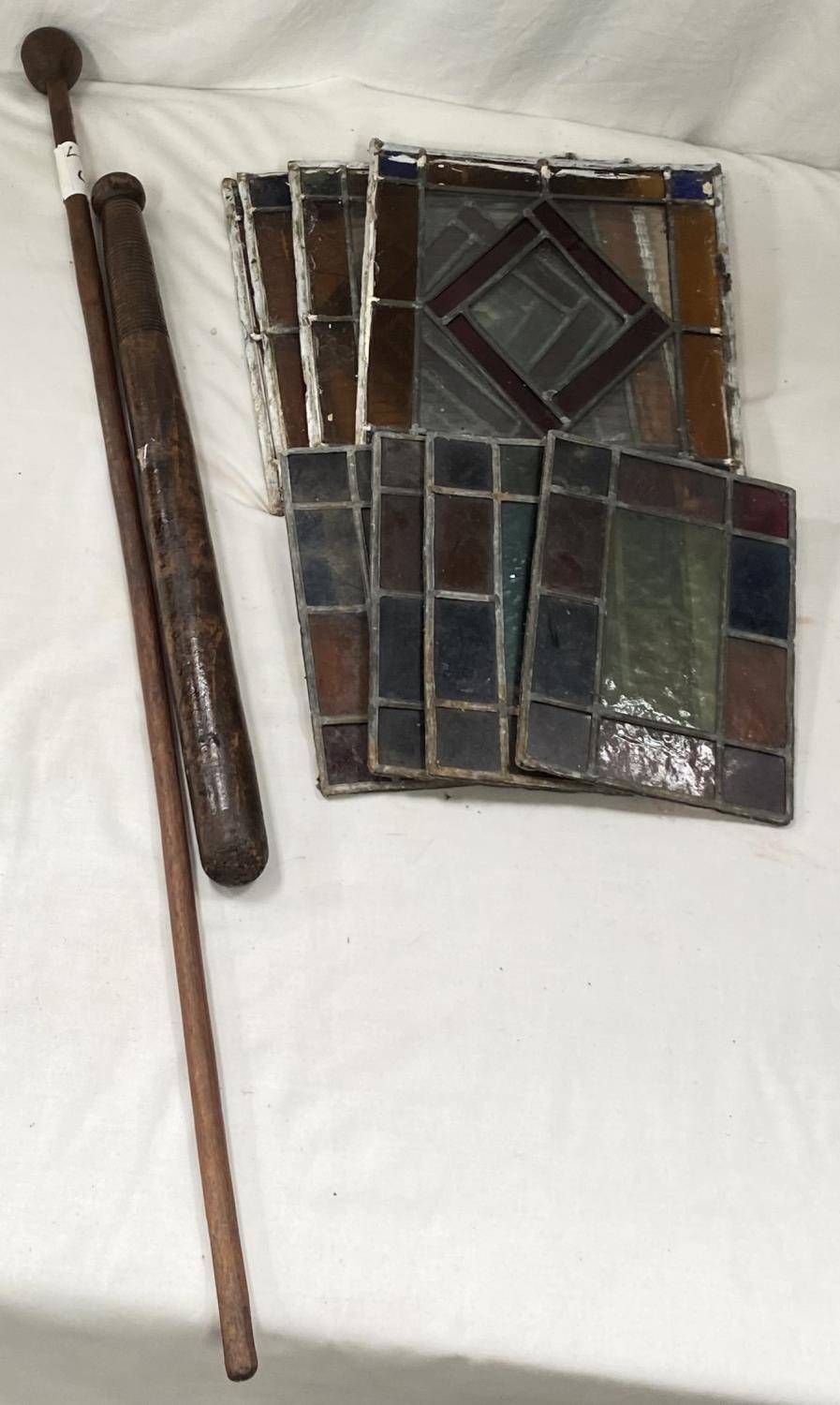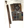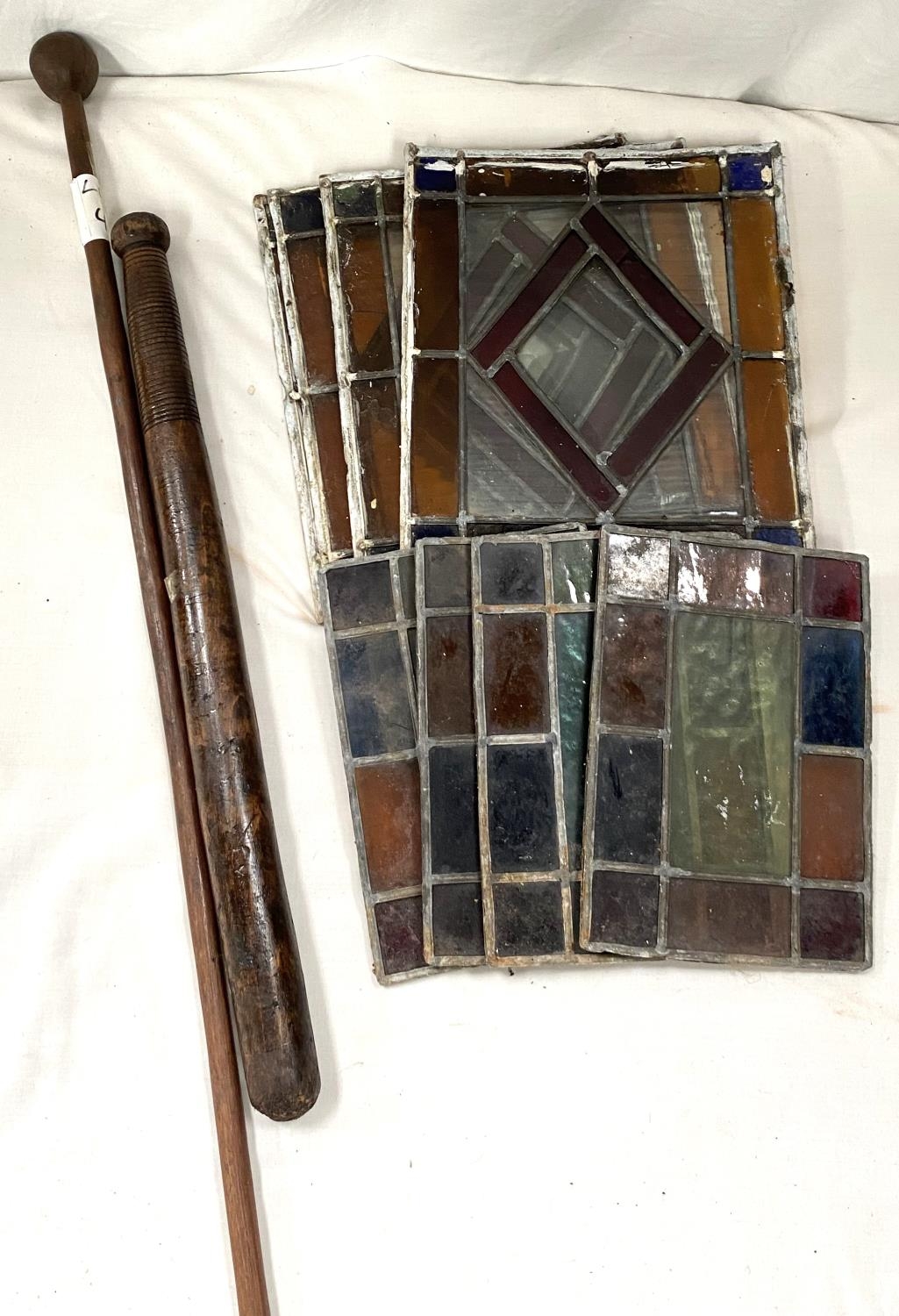 A wooden truncheon; stained glass panels etc.