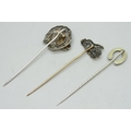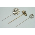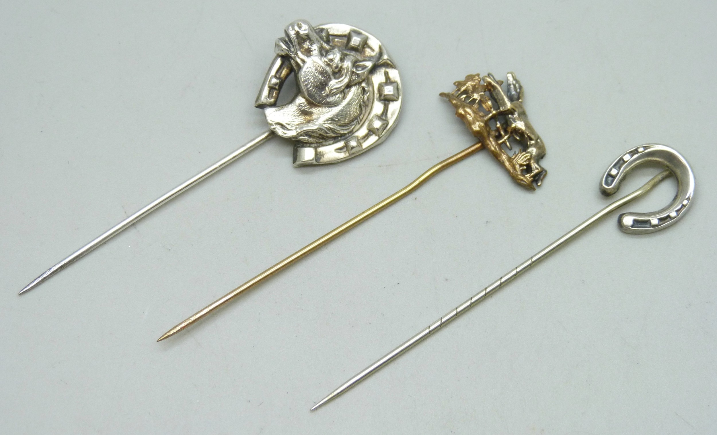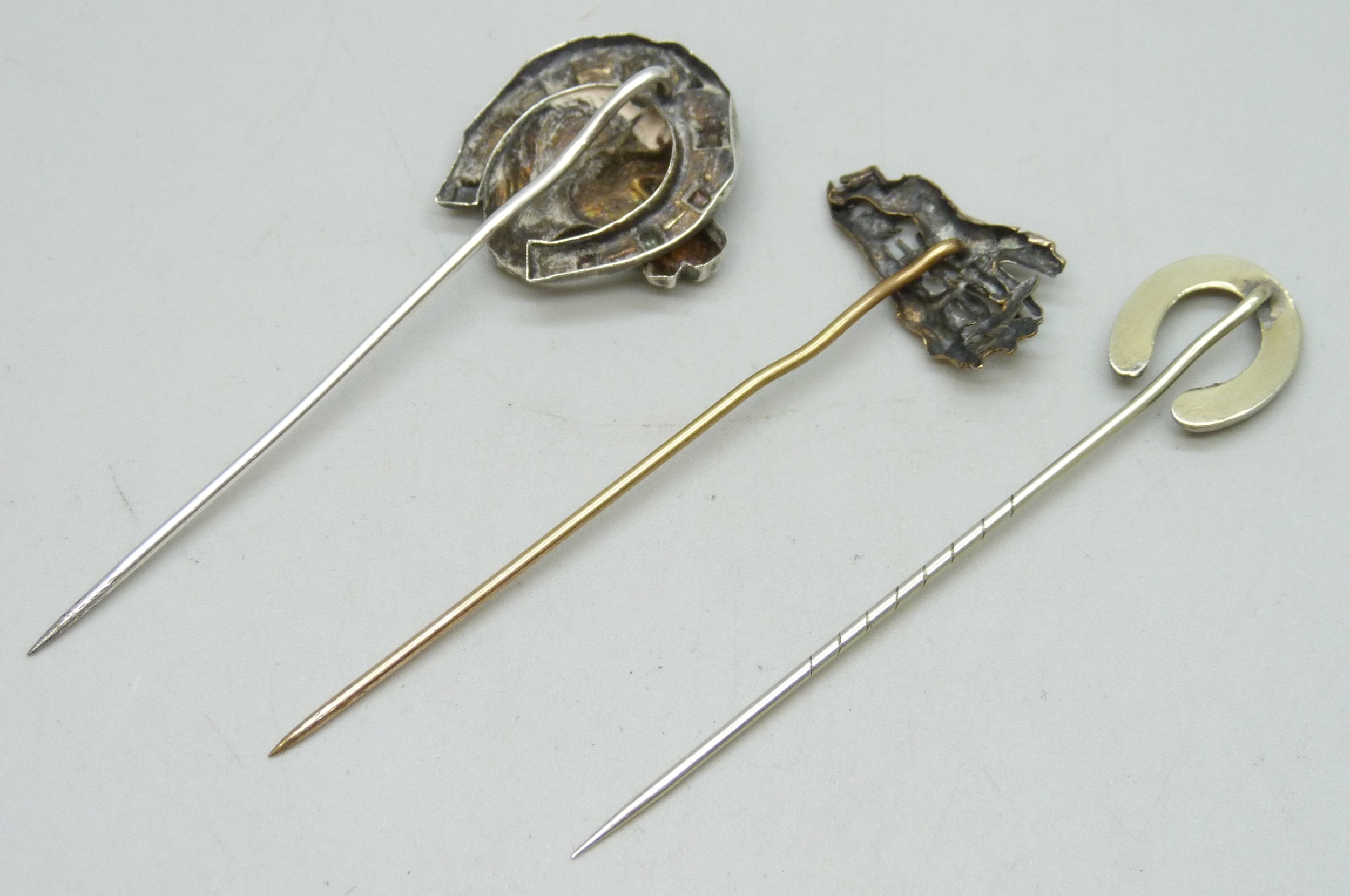 Three unmarked horse and horseshoe design stick pins