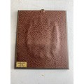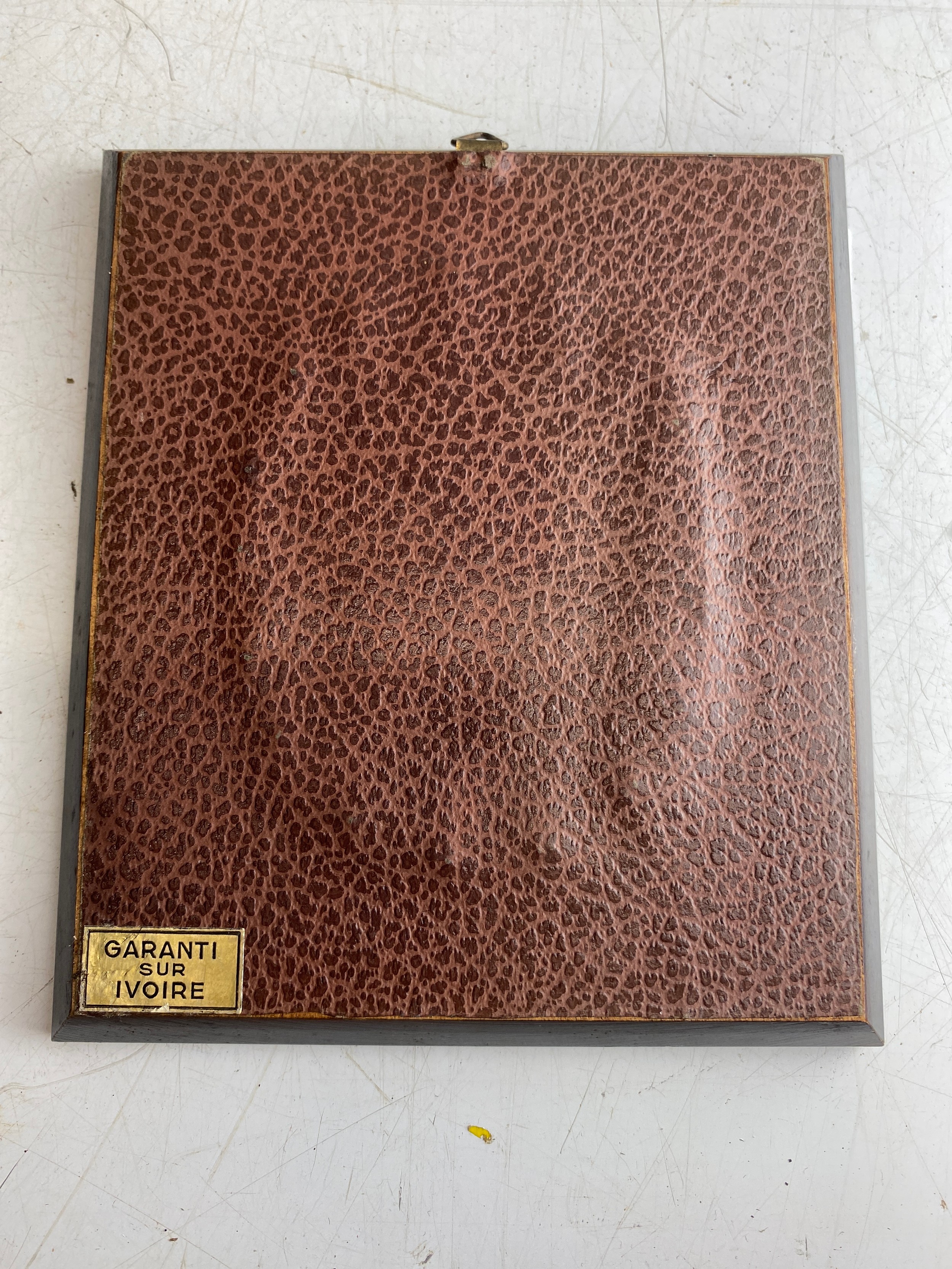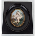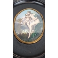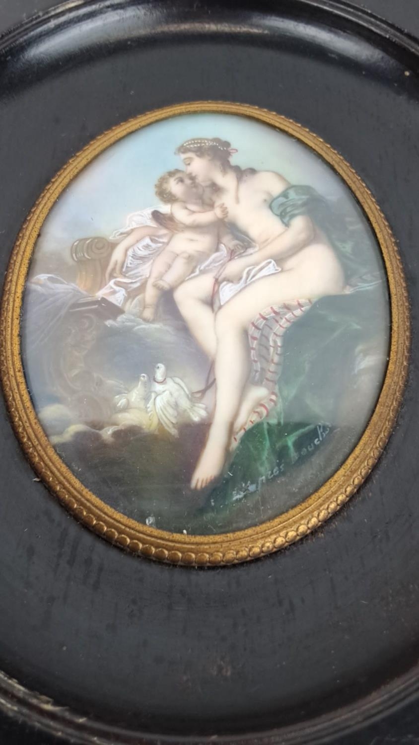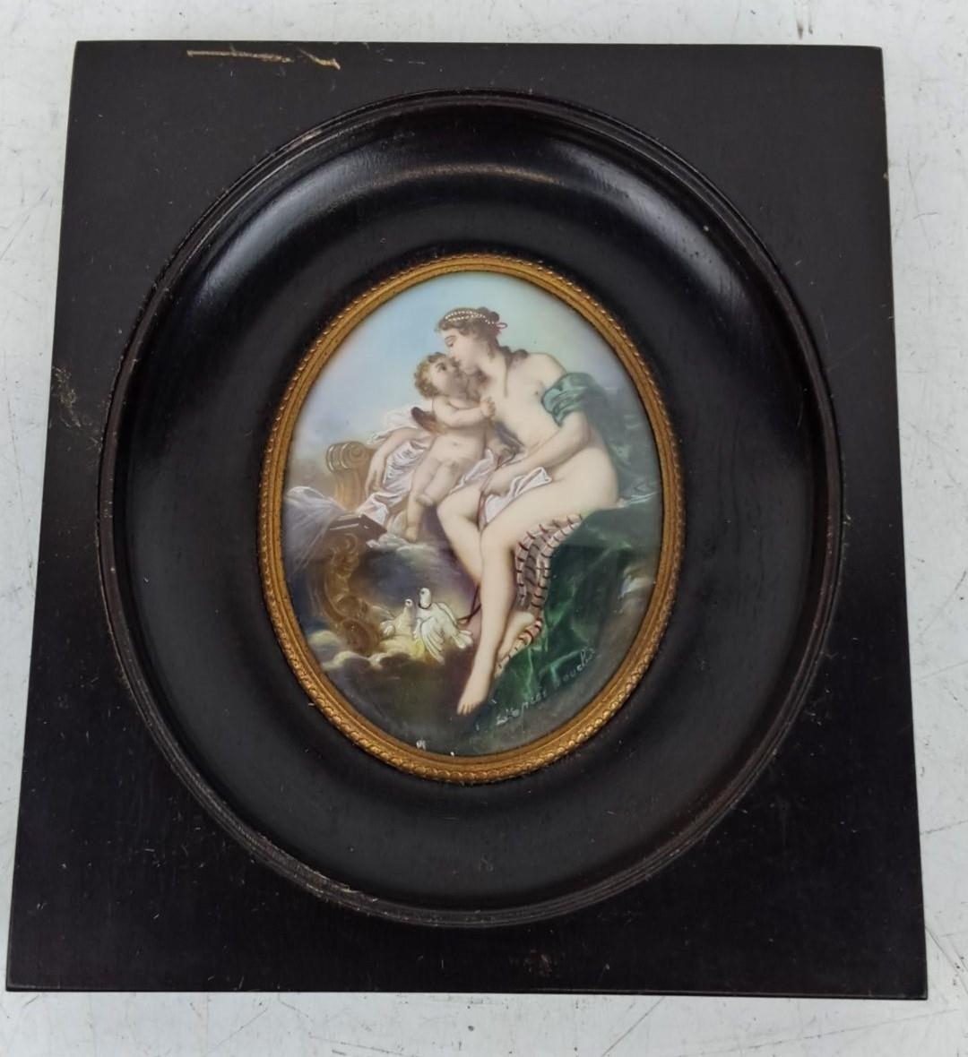 Antique Oval hand-painted porcelain plaque depicting a classical scene of a mother and child, set in a black wood frame with gold trim. Signed by the artist, 14cm x 16cm.