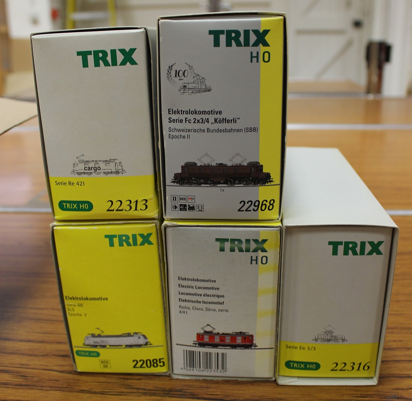 Trix. Range of HO gauge locomotives, generally excellent to near mint in excellent to near mint boxes, with 22085, 22313, 22316, 22353 and 22968. Qty 5 (½B)