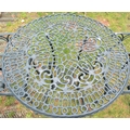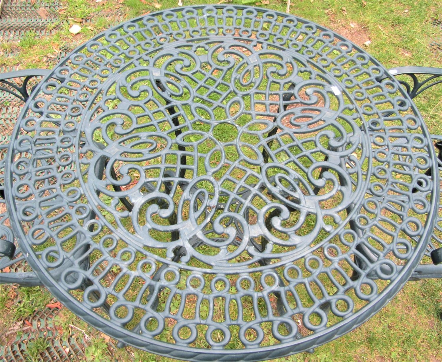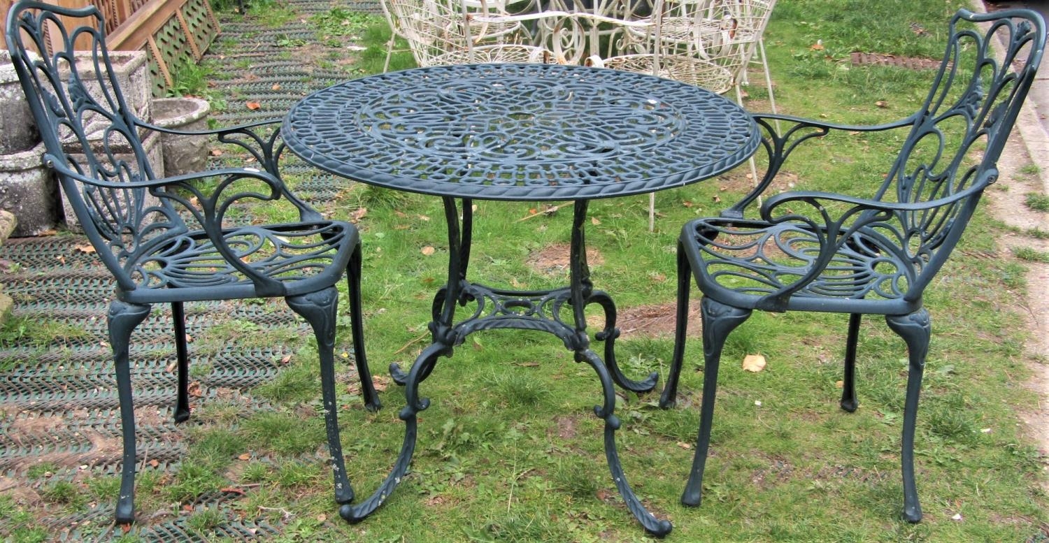 A contemporary green painted cast aluminium three piece garden terrace set comprising a table with decorative circular pierced top, raised on swept supports, together with a pair of matching open armchairs, the table 86cm diameter
